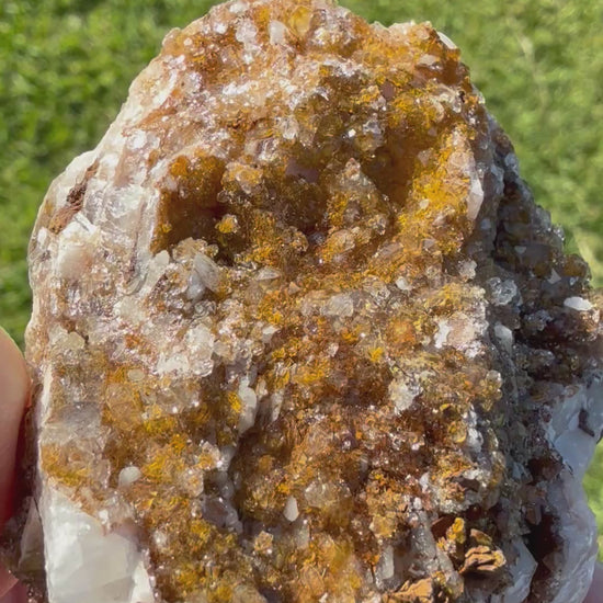 This breathtaking piece features golden-brown druzy crystals shimmering across a quartz base with gorgeous light-reflective sparkle. The manganese content gives it that deep, metallic honey tone, while the quartz adds translucency and structure — a beautiful balance of earthy grounding and crystalline radiance.