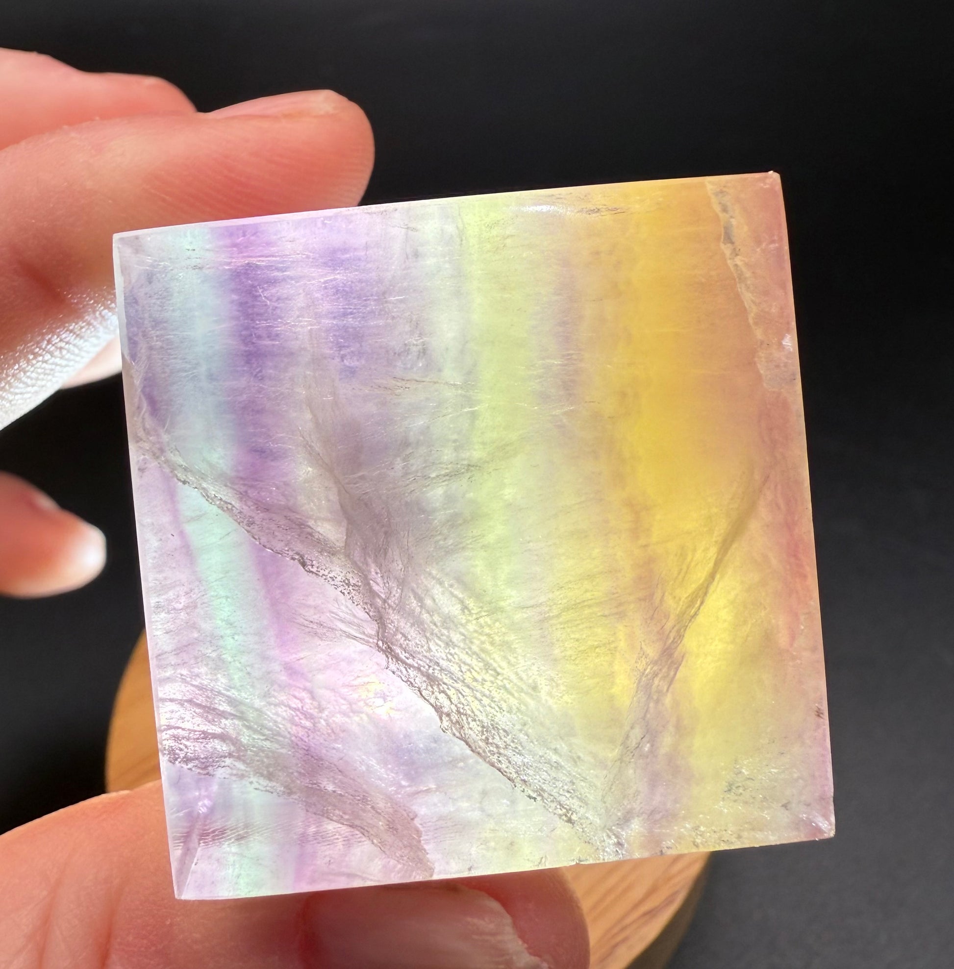 This Candy Fluorite cube is a rainbow dream! Featuring soft pastel bands of purple, yellow, pink, and green, it glows beautifully when placed on a light base โ almost like a piece of crystal candy. Smaller than the other cube, but just as vibrant and magical.