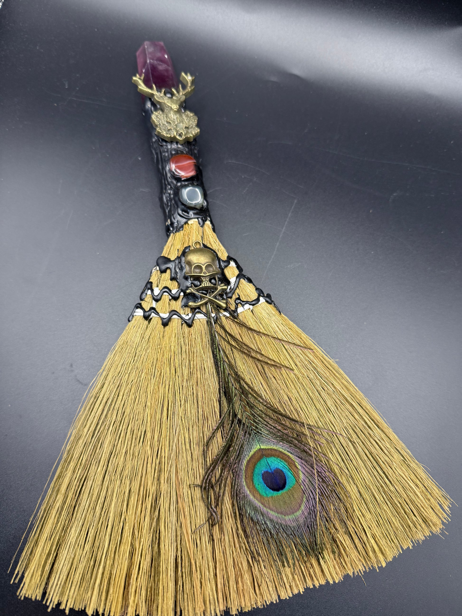 A unique altar broom featuring a purple fluorite point ππ. Perfect for smudging, cleansing your sacred space, and clearing negative energy π―οΈβ¨. Ideal for meditation, rituals, or as a decorative crystal piece π‘π«. The purple fluorite enhances spiritual awareness and mental clarity while adding a beautiful, mystical touch.