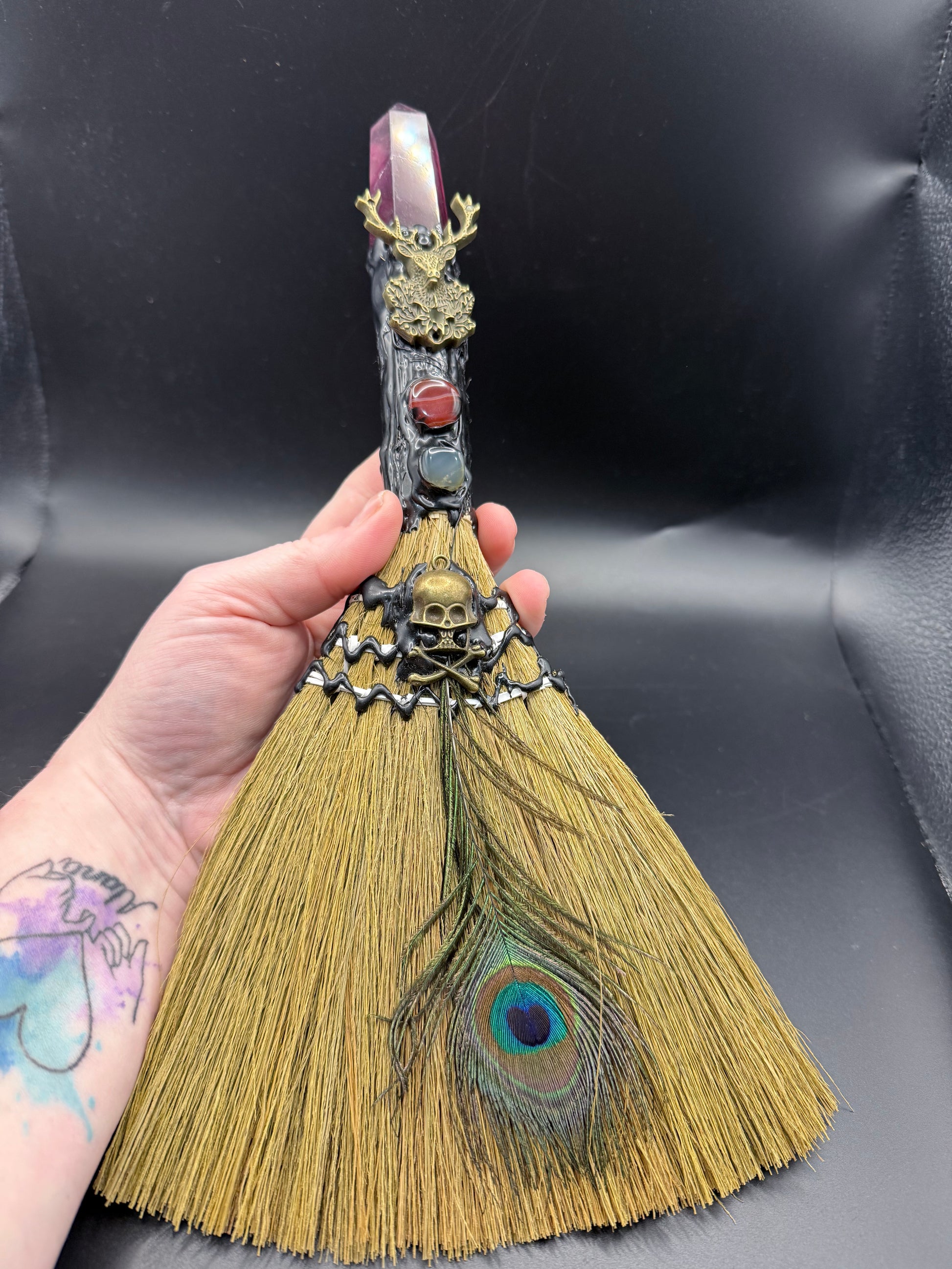 A unique altar broom featuring a purple fluorite point ππ. Perfect for smudging, cleansing your sacred space, and clearing negative energy π―οΈβ¨. Ideal for meditation, rituals, or as a decorative crystal piece π‘π«. The purple fluorite enhances spiritual awareness and mental clarity while adding a beautiful, mystical touch.