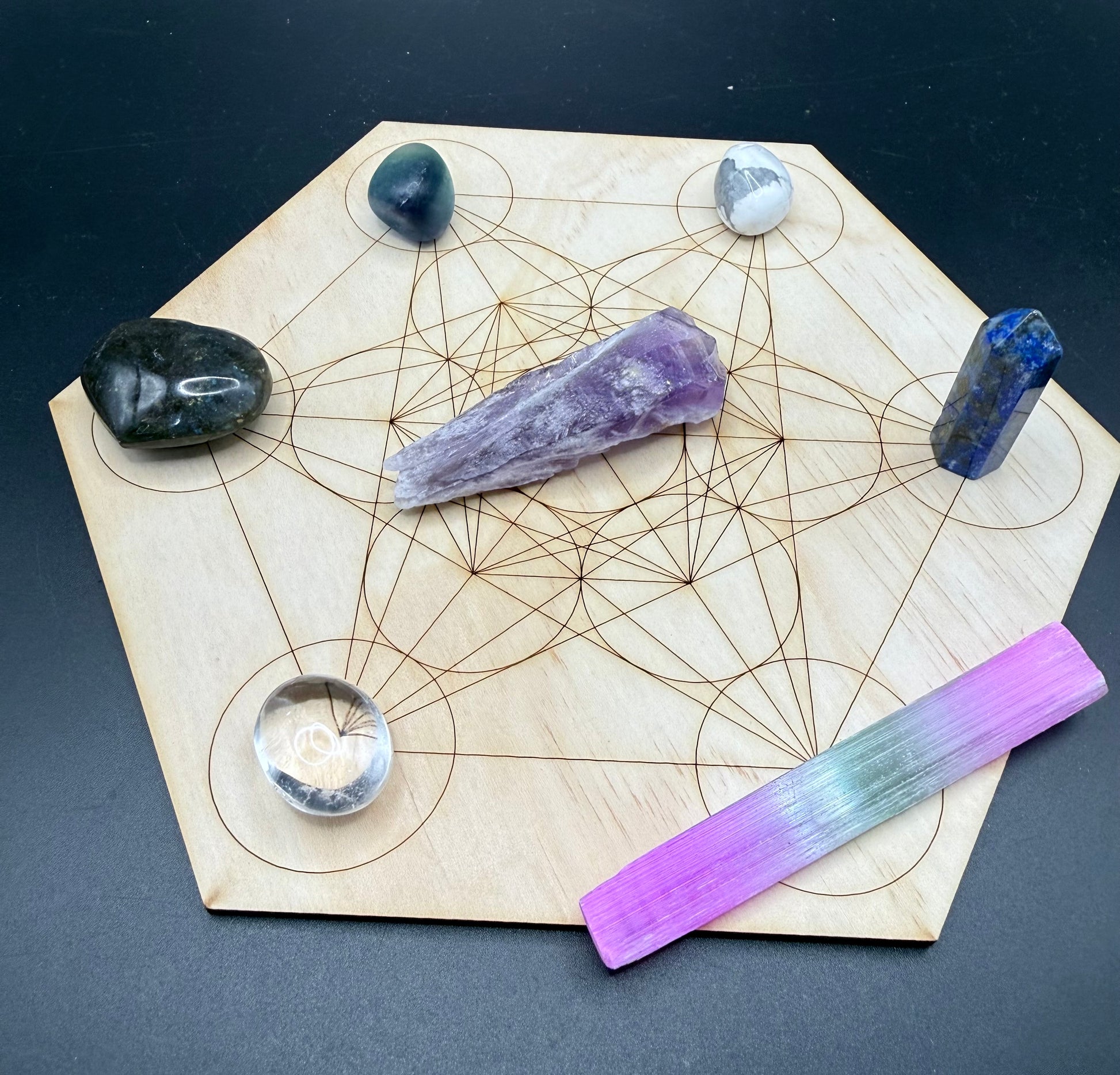 This 20cm wooden Metatronโs Cube grid is designed to help you align with higher wisdom, spiritual awakening, and universal energy flow. Each handpicked crystal has been intuitively chosen to amplify spiritual connection, inner guidance, and protection.