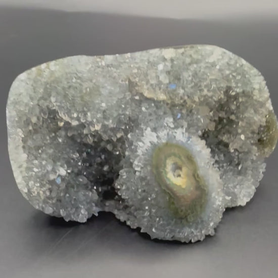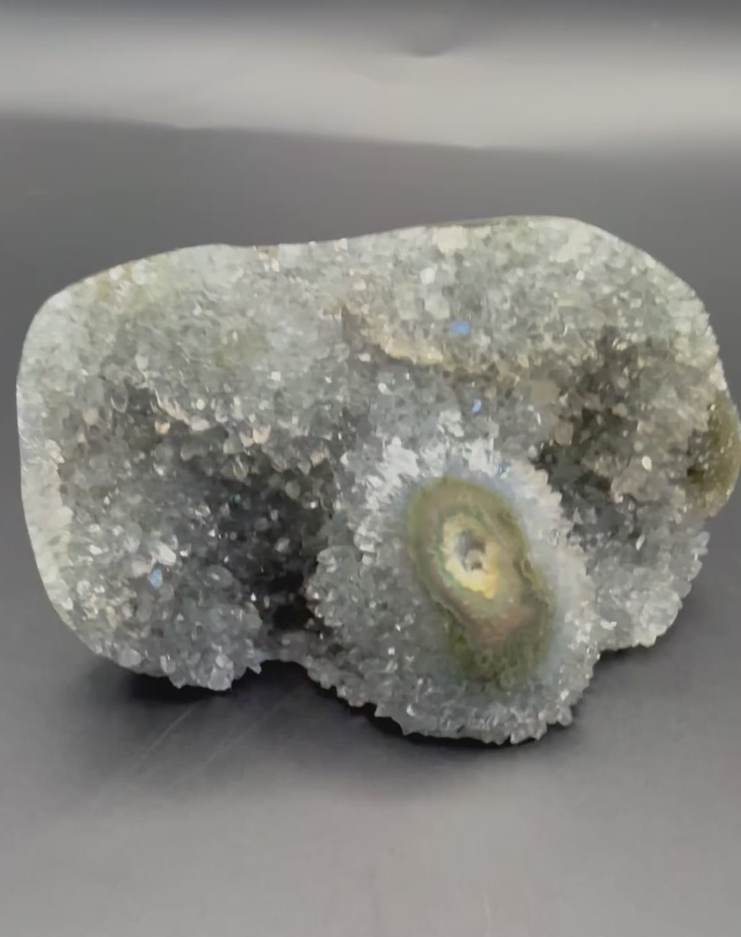 This enchanting cluster features sparkling Green Amethyst druzy with a rare stalactite “eye” formation in the center. The natural green tones of Prasiolite bring a serene, heart-opening energy that balances and uplifts both spirit and emotions.