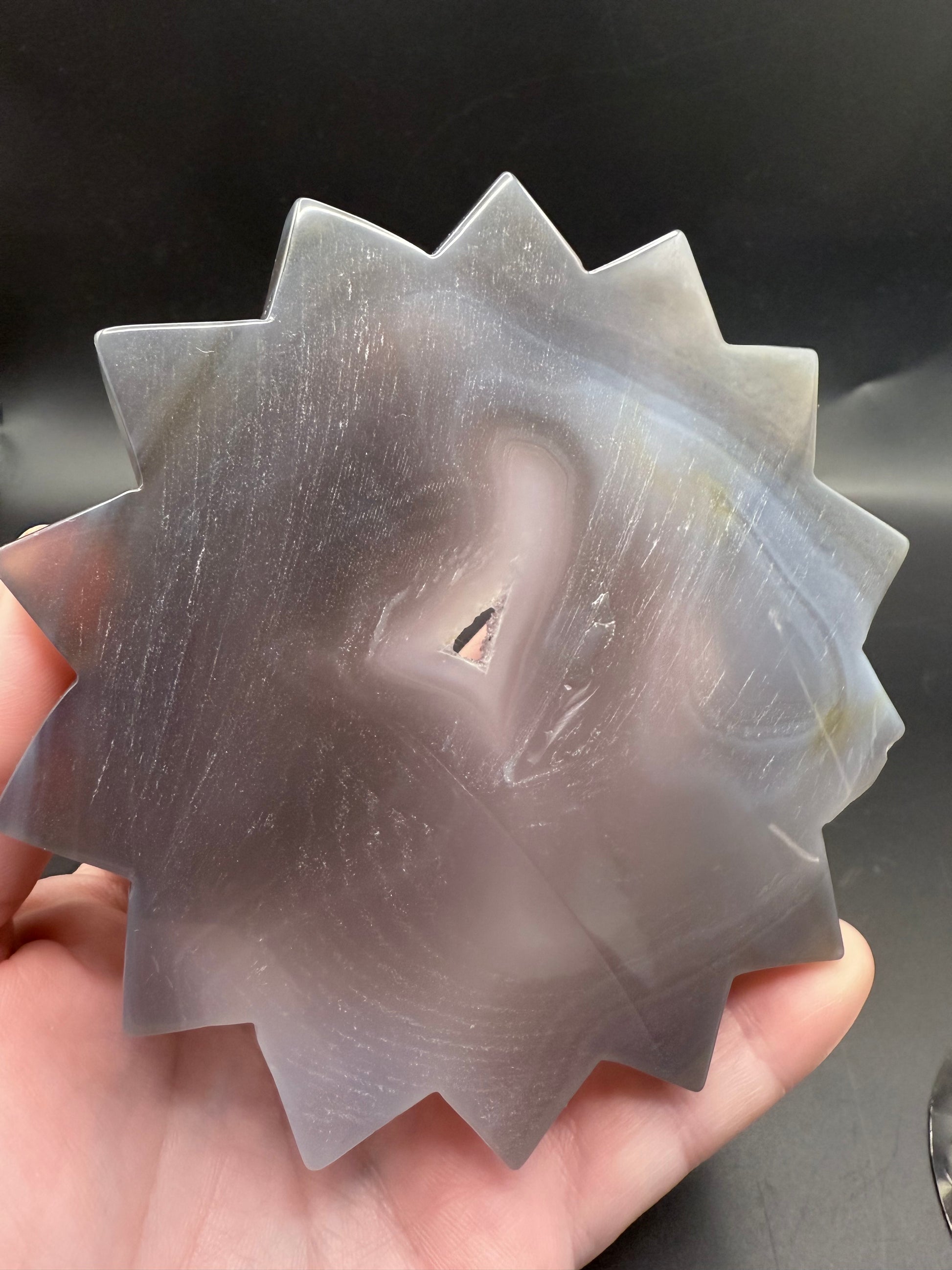 This gorgeous Agate sunflower carving measures 12cm across and weighs 263g. The sunflower is carefully polished with defined petals and a sparkling druzy quartz center that glimmers with light. It comes complete with a unique Zodiac-themed stand, making it not only a crystal display but also a cosmic statement piece filled with symbolism and energy.