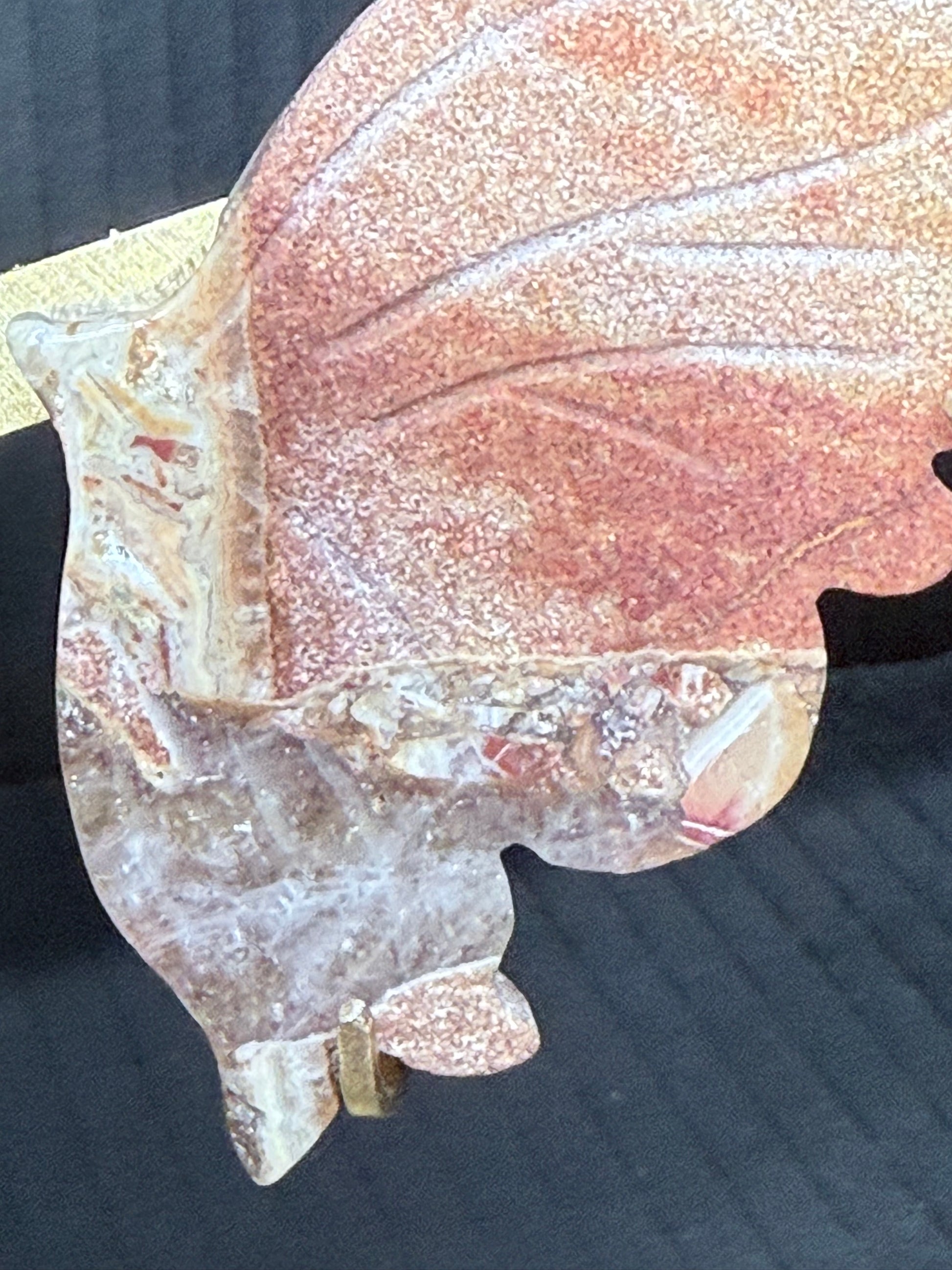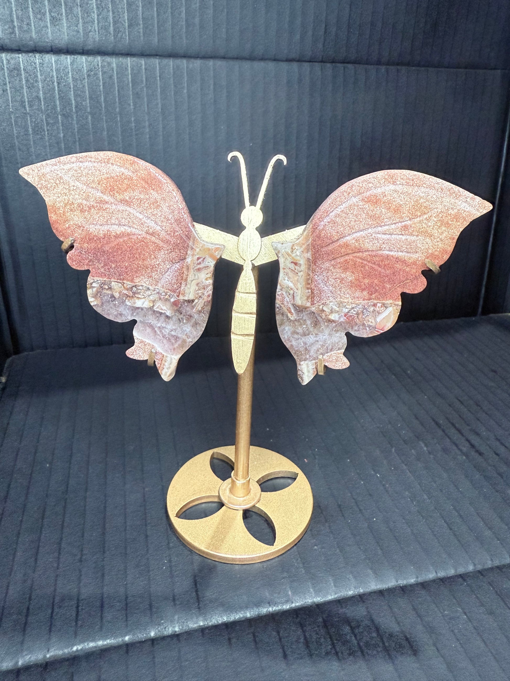 Delicately mounted on a stand to show off its unique wing patterns and soft blush tones, this beauty brings both elegance and healing energy to your space.