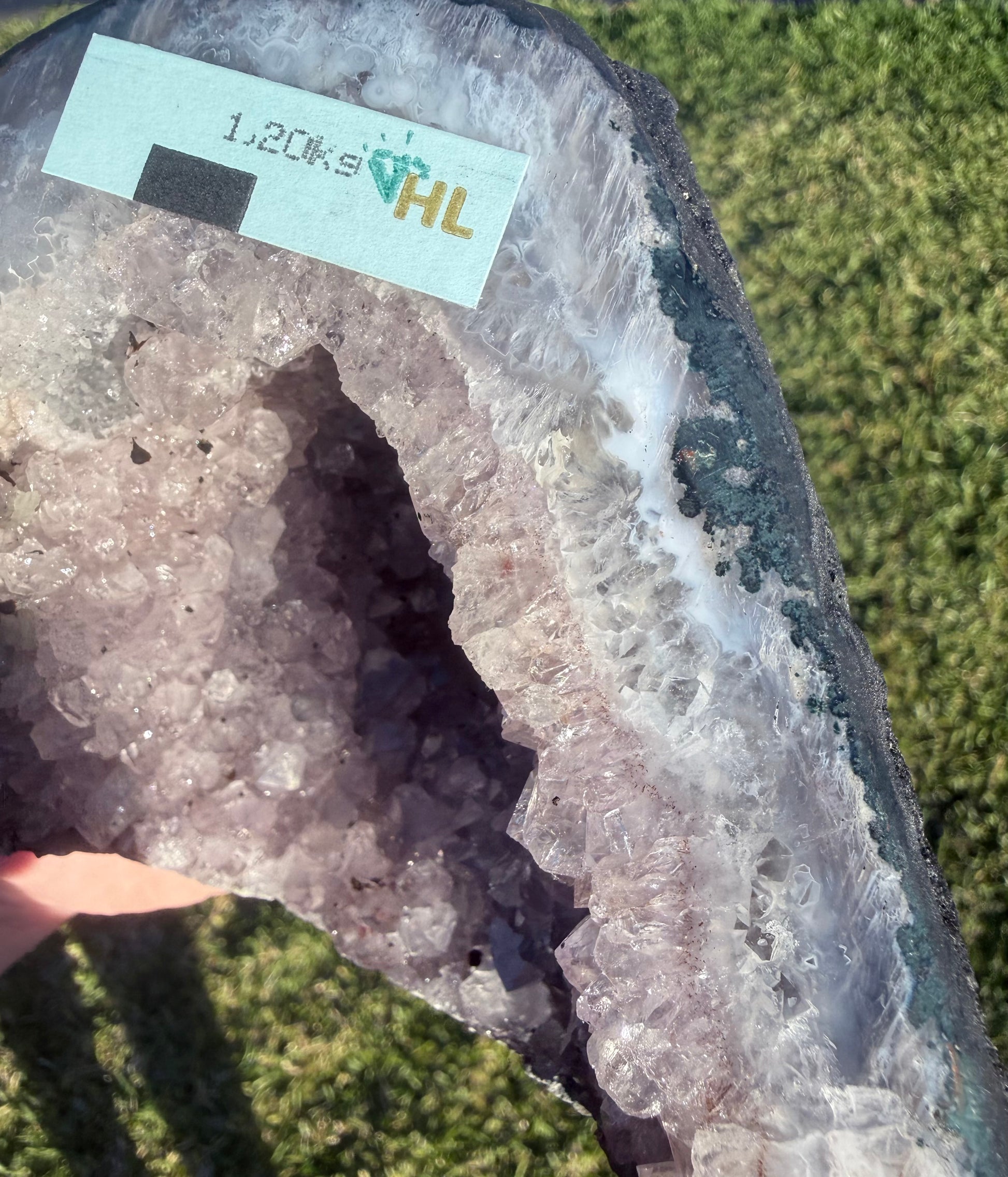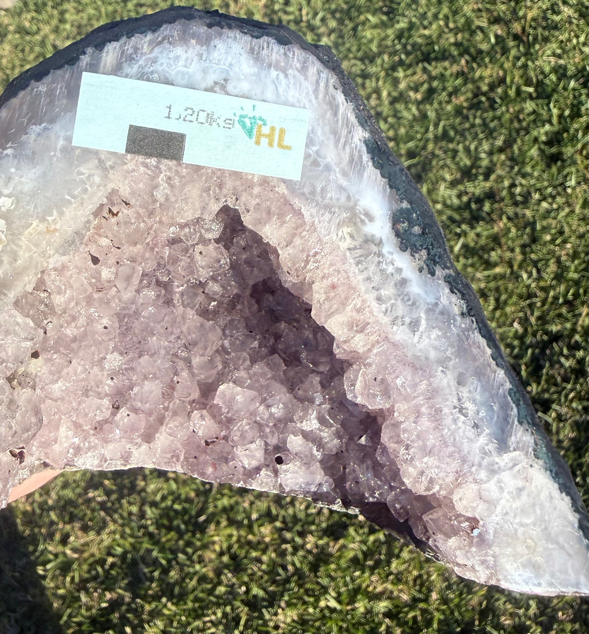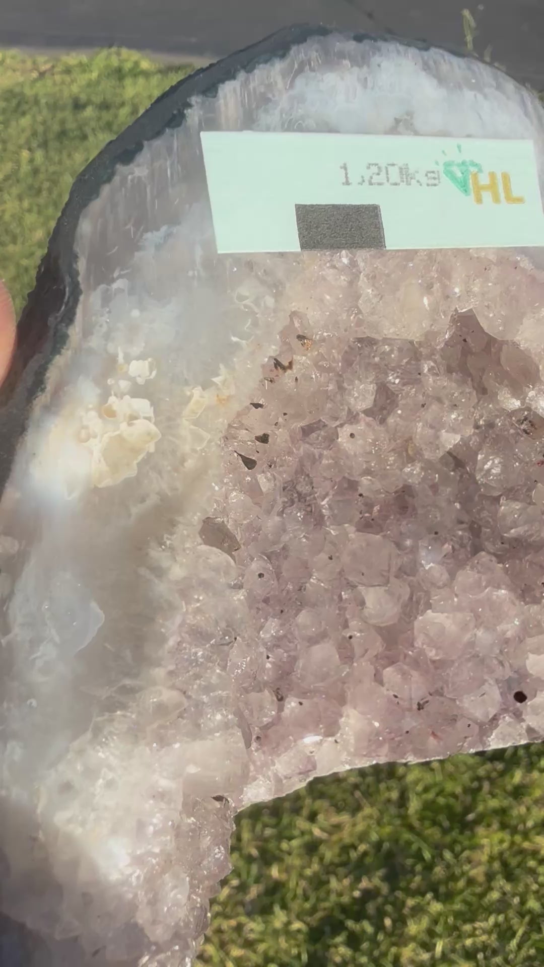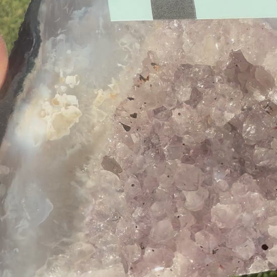 Step into serenity with this enchanting Amethyst Cathedral Geode, featuring delicate lilac-purple crystal points that glisten beautifully under any light. The natural banded agate edges frame the inner sparkle, creating a truly breathtaking display piece that radiates peaceful energy.