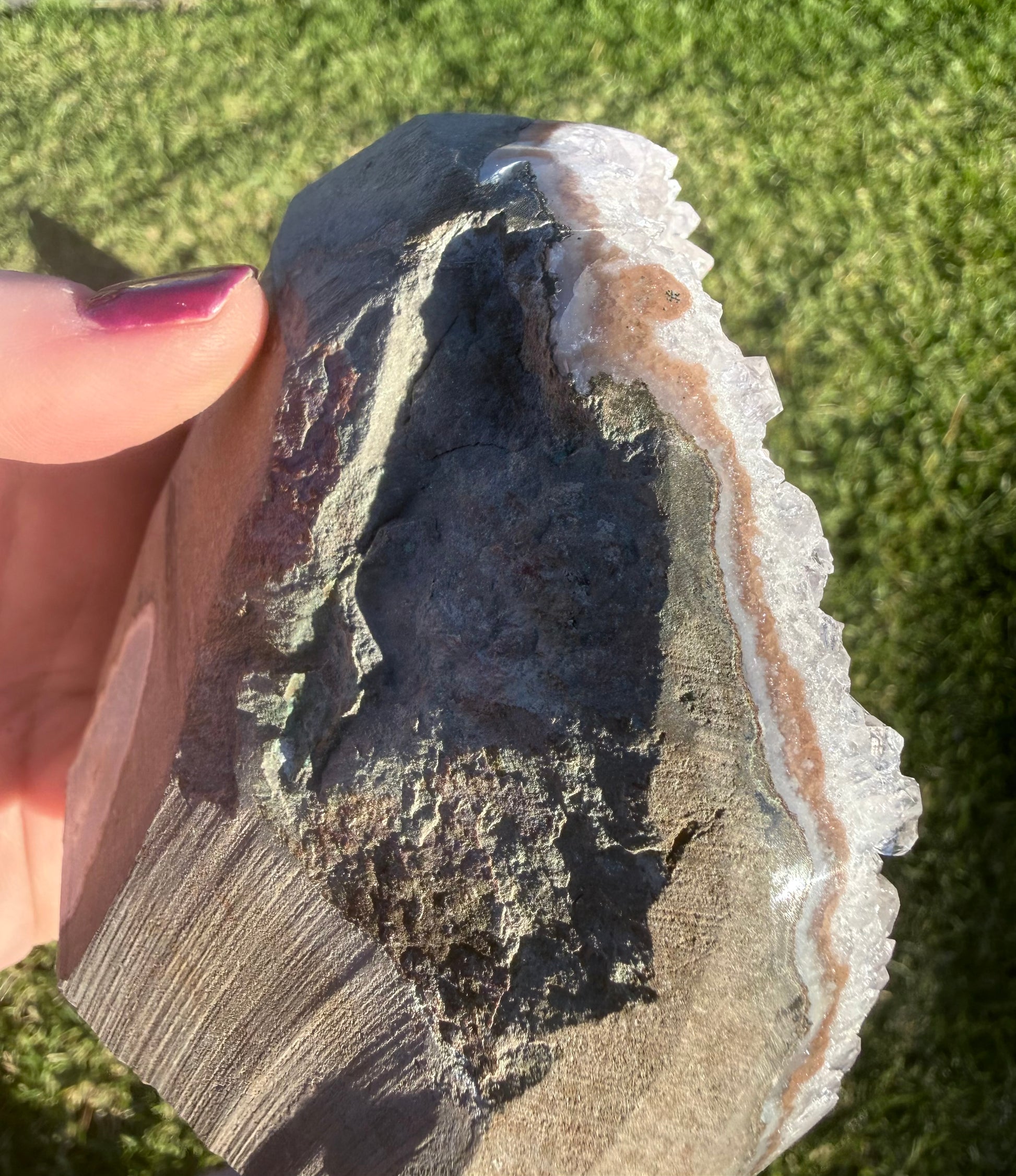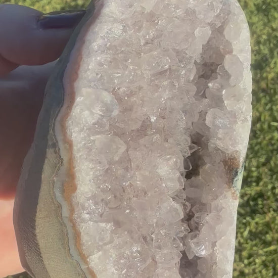 This stunning Amethyst Cathedral Geode glows with soft lilac crystals and gorgeous natural agate banding along its edges. The sparkling interior showcases gentle clusters of amethyst points, while the outer surface reveals beautiful swirls of earthy and ocean tones — creating a soothing and elegant contrast.