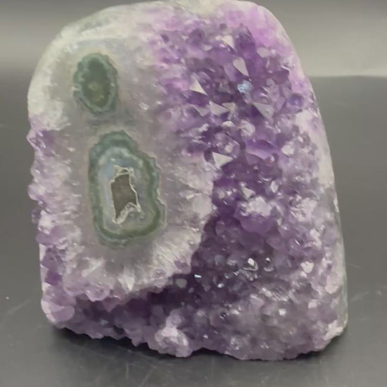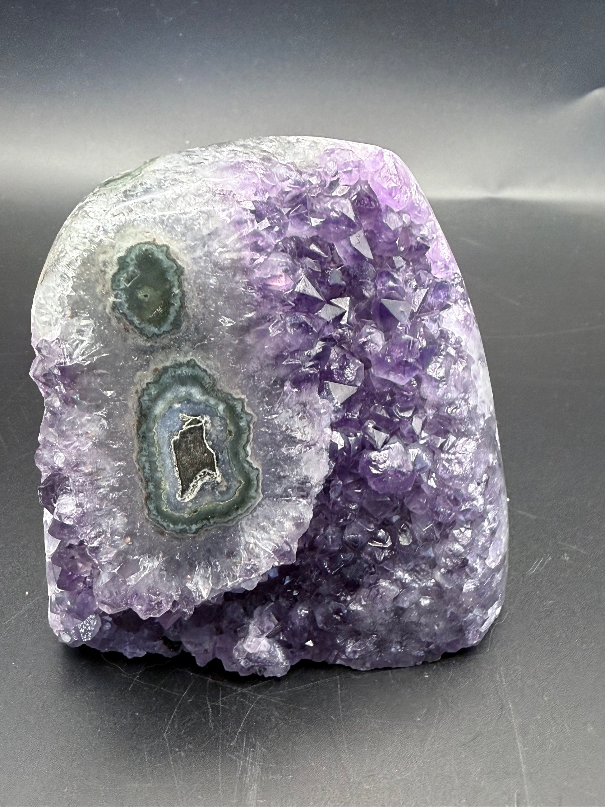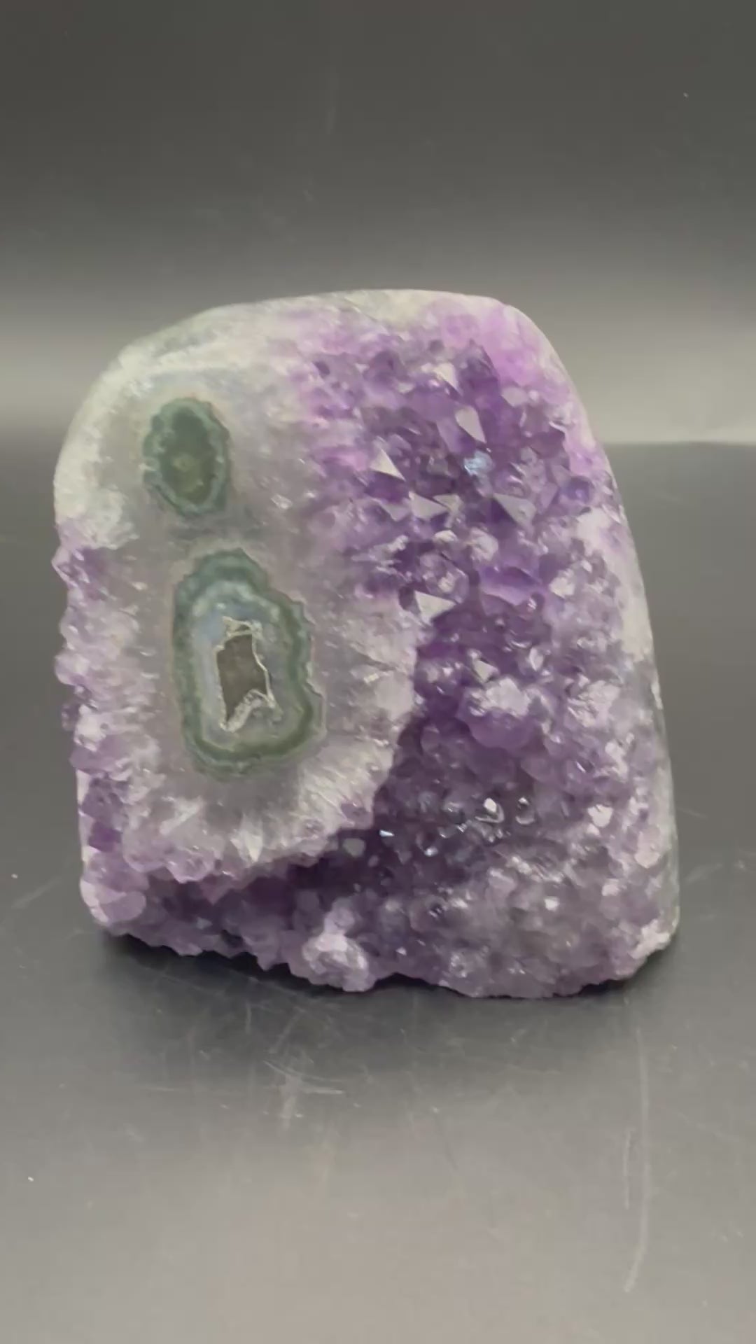 This magnificent Amethyst geode cluster weighs 690g and measures 10 x 8.5 cm, bursting with sparkling violet crystals that shimmer beautifully in the light. What makes this piece extra special are the two striking “eye” formations on the face of the geode, showcasing stunning concentric banding of grey, green, and white agate with deep crystal centers. These natural features make it a rare and highly collectible specimen.