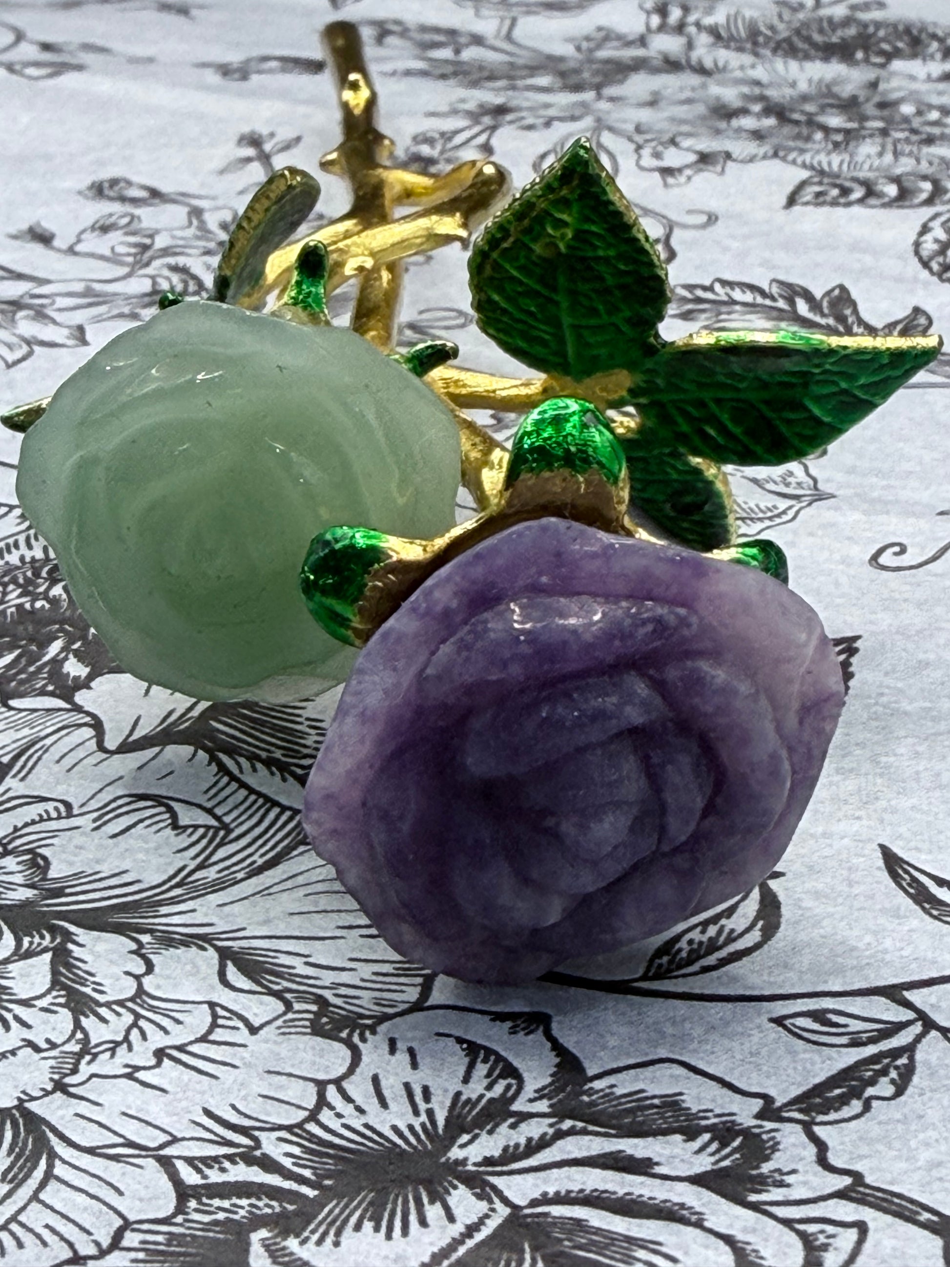 This piece features a soft green Green Aventurine rose and a rich purple Amethyst rose. Green Aventurine is loved for luck, confidence, and heart healing, while Amethyst is known for calm, clarity, and peaceful energy — the perfect pairing for balance and soothing vibes.