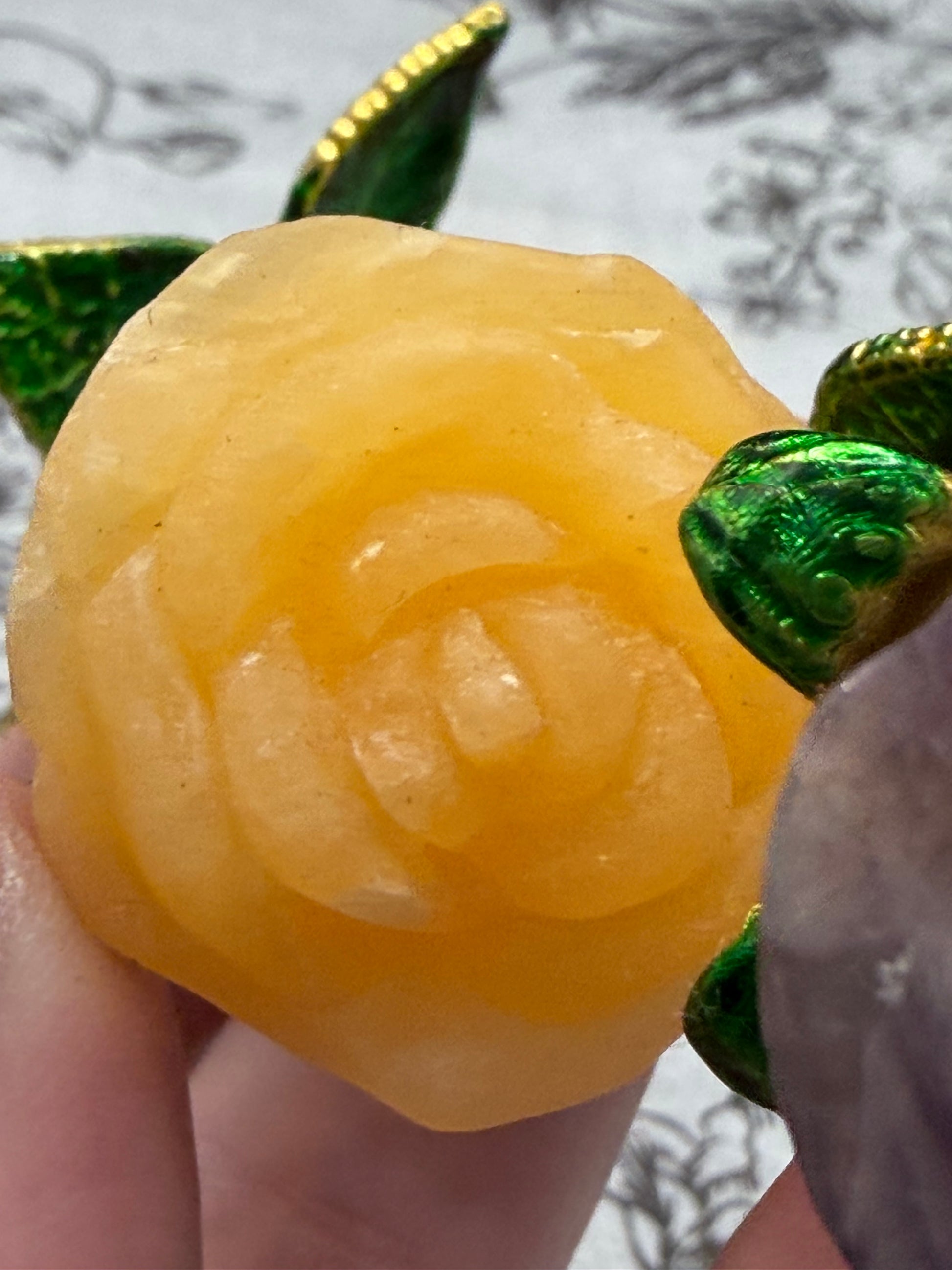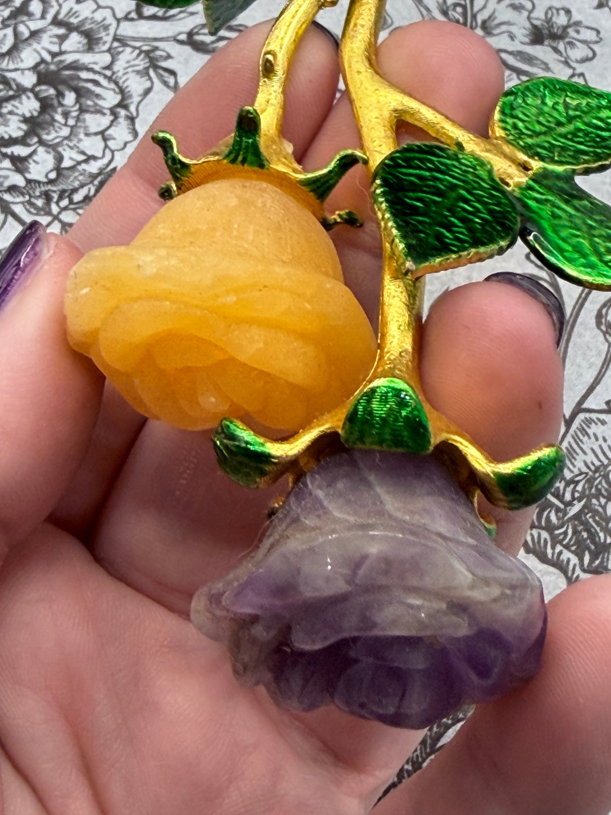 A stunning double crystal rose on a gold-toned metal stem with shimmering green leaves — a beautiful gift piece and a standout for any crystal display. Featuring a soothing Amethyst rose paired with warm Honey Calcite, this piece is all about calm energy and sunshine confidence.