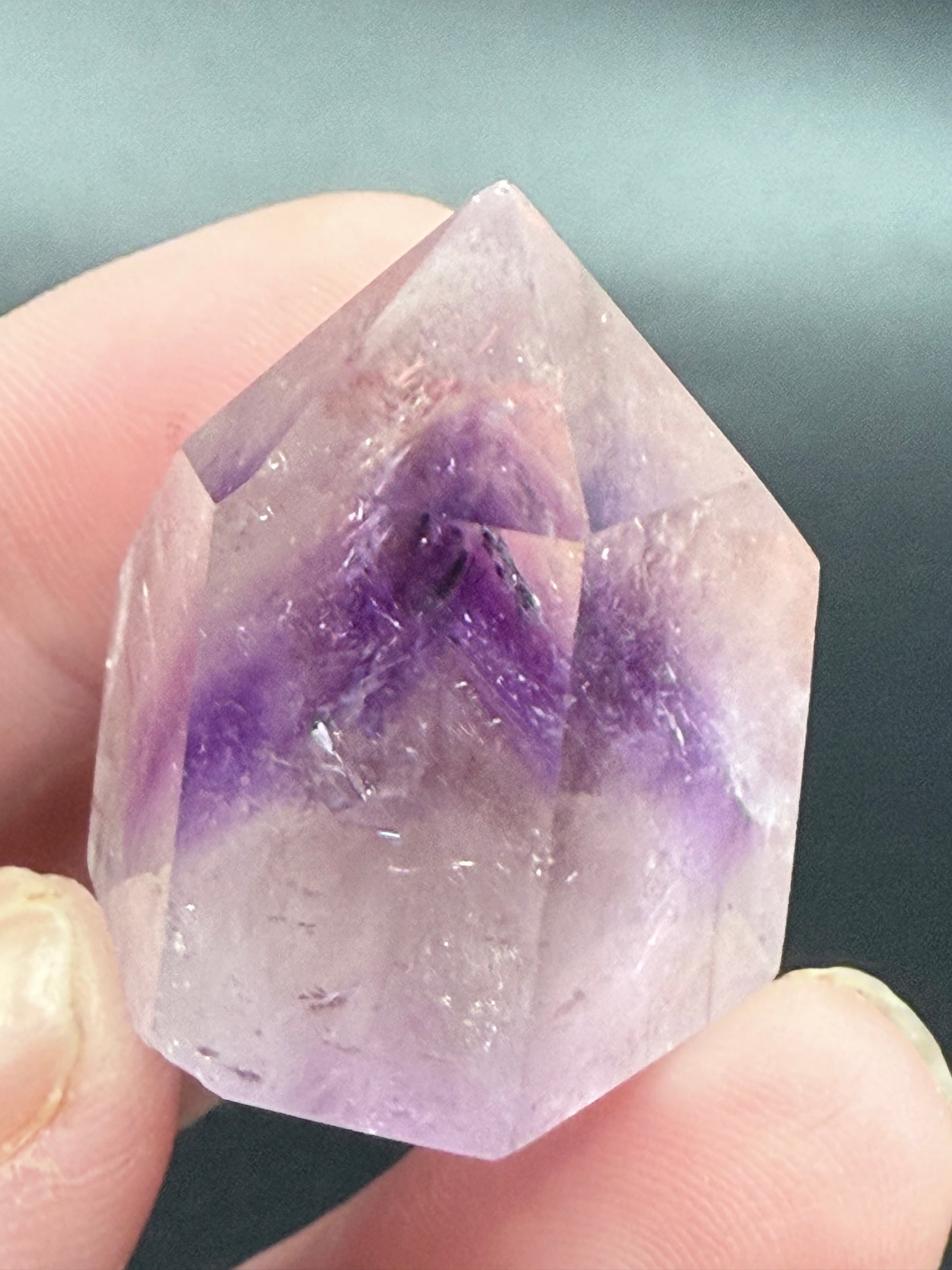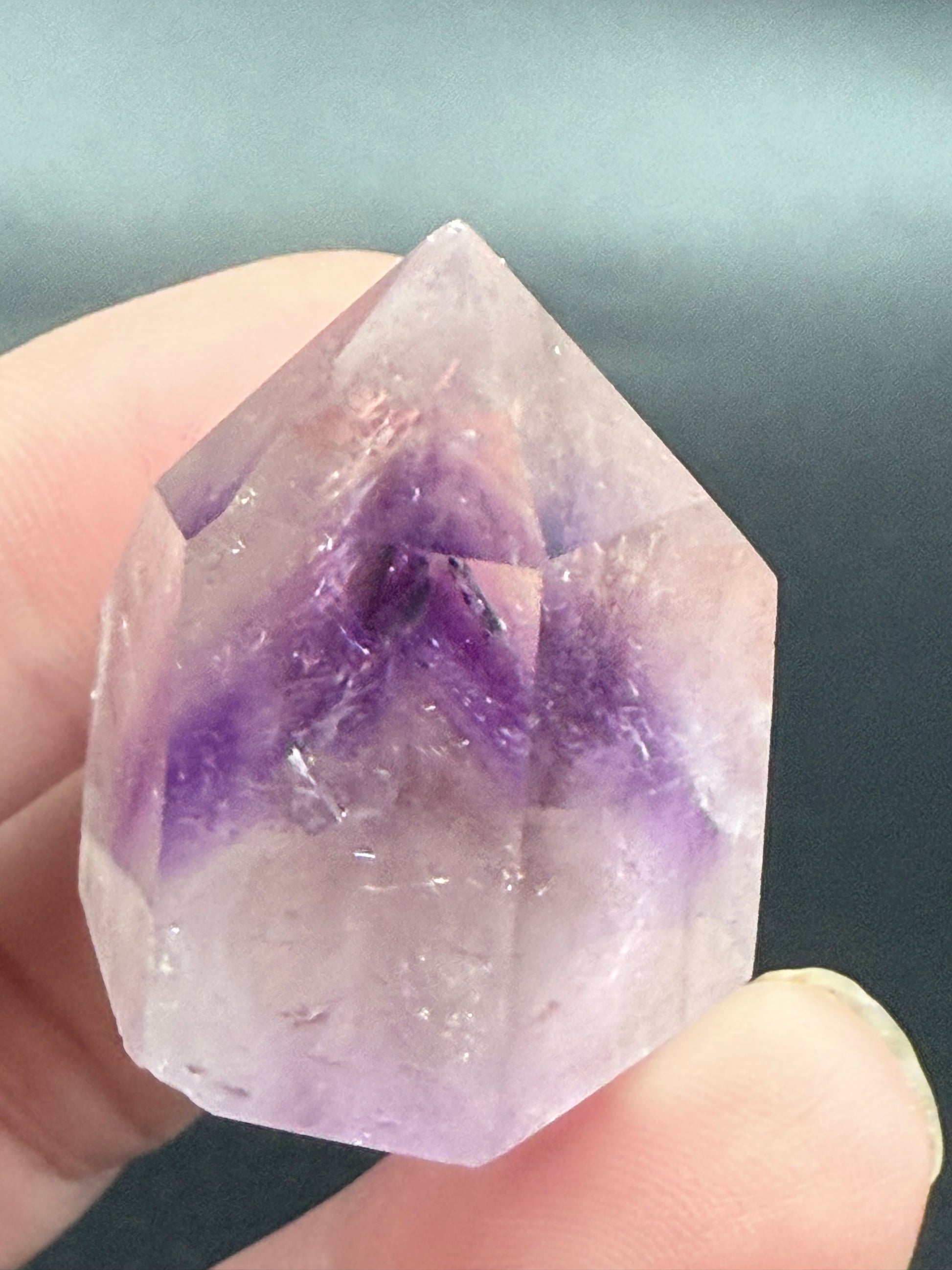 This striking polished Amethyst point showcases phantom inclusions ā unique shadow-like crystal layers that reveal its growth history ā along with beautiful rainbow flashes that shimmer inside the stone. A small yet powerful piece, perfect for display, meditation, or energy work.