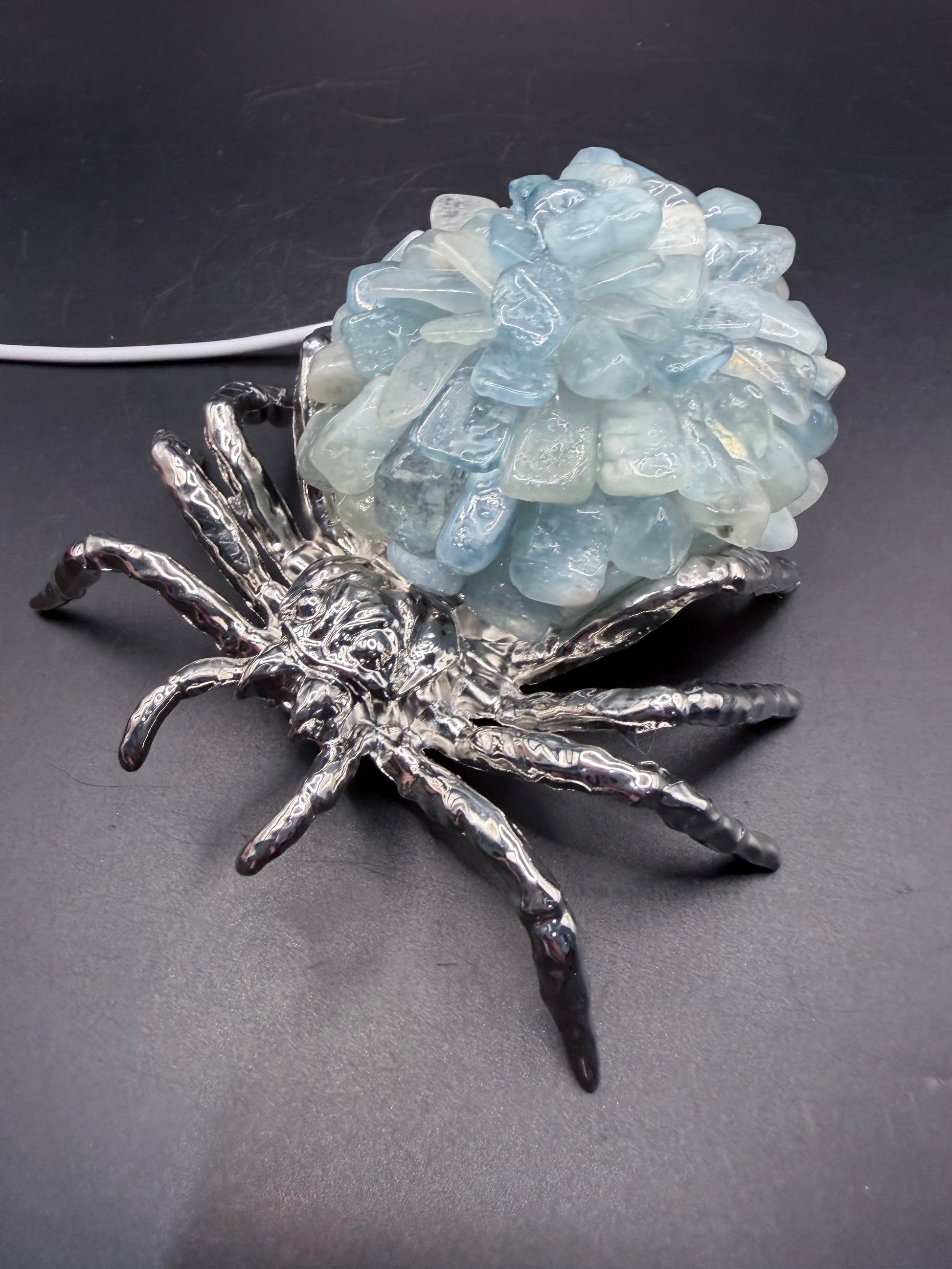 Aquamarine is known for its peaceful, calming energy and strong connection to clarity and communication, while the spider symbol represents creativity, patience, and manifestation. Together, they make this lamp both eye-catching and energetically meaningful.