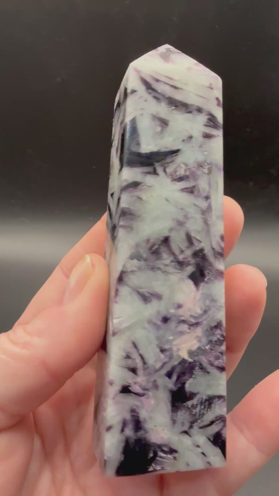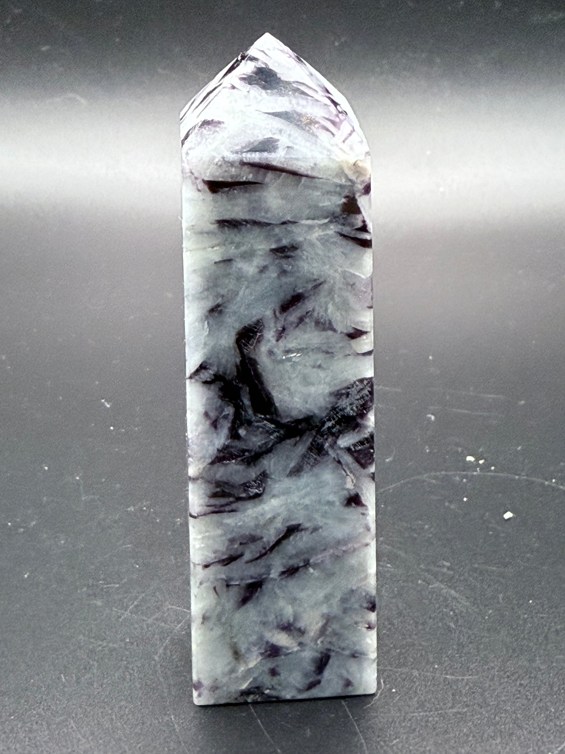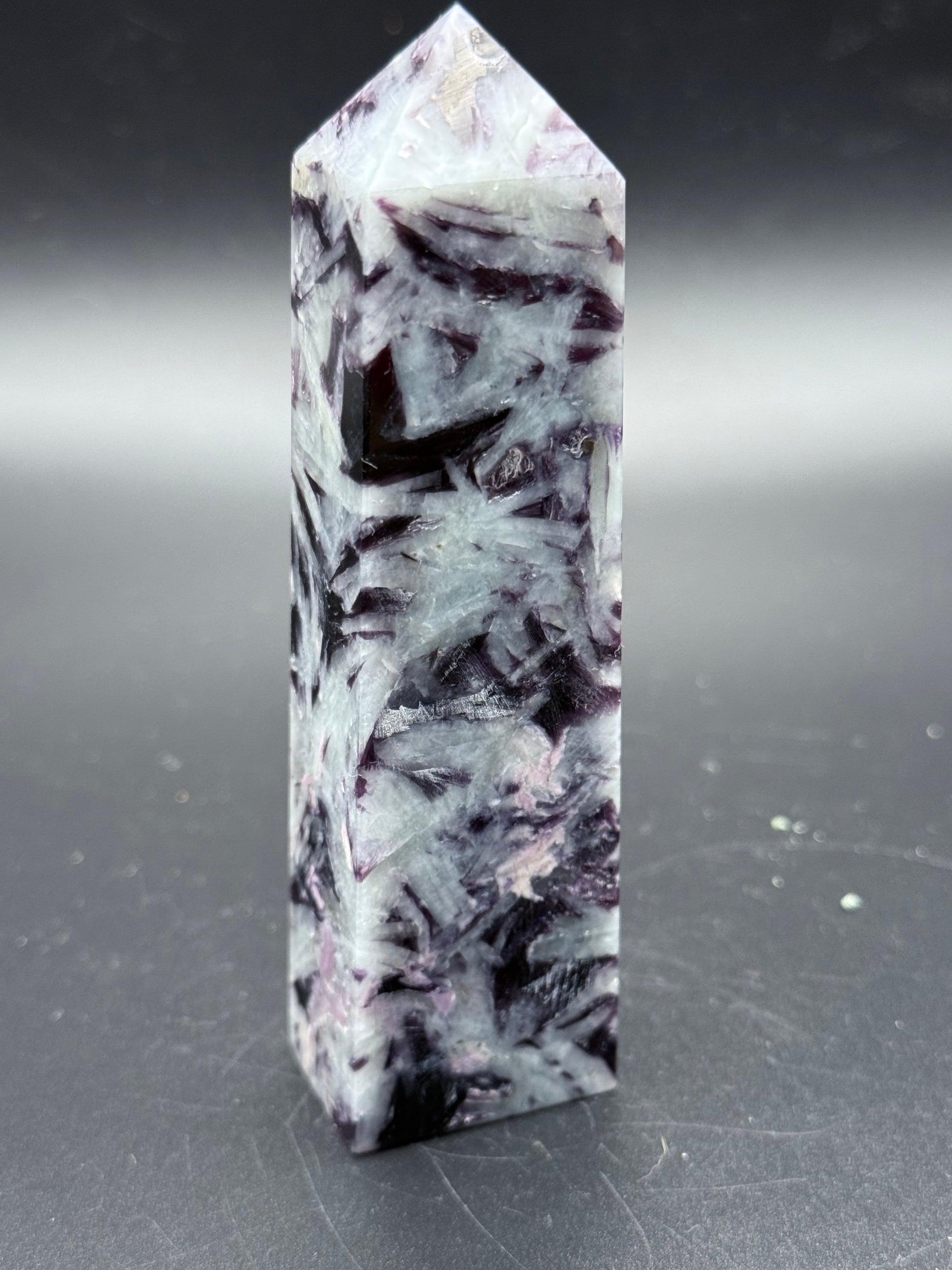 This is the largest of three stunning towers featuring a rare and powerful combination of aquamarine, lepidolite, and shimmering mica. Aquamarine promotes calm, clarity, and soothing energy, while lepidolite provides emotional balance and stress relief. Sparkling mica inclusions add a beautiful, natural shimmer throughout the piece.
