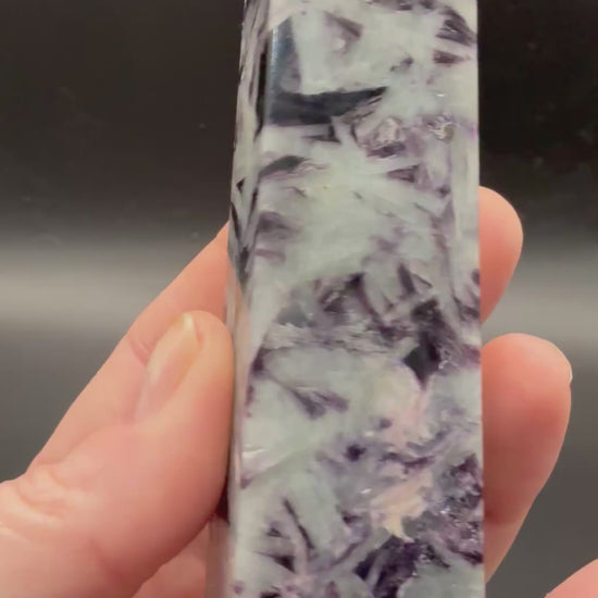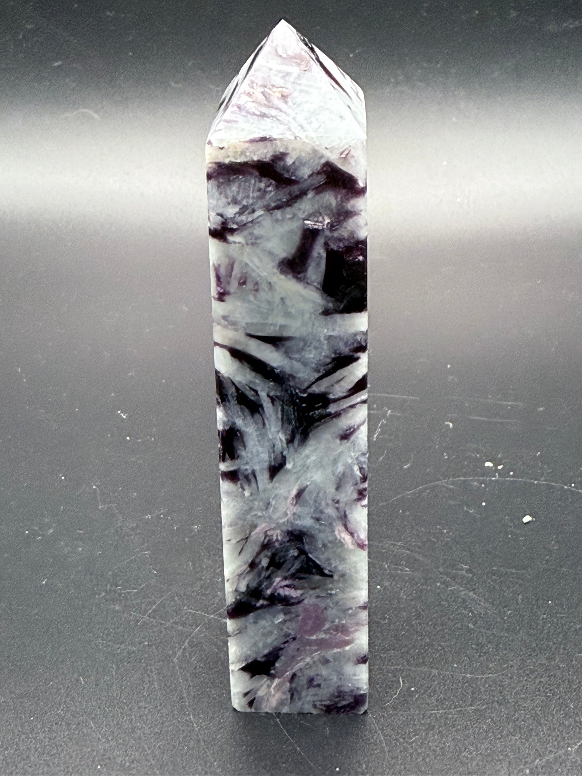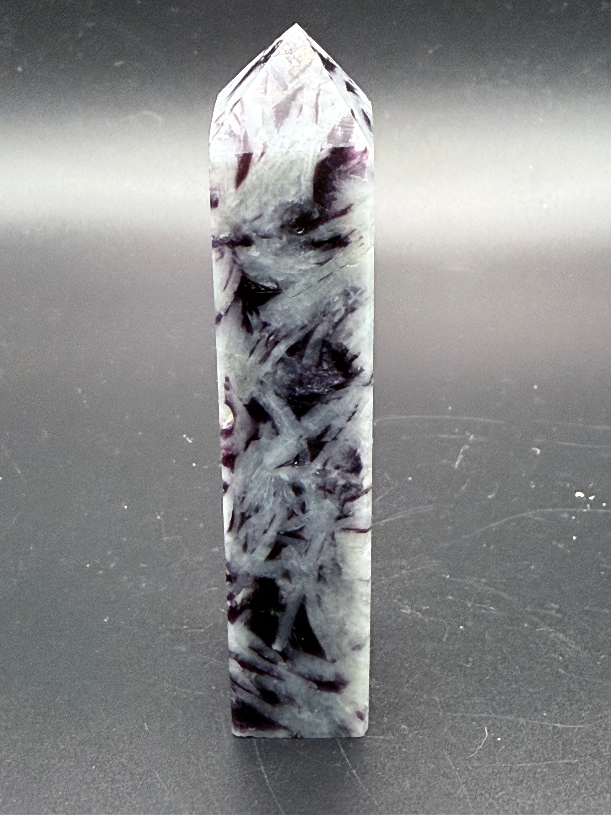 This is the largest of three stunning towers featuring a rare and powerful combination of aquamarine, lepidolite, and shimmering mica. Aquamarine promotes calm, clarity, and soothing energy, while lepidolite provides emotional balance and stress relief. Sparkling mica inclusions add a beautiful, natural shimmer throughout the piece.