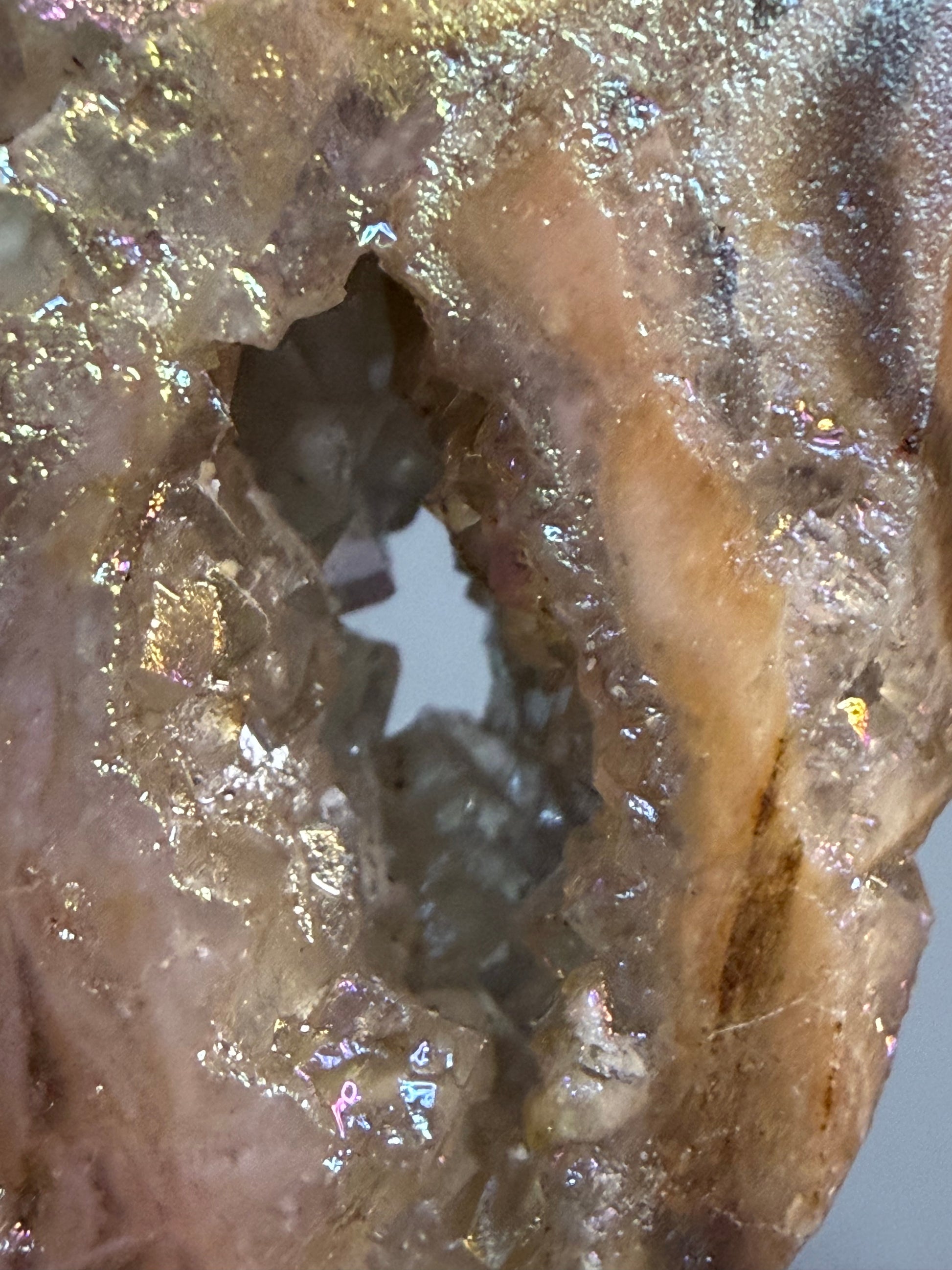 An aura coating has been bonded to the surface to enhance the stone’s natural beauty, creating a luminous, high-vibration finish while preserving the raw textures beneath.