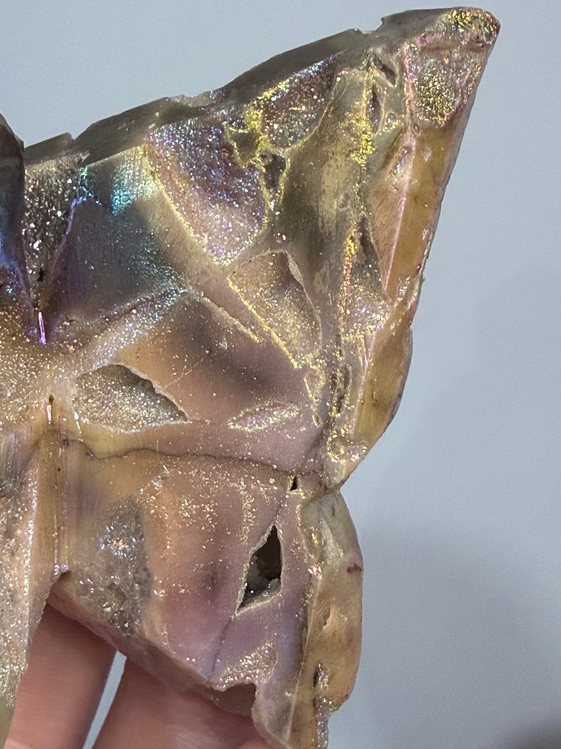 This stunning Aura Sphalerite Butterfly is a true statement piece, shimmering with rainbow iridescence and natural druzy sparkle. Hand-carved into a butterfly shape, it symbolises transformation, rebirth, and stepping into personal power, making it both visually captivating and energetically meaningful.