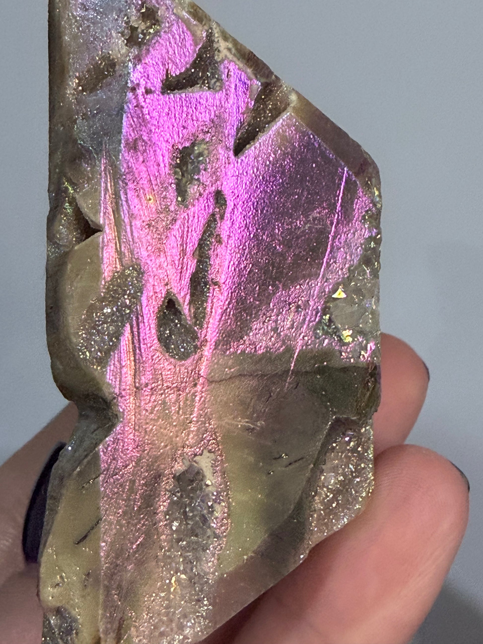 Sphalerite is known for its grounding yet energising qualities, helping to balance scattered thoughts, boost confidence, and support motivation. The aura coating enhances its vibration, amplifying joy, focus, and intention while creating mesmerising flashes of pink, gold, aqua, and violet across the surface. Natural druzy pockets add texture and depth, catching the light beautifully from every angle.