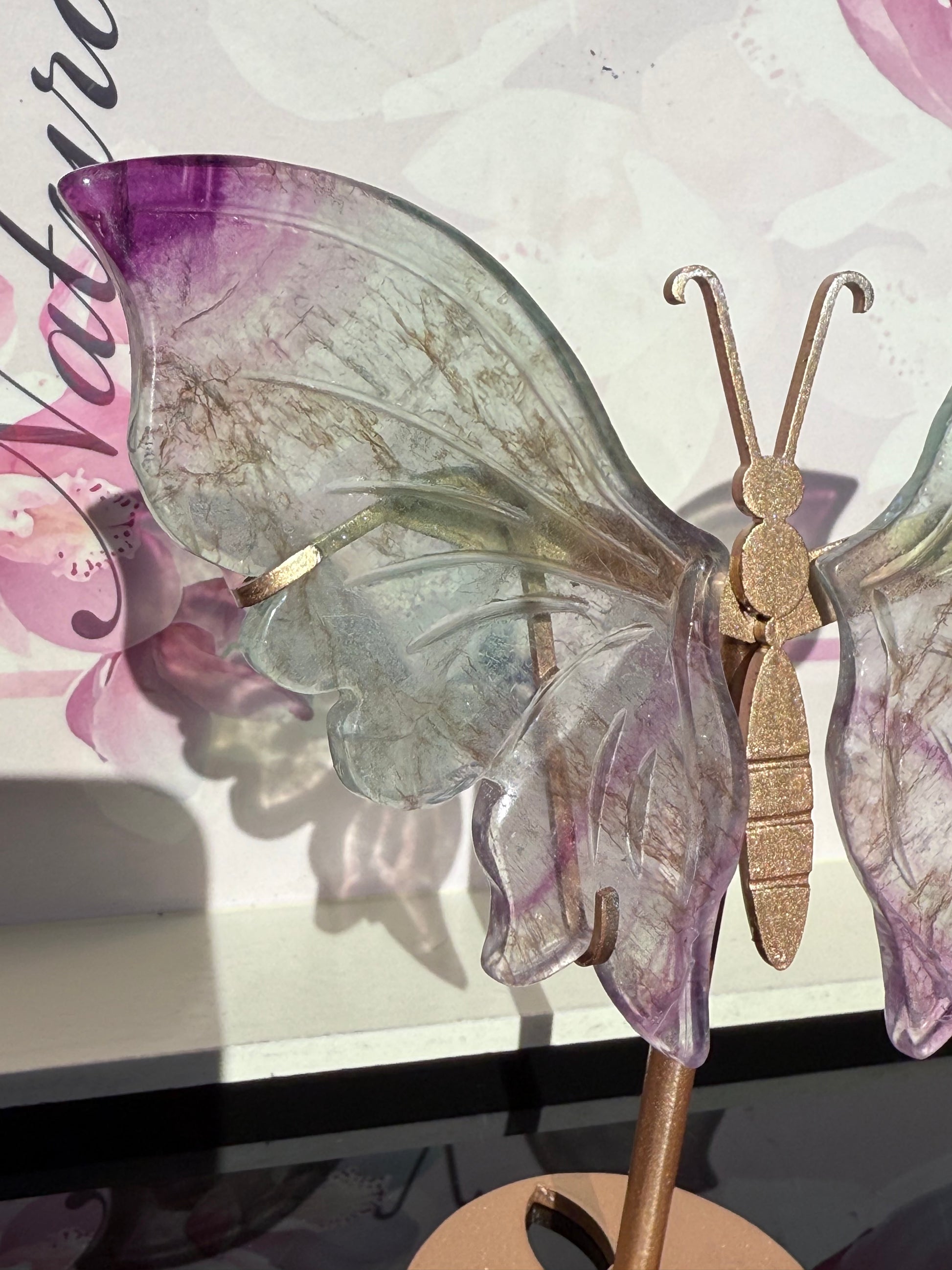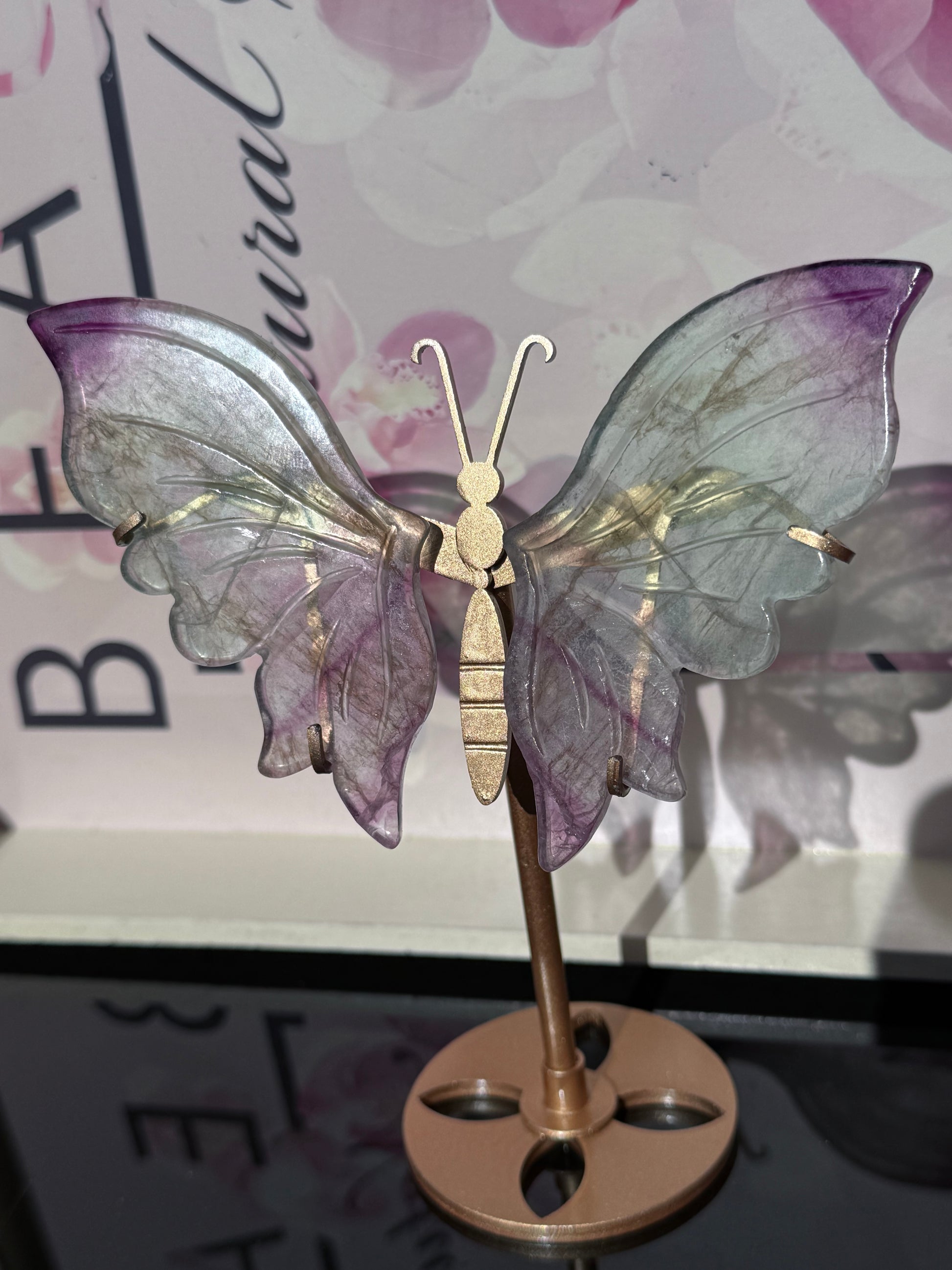 Stunning Green and Purple Fluorite Butterfly Wings on Gold Stand