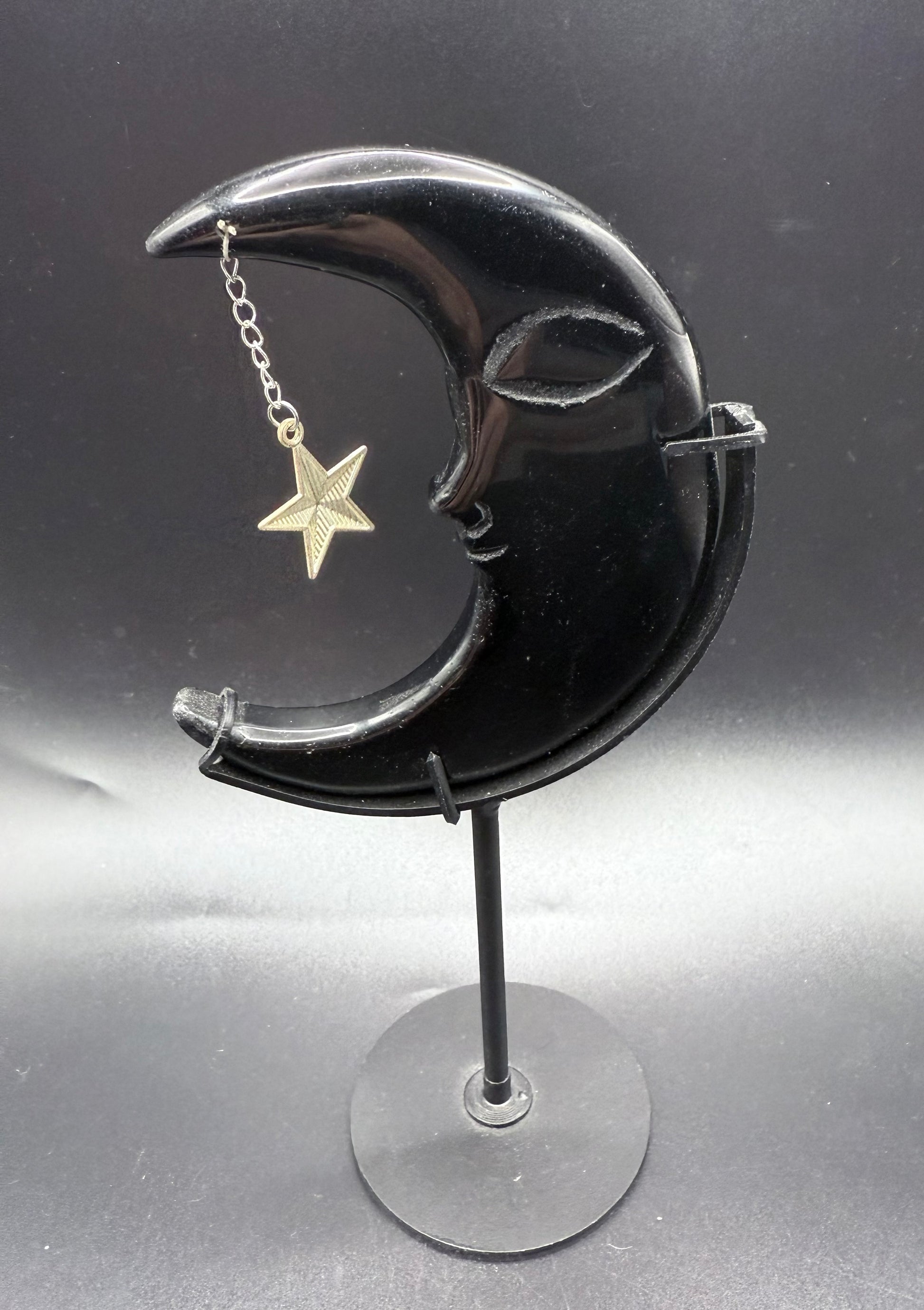 A mystical display piece featuring a hand-carved Black Obsidian crescent moon face with a delicate hanging star charm. Beautifully mounted on a sleek black stand, this piece radiates elegance and celestial energy.