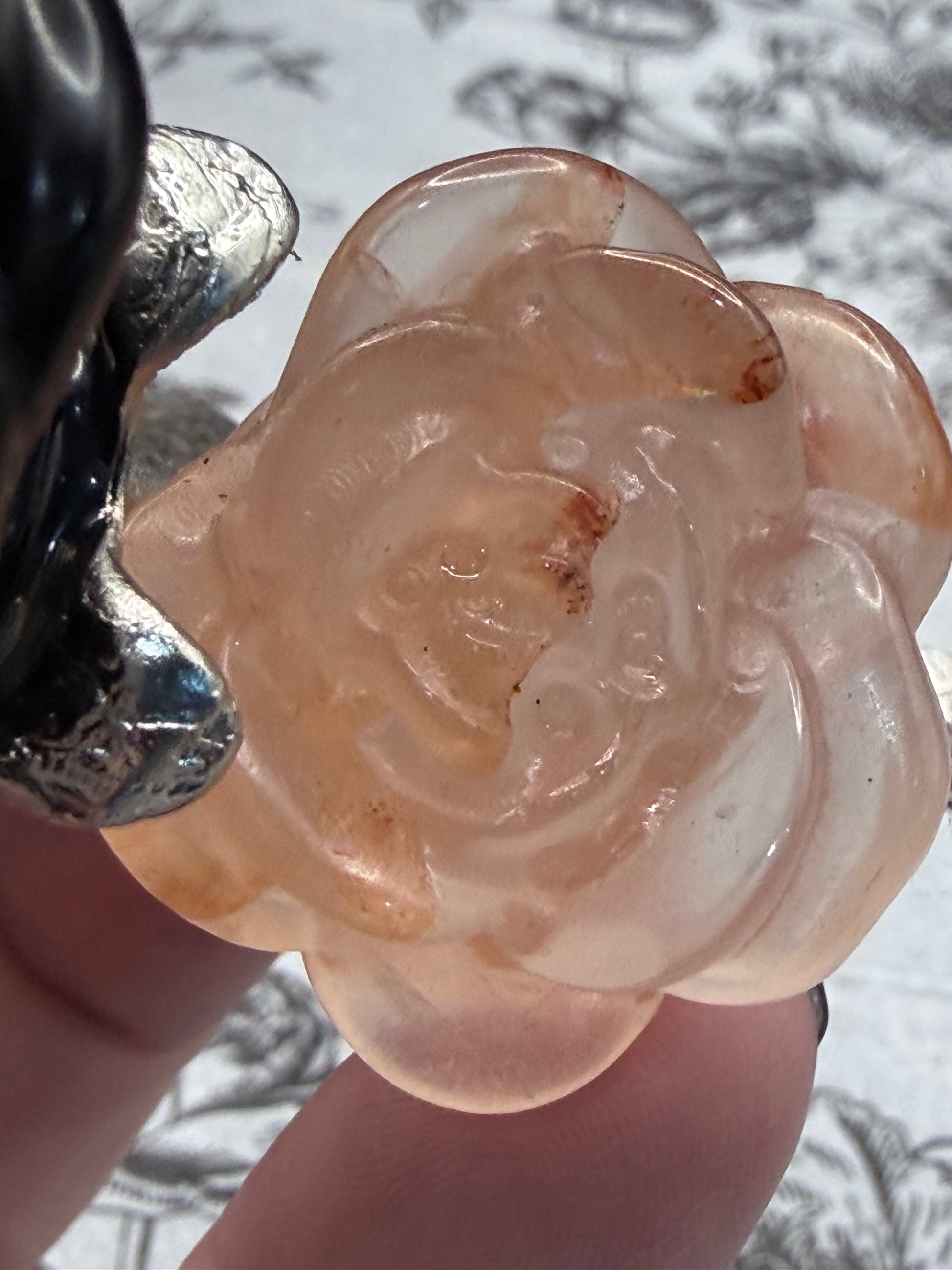 A stunning double crystal rose on a silver-toned metal stem with leaf details — bold, romantic, and full of grounding energy. This piece pairs a glossy Black Obsidian rose with warm-toned Fire Quartz (Hematoid Quartz), creating the perfect mix of protection and confidence.