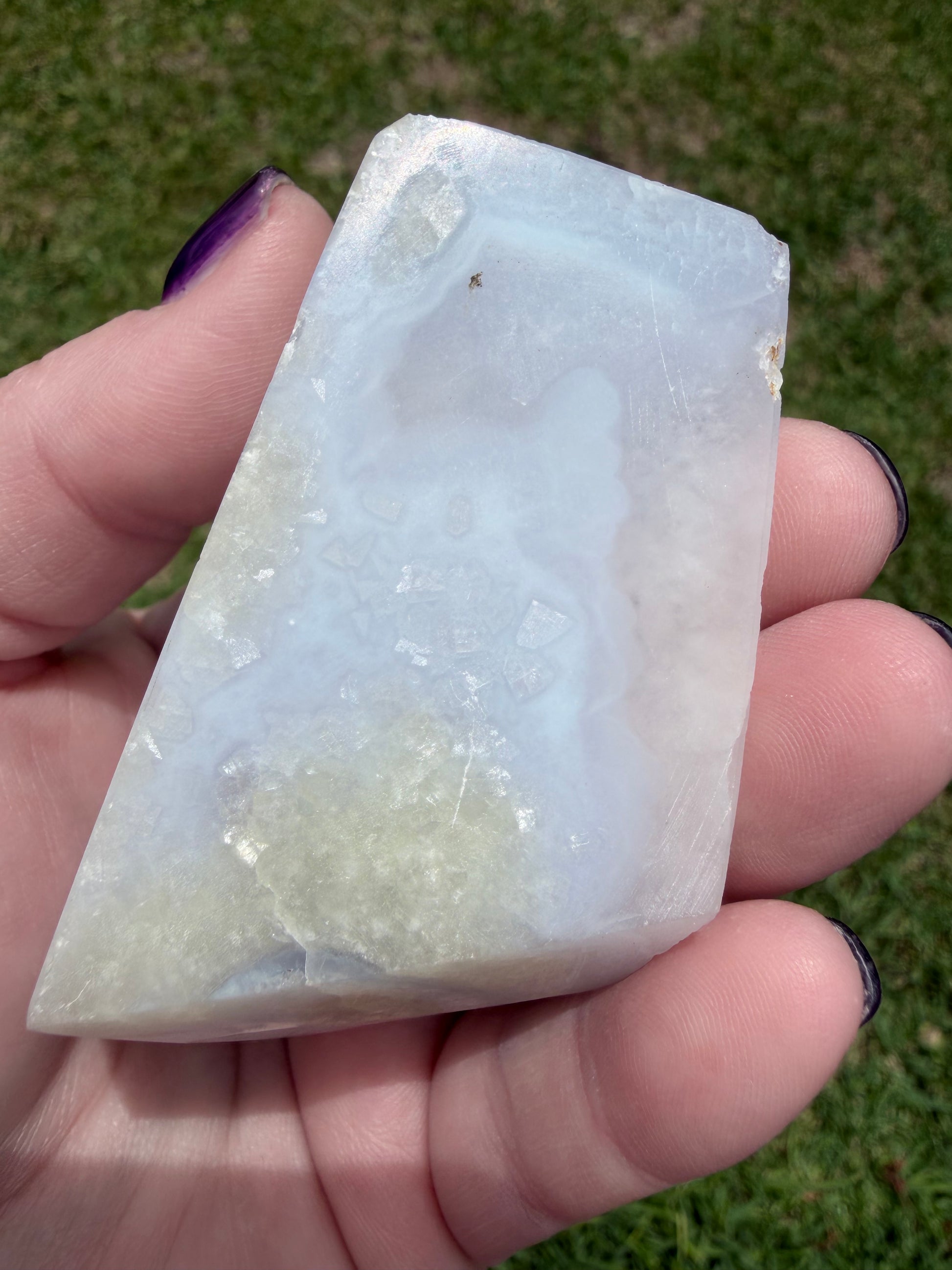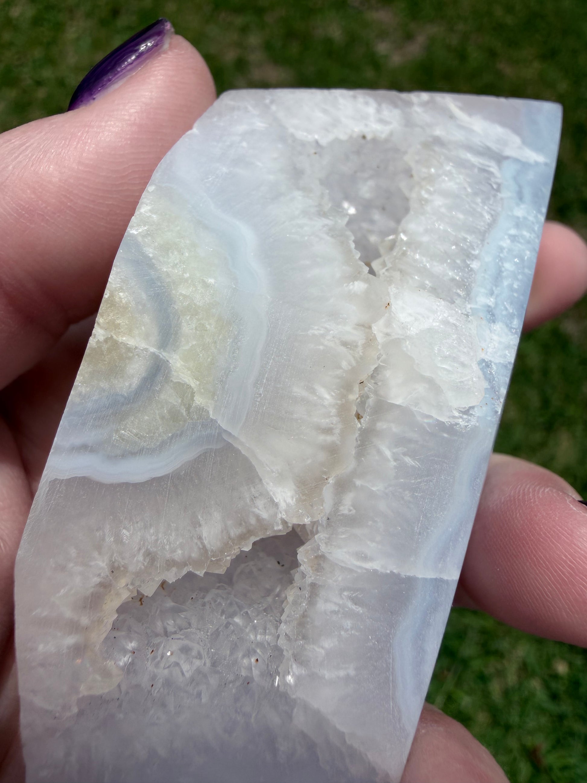 - Stone: Blue Lace Agate (banded chalcedony) with druzy cave