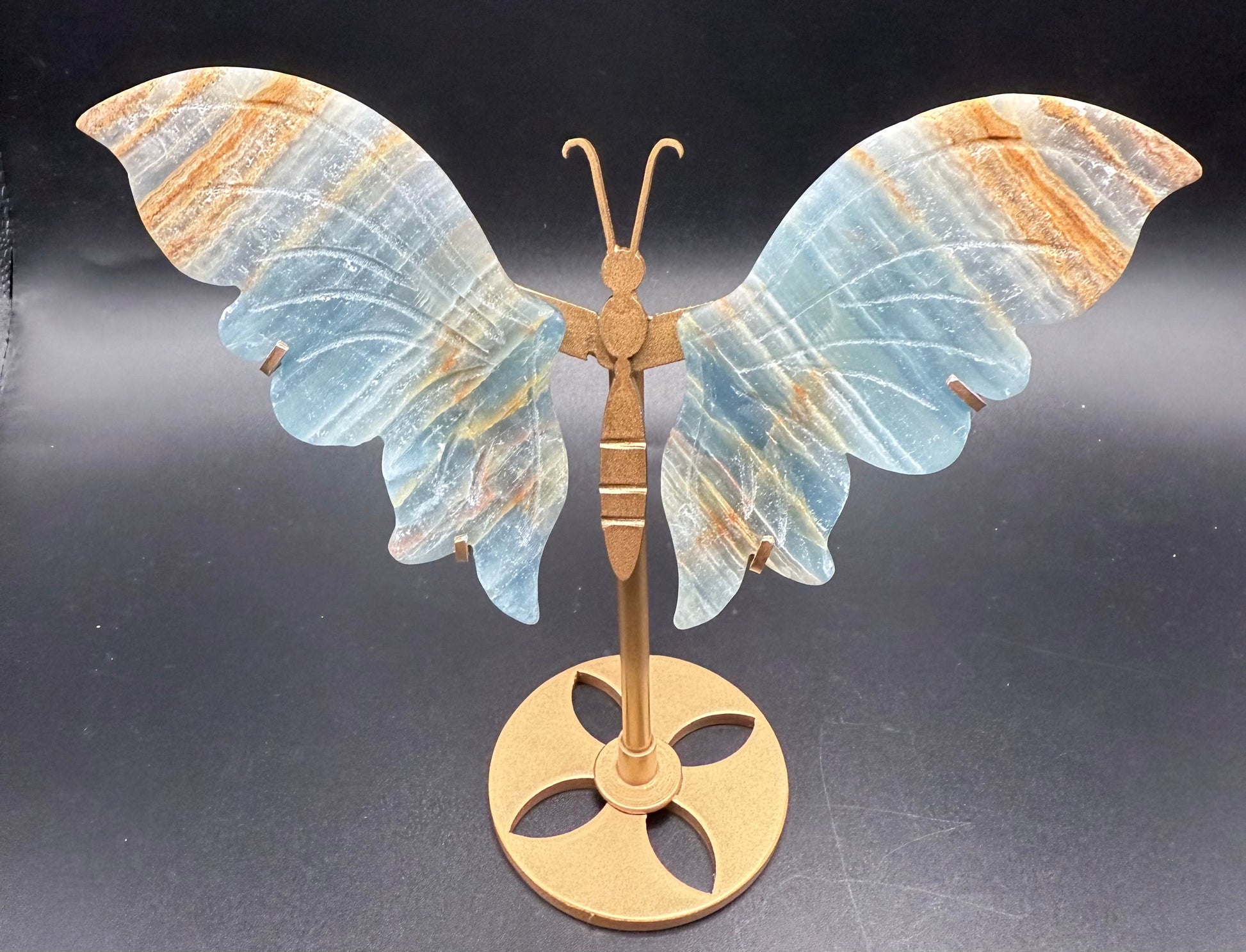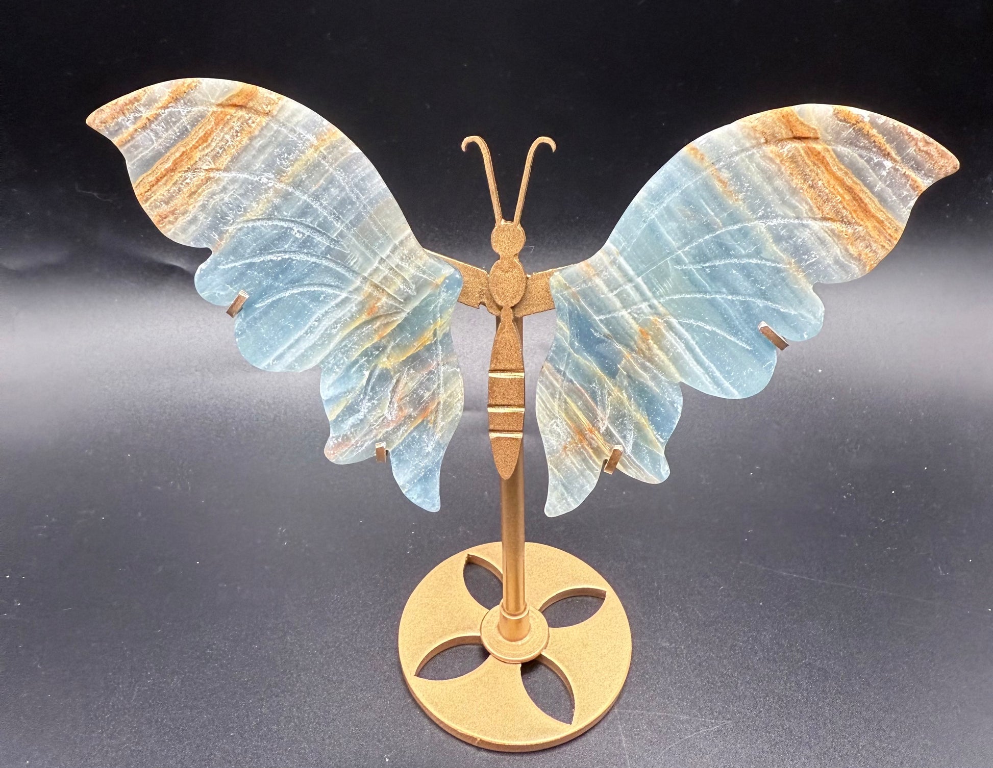 This striking butterfly has been hand-carved from natural Blue Onyx, with wings that display soft ocean-blue tones interlaced with earthy brown and golden banding. The unique striping makes each piece one-of-a-kind, while the golden stand adds elegance and balance.
