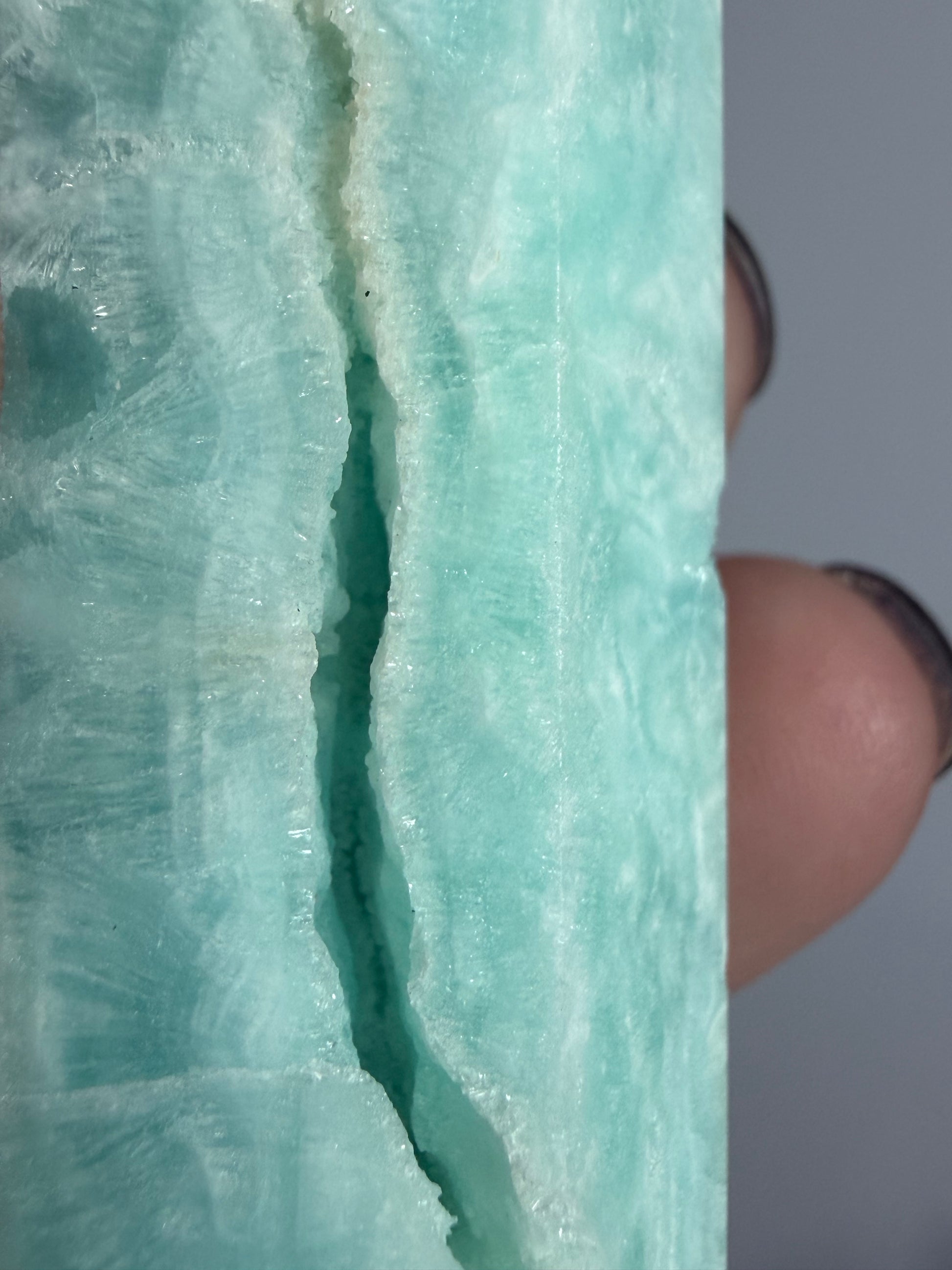 This piece includes a natural internal fissure, formed during crystal growth. This is common in Caribbean Calcite and does not affect the stability of the stone. It adds to the uniqueness and character of this one-of-a-kind piece.