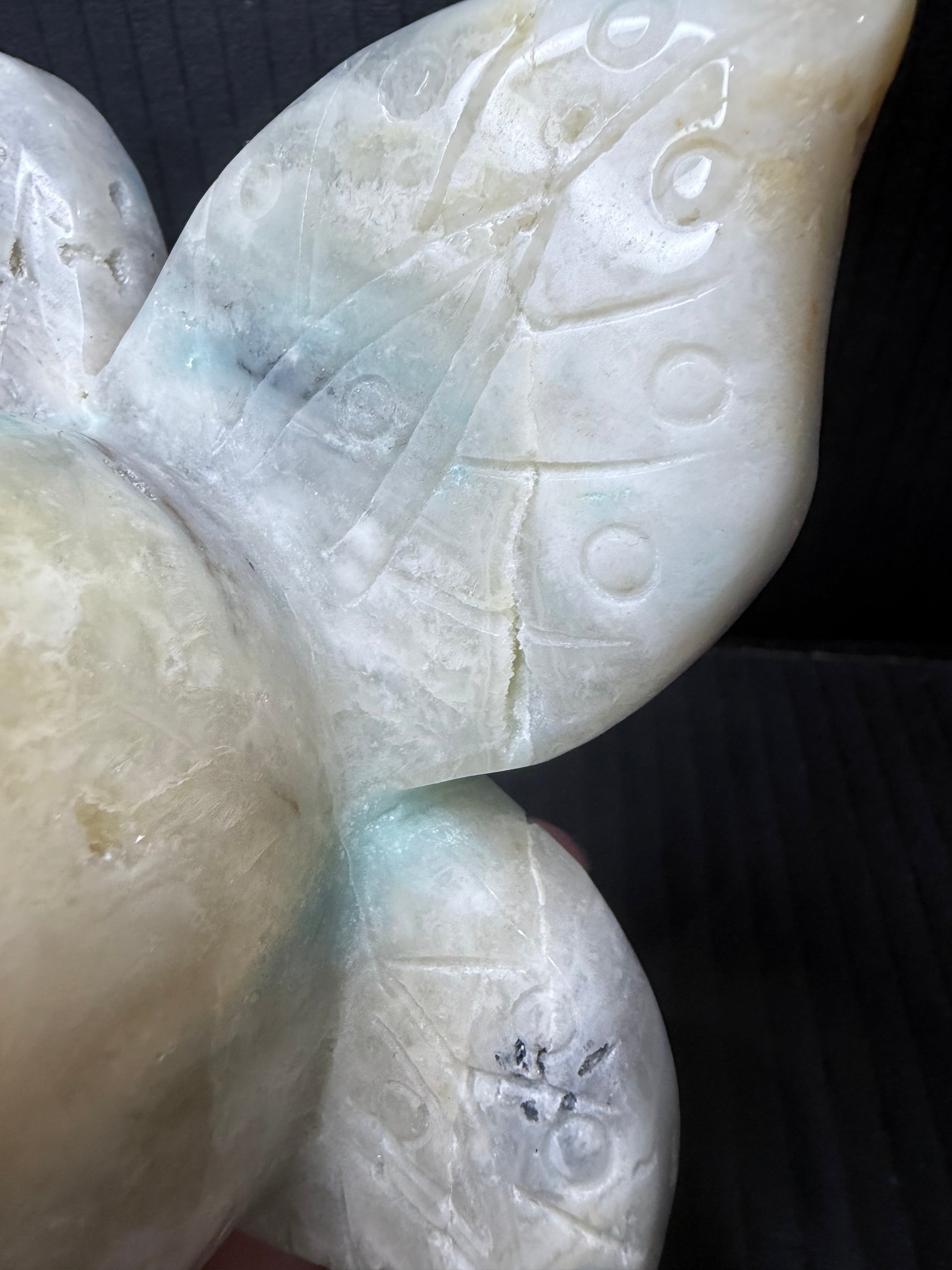 This captivating Caribbean Calcite skull features graceful wings, symbolizing freedom, transformation, and spiritual ascension. The soft, creamy hues of Caribbean Calcite radiate soothing, uplifting energy that promotes emotional healing and clarity.