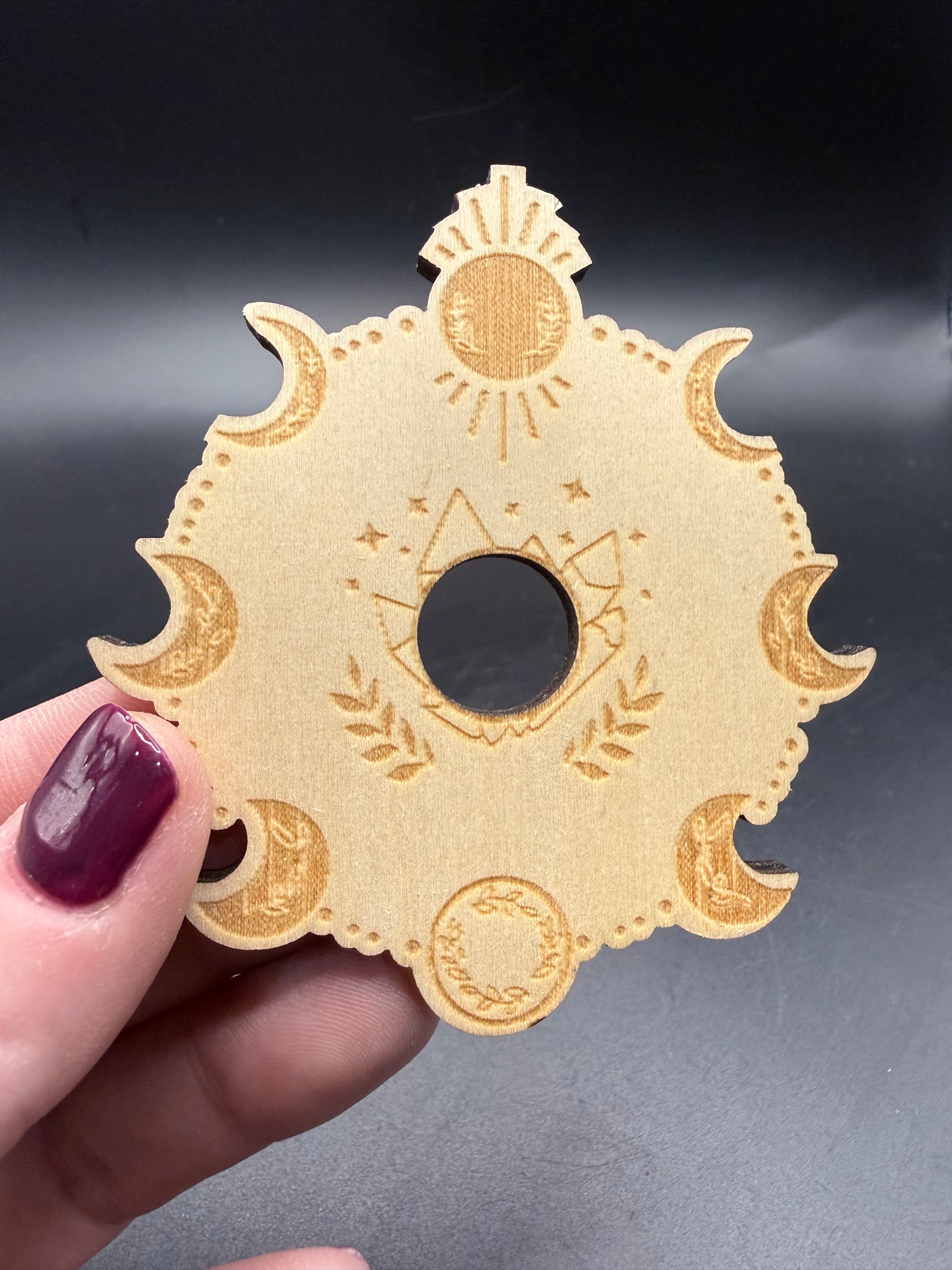 Add a touch of magic to your crystal displays with this beautifully laser-engraved wooden stand, featuring detailed sun, moon phases, and star designs.
