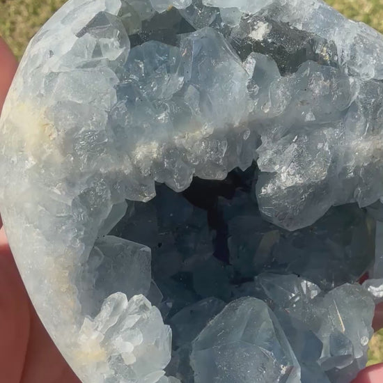 This breathtaking Celestite heart carving weighs 850g and showcases a smooth polished outer shape with a stunning natural cavity of sparkling blue crystals inside. It comes complete with a display stand, making it easy to showcase this radiant piece in your home or sacred space.
