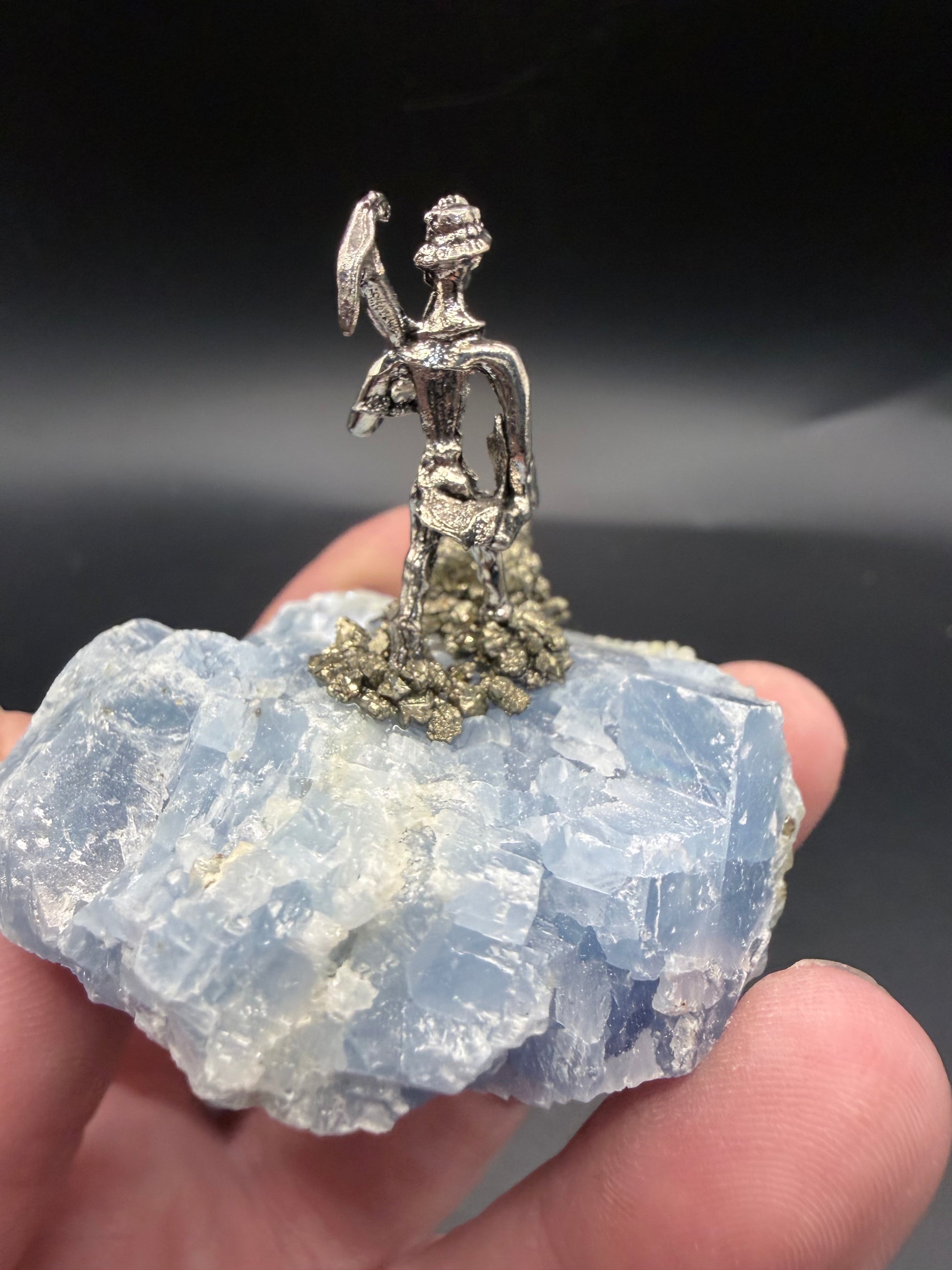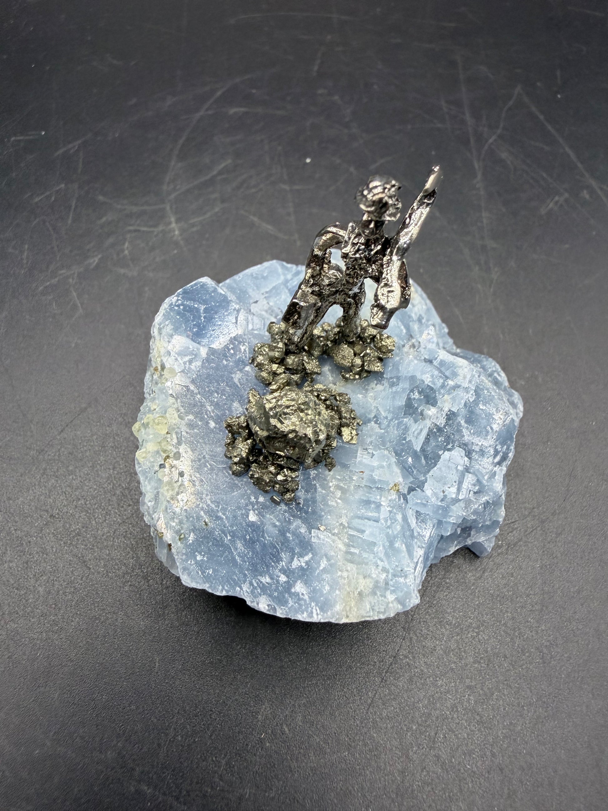 This unique Celestite crystal specimen features a detailed pyrite miner figure captured mid-work, standing beside a natural pyrite formation. The soft, calming blue tones of Celestite beautifully contrast with the metallic shimmer of pyrite, creating a charming and meaningful display.