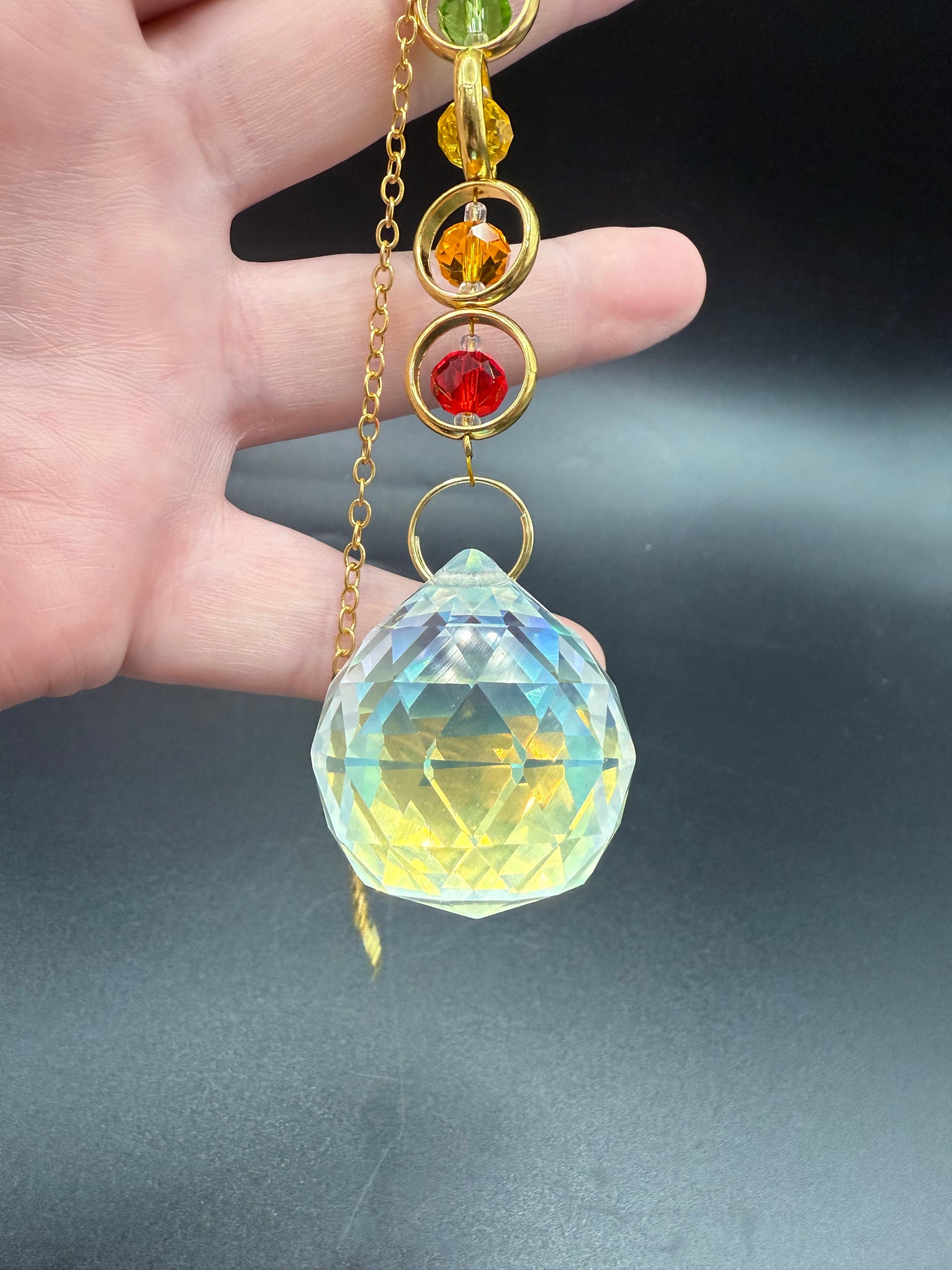 Bring light, color, and healing energy into your space with this Chakra Rainbow Suncatcher. Featuring a golden chain adorned with seven vibrant chakra-colored crystals and a large faceted prism ball, it creates dazzling rainbows when sunlight shines through.