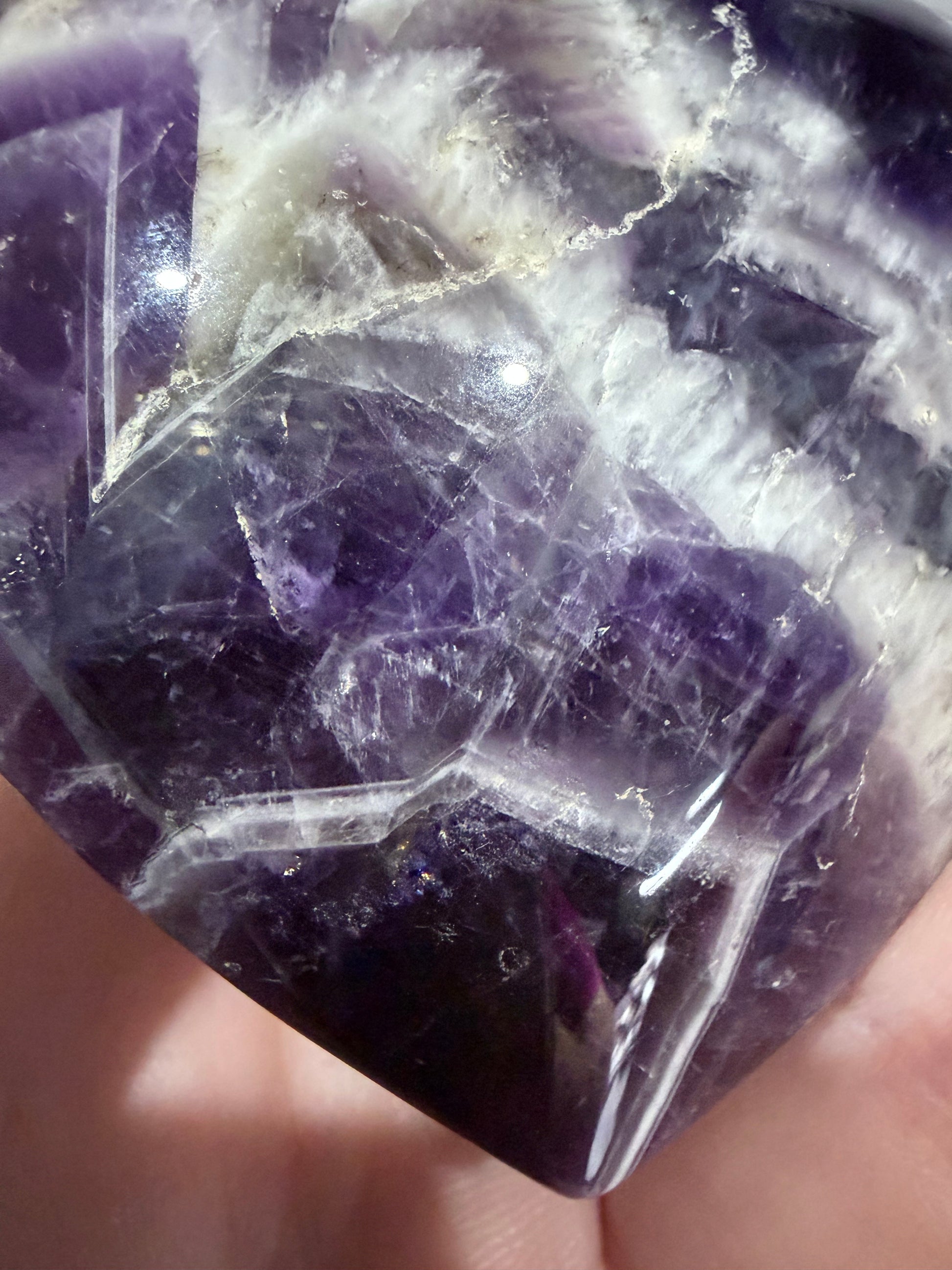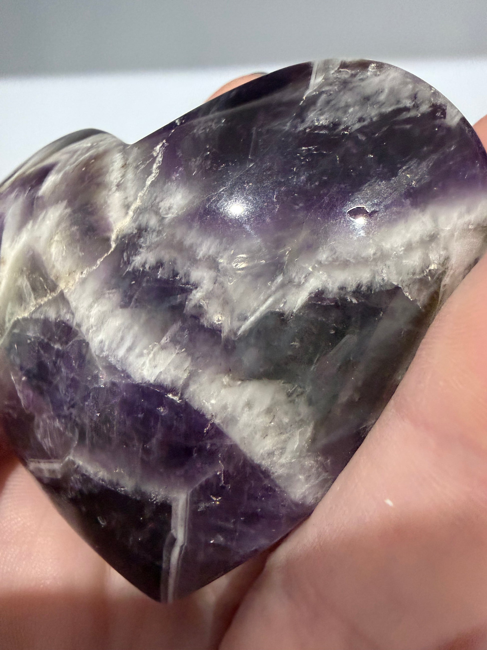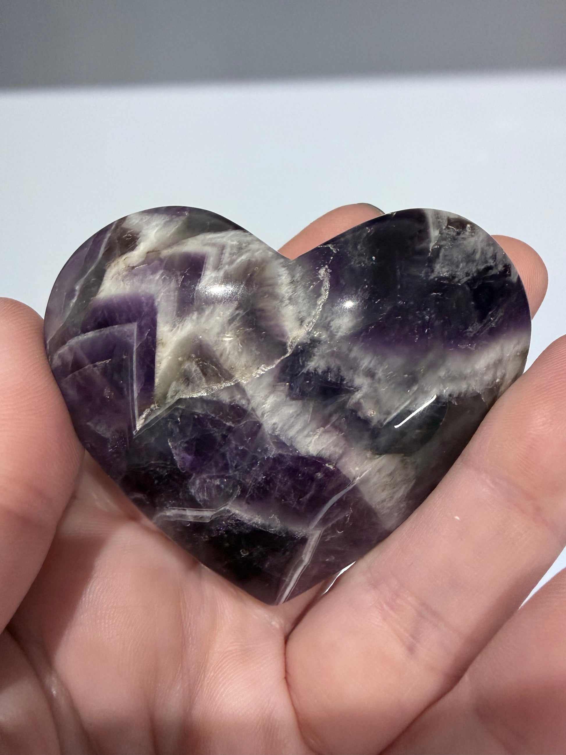 Chevron Amethyst, also known as Dream Amethyst, is believed to support intuition, clarity, and spiritual awareness while offering calming and protective energy. The heart shape adds a gentle, nurturing vibration, making this piece perfect for meditation, emotional balance, or keeping close as a pocket stone.