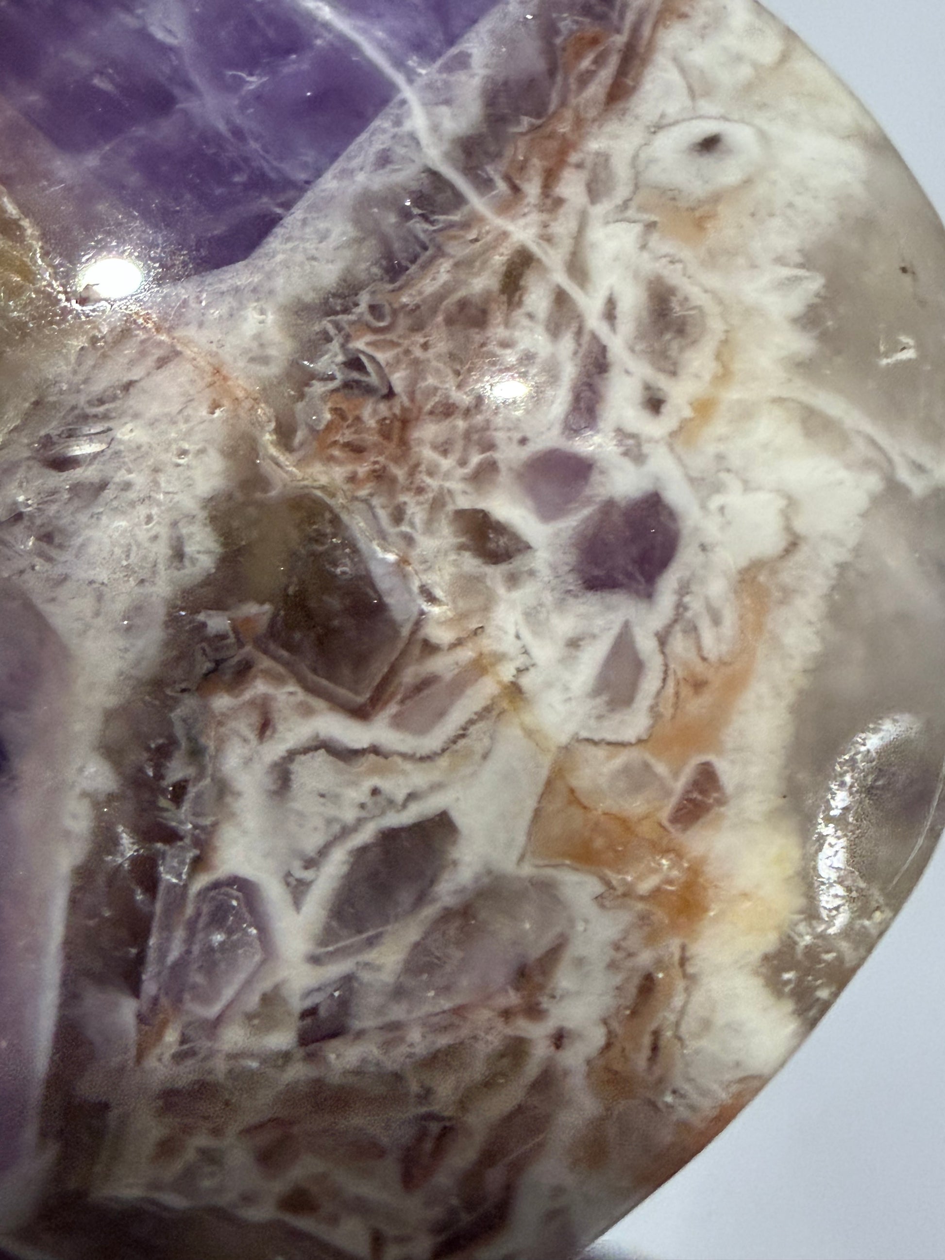 Chevron Amethyst is a combination of Amethyst and White (Milky) Quartz β the sharp V-shaped banding is a natural crystal formation and not agate. Carved into a heart shape, this piece carries calming, intuitive energy while making a striking display piece.