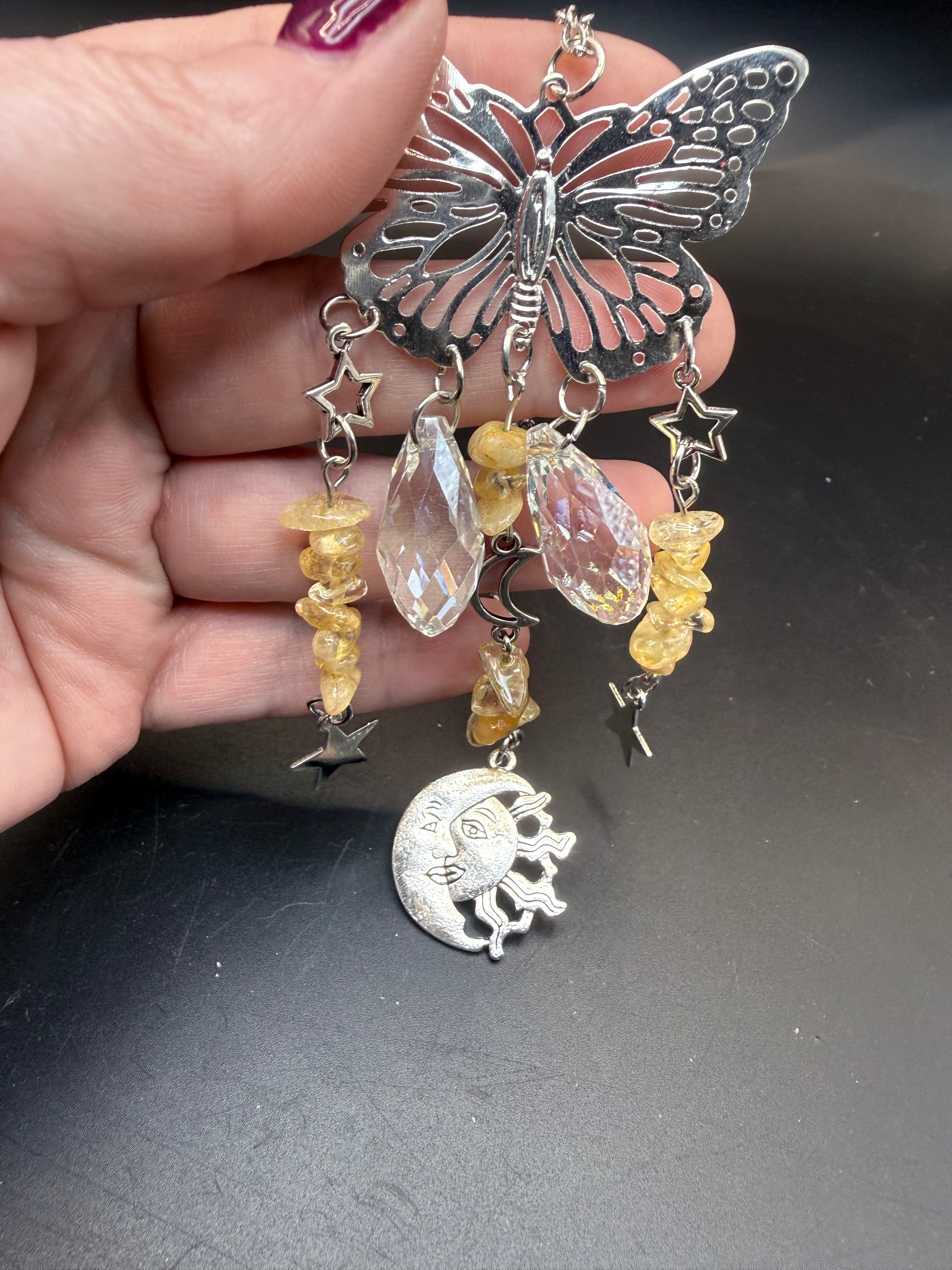 Design: Silver butterfly with citrine chips, faceted crystal teardrops, and celestial charms