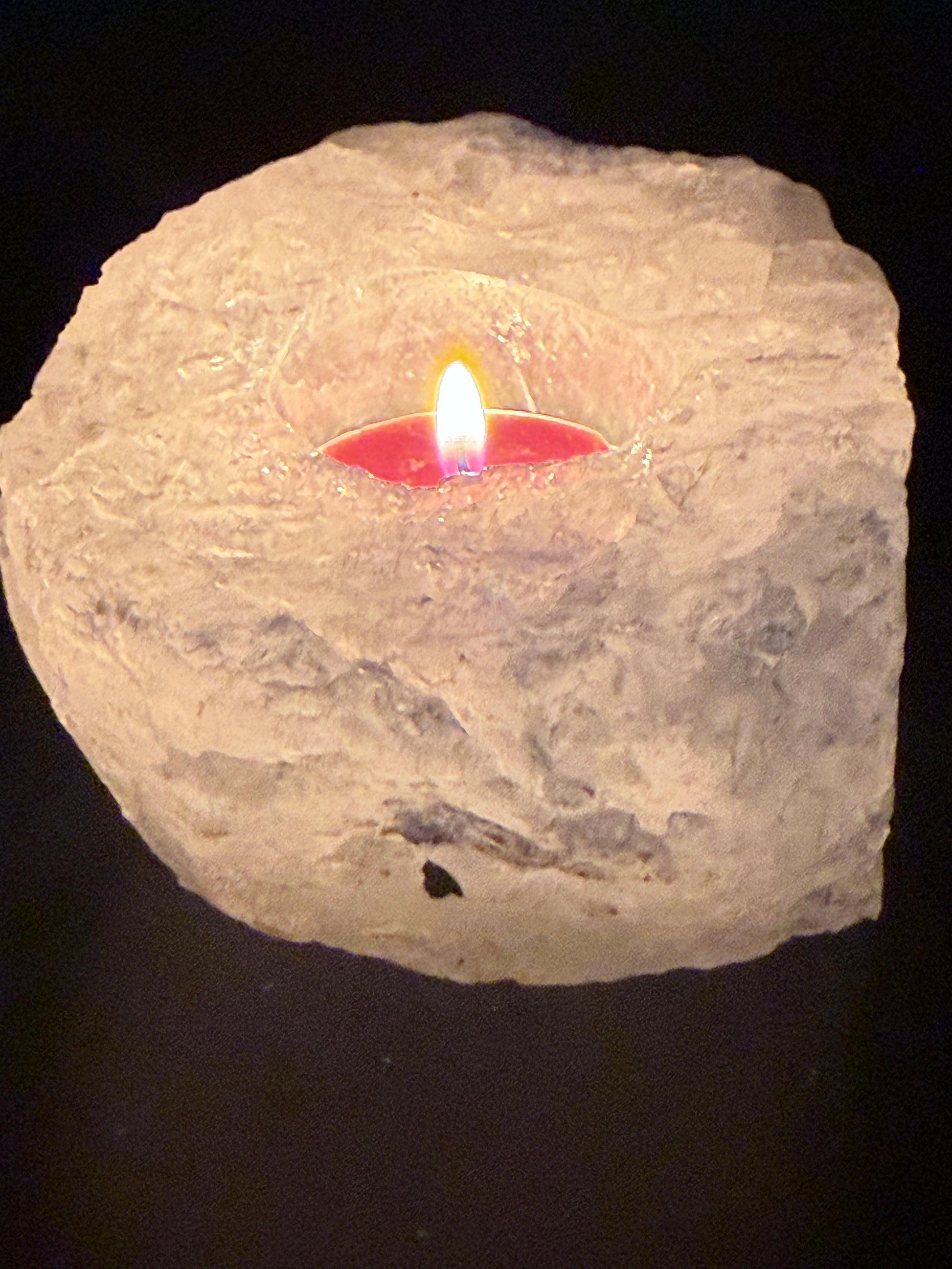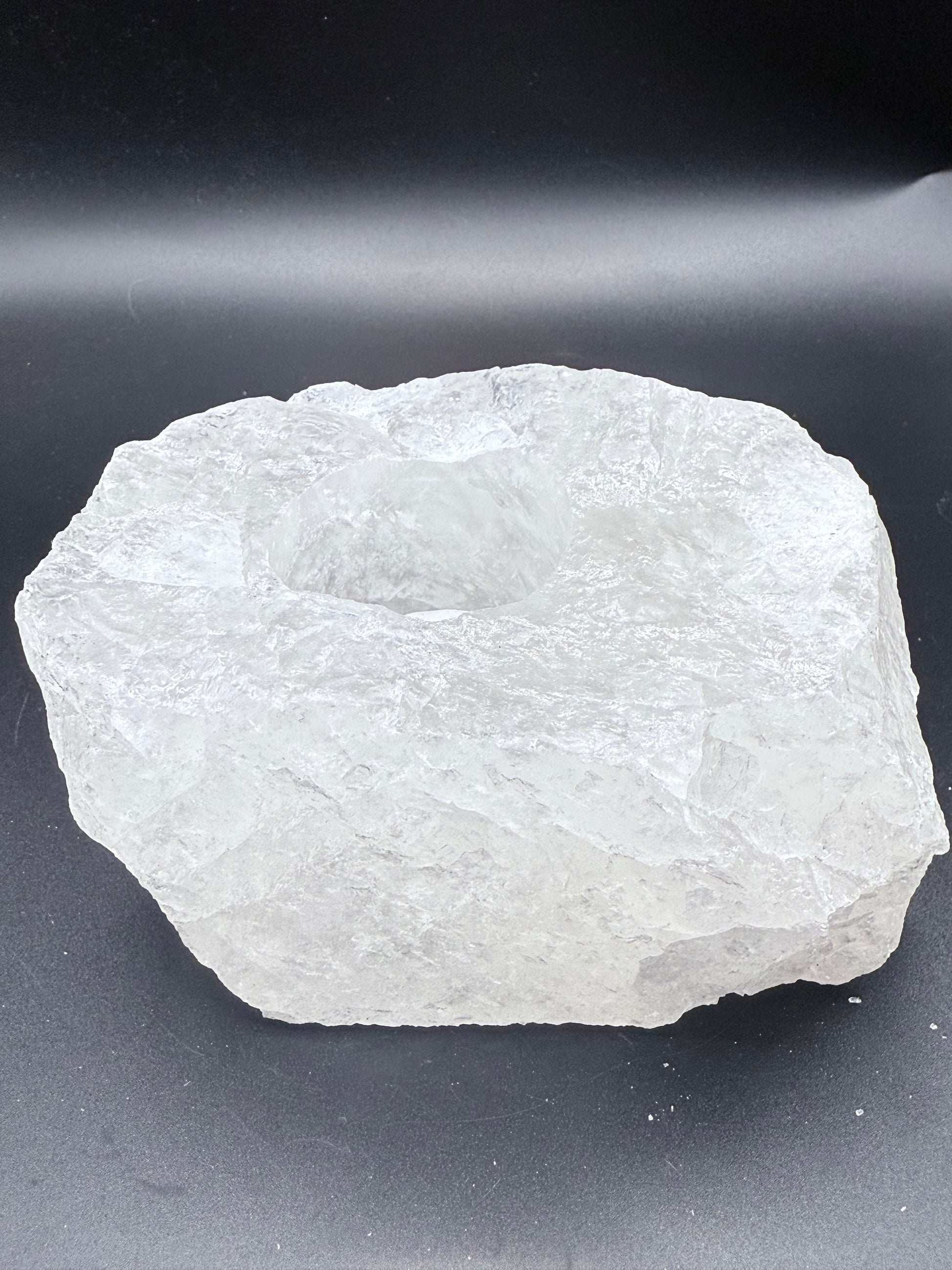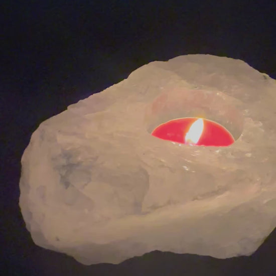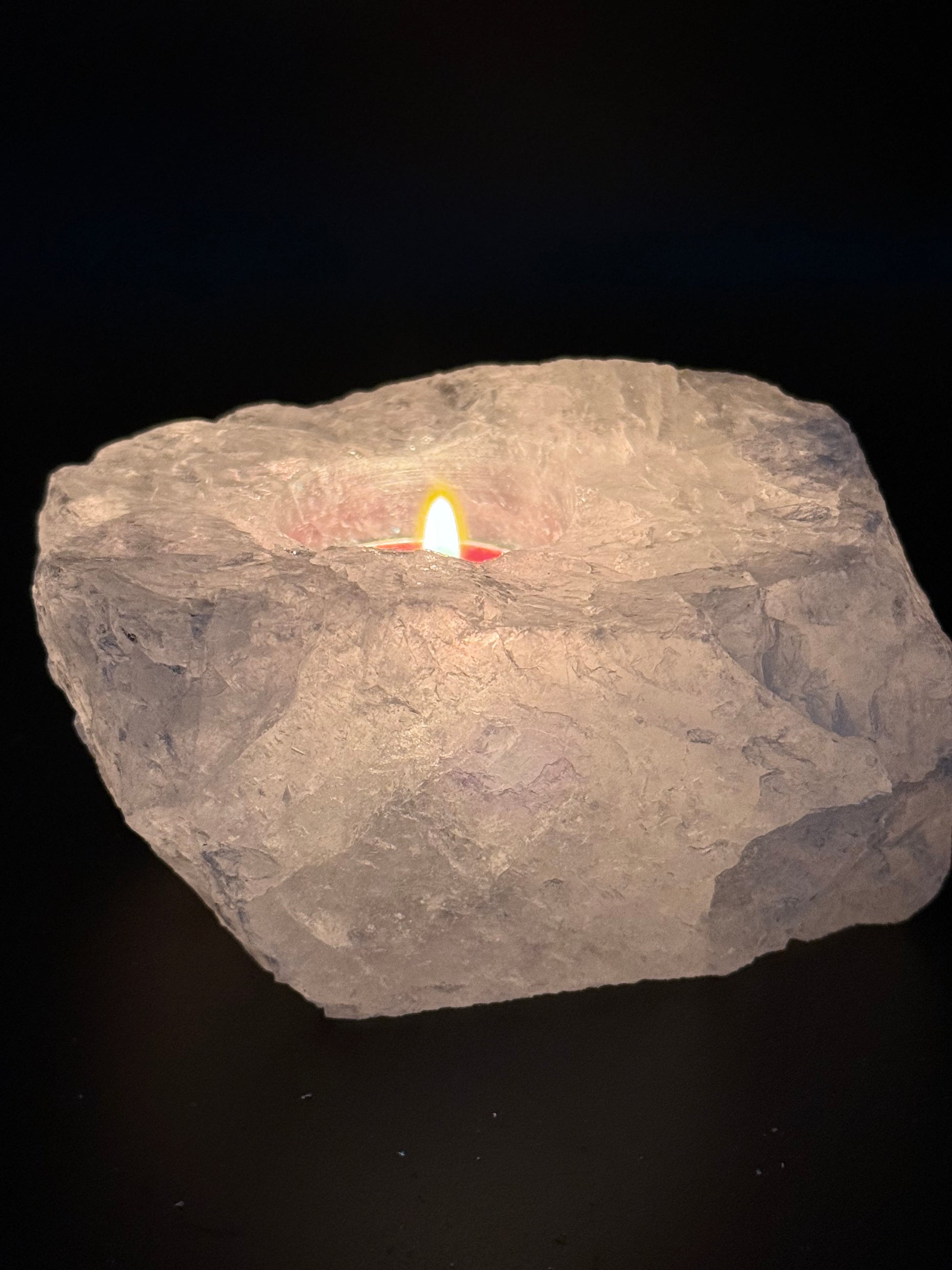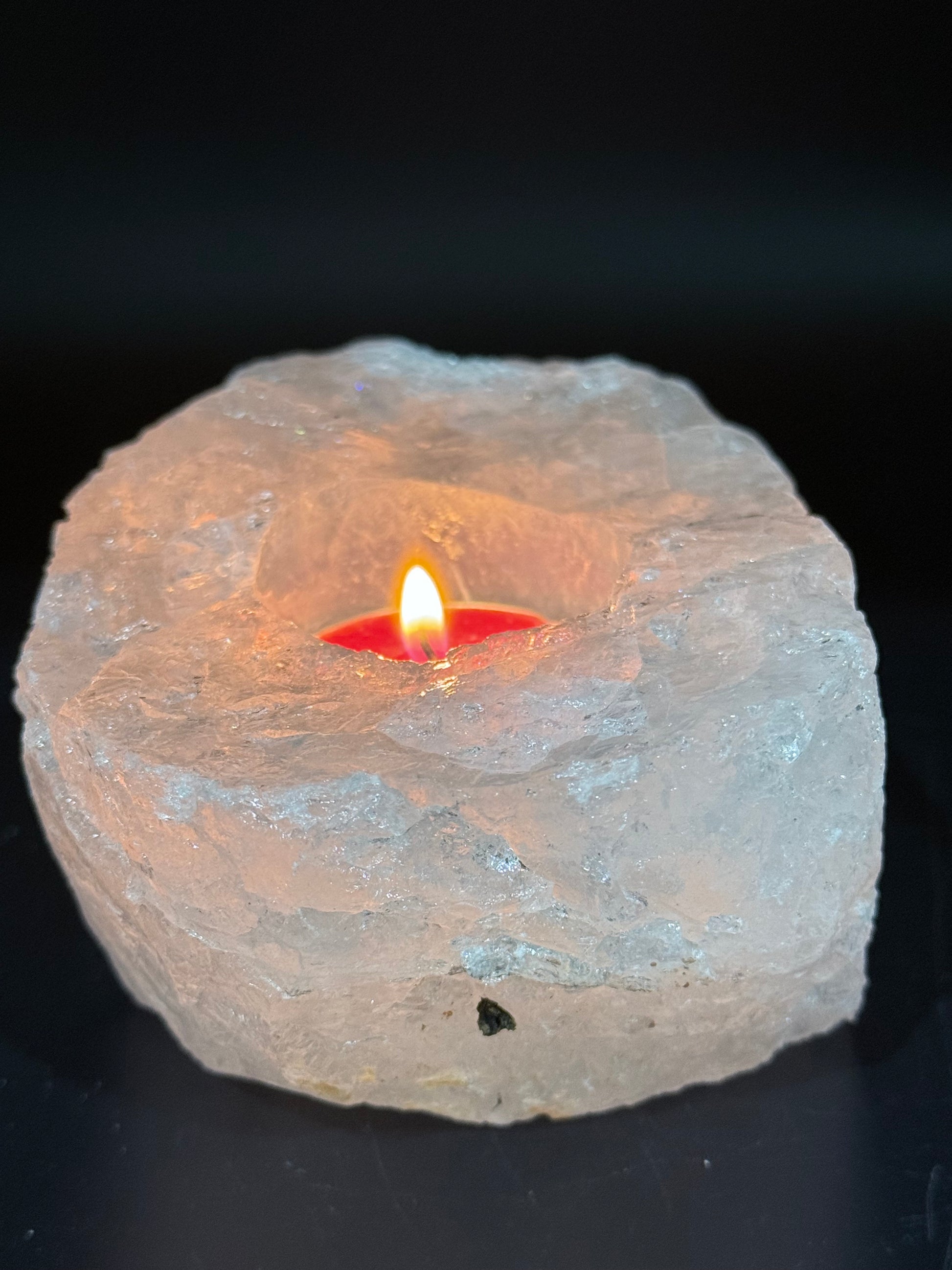 Bring pure, uplifting energy into your space with this chunky raw Clear Quartz candle holder. When lit, it reveals stunning internal rainbows and natural inclusions, glowing beautifully from within.