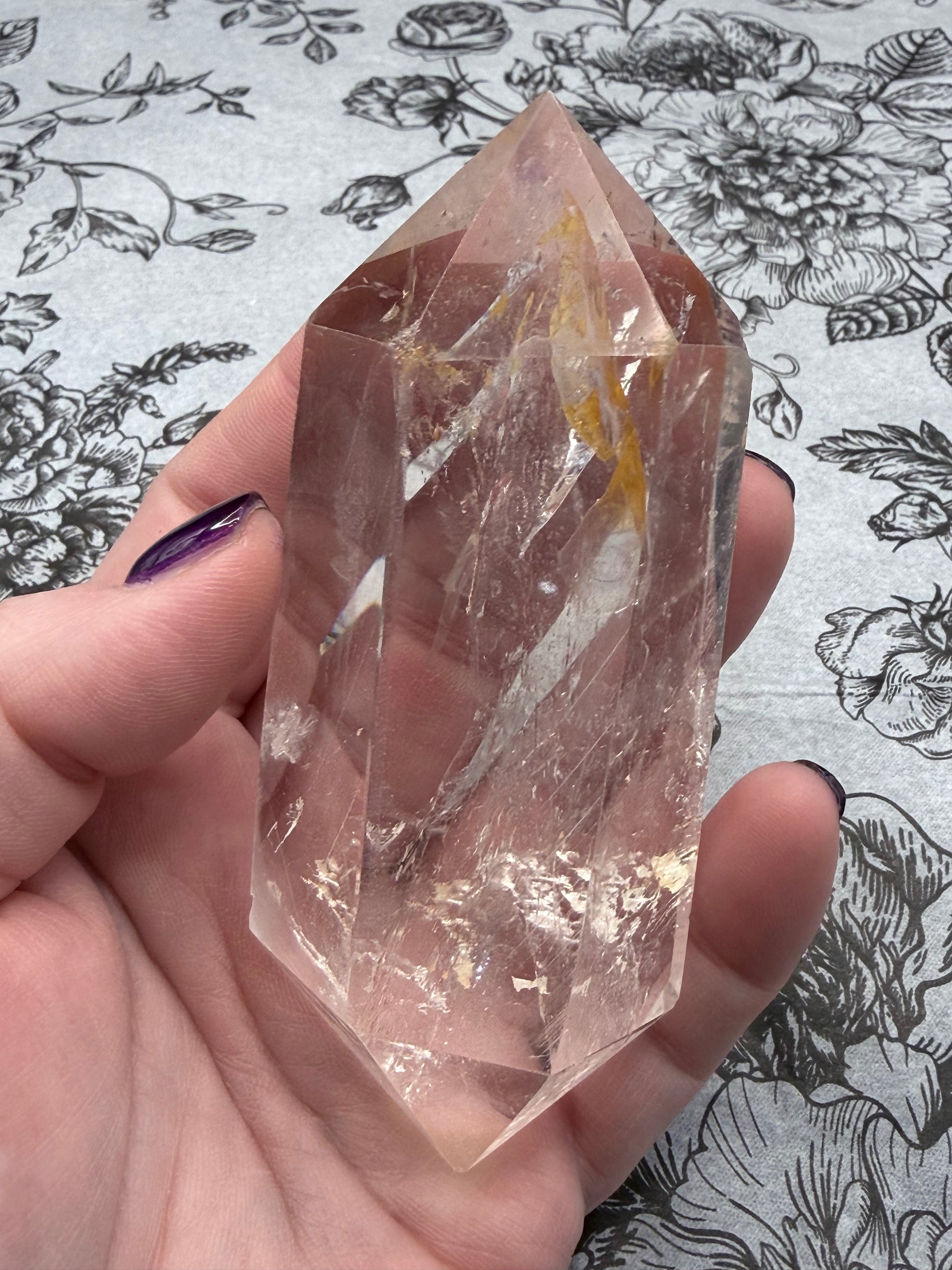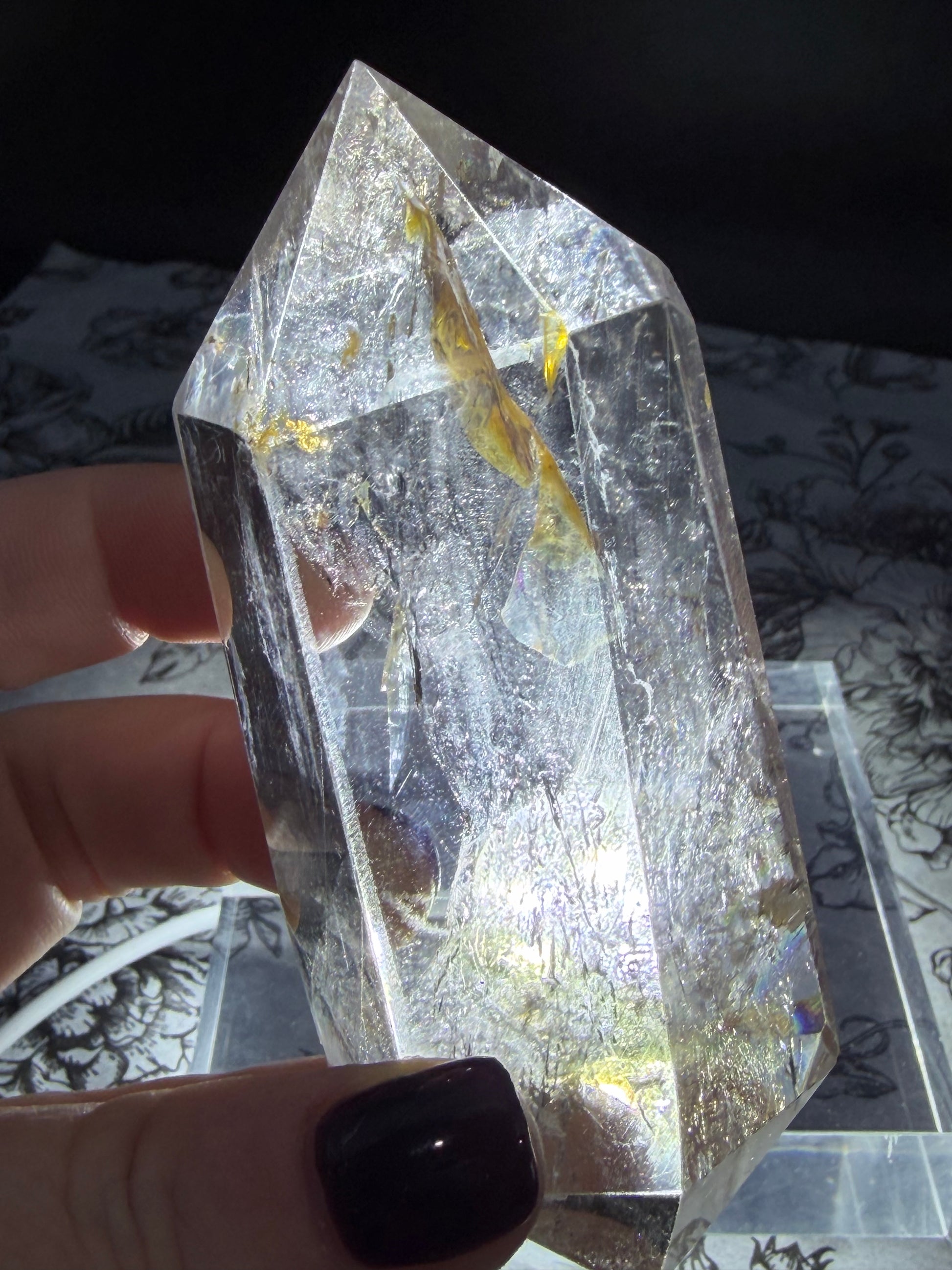 This gorgeous Clear Quartz point features a stunning Golden Healer inclusion running through the crystal, creating a beautiful honey-gold “flame” effect inside. It also flashes a rainbow when the light hits just right, giving this piece serious WOW factor.