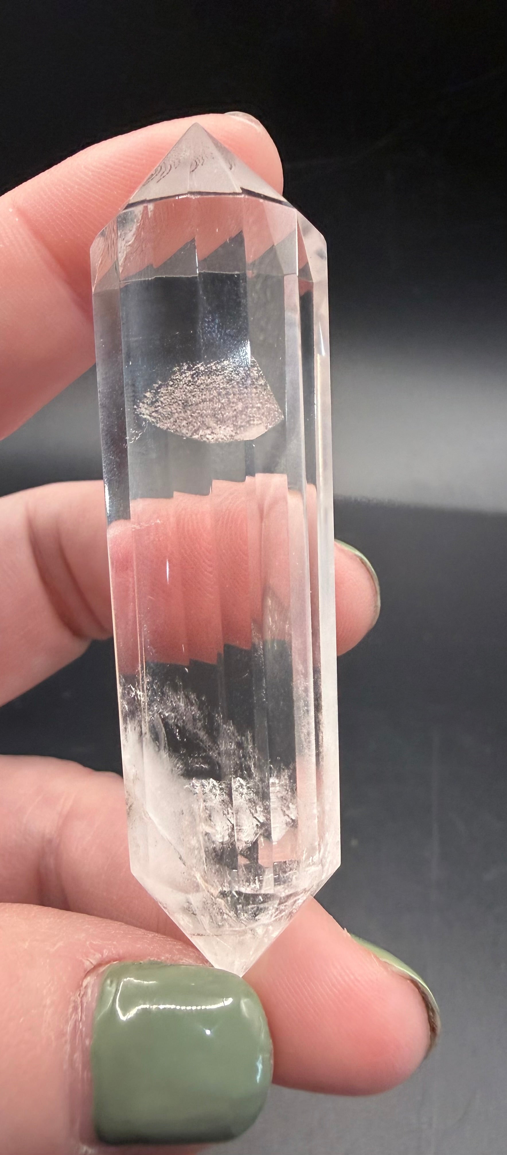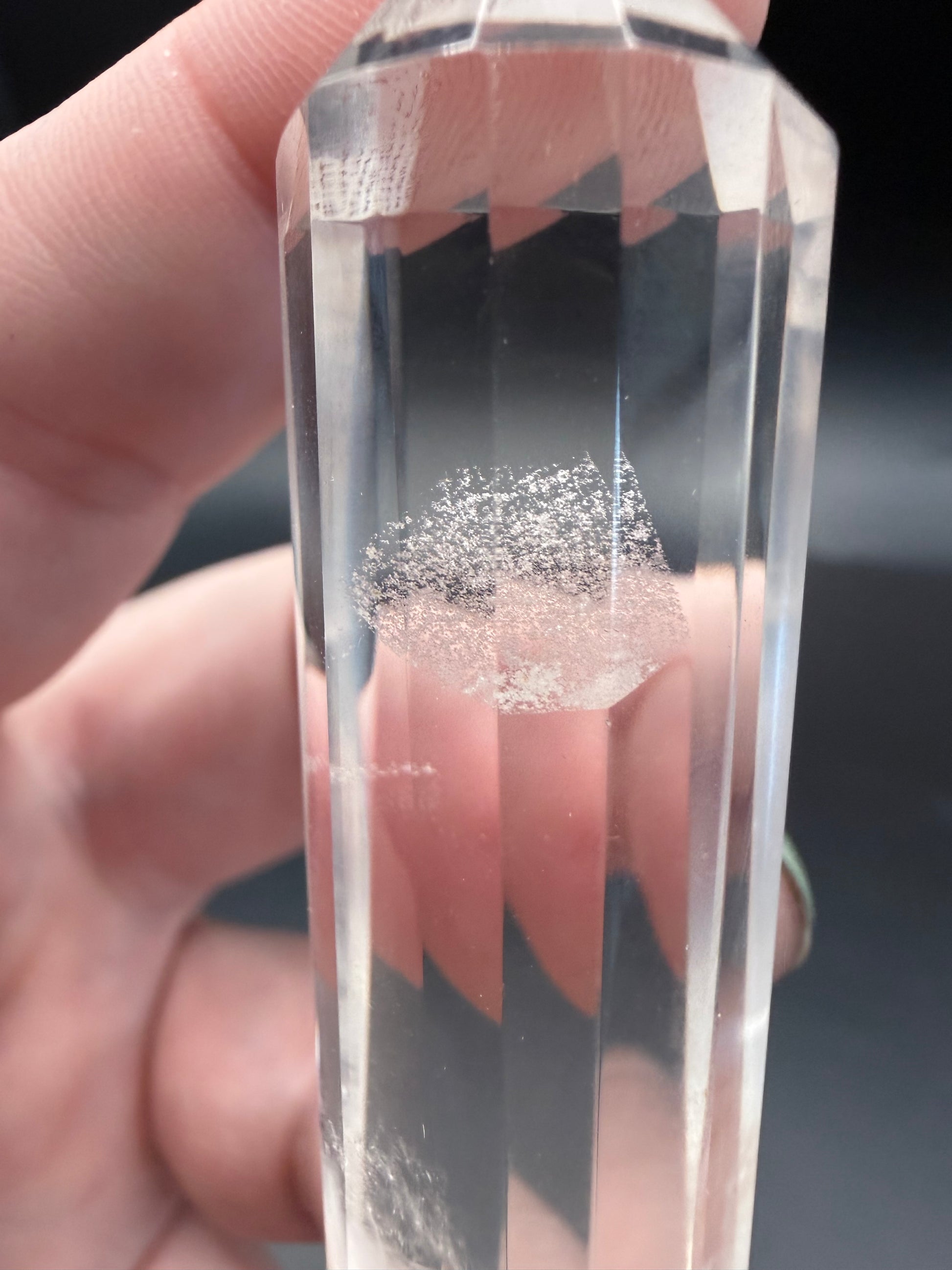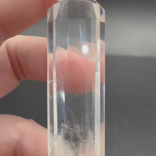 This highly faceted (approx. 16 sides) Clear Quartz Vogel Wand is a beautifully crafted energy tool, designed to channel, amplify, and direct pure crystal energy. Its exceptional clarity and intricate faceting create stunning rainbows and light reflections that enhance its energetic flow.