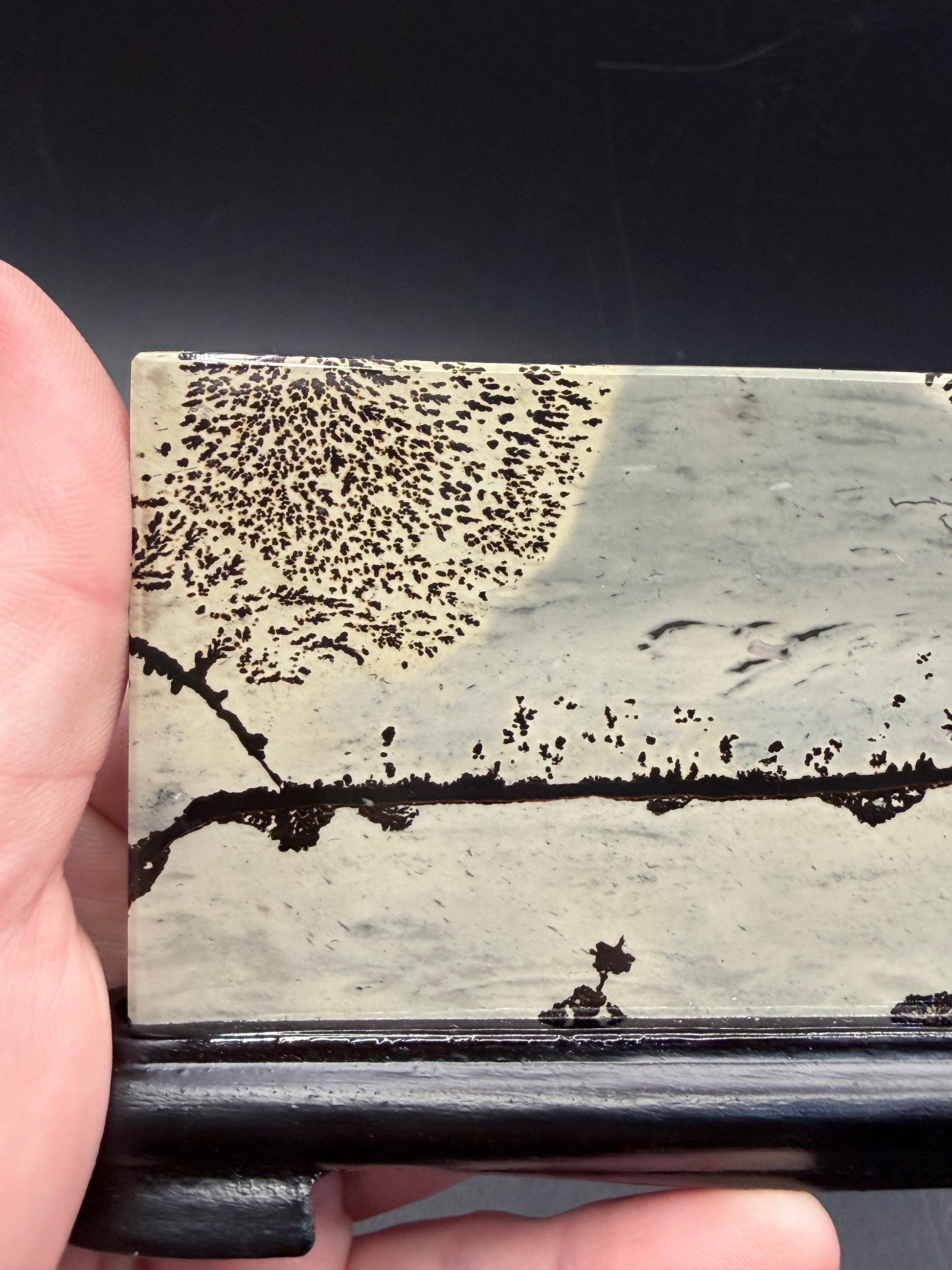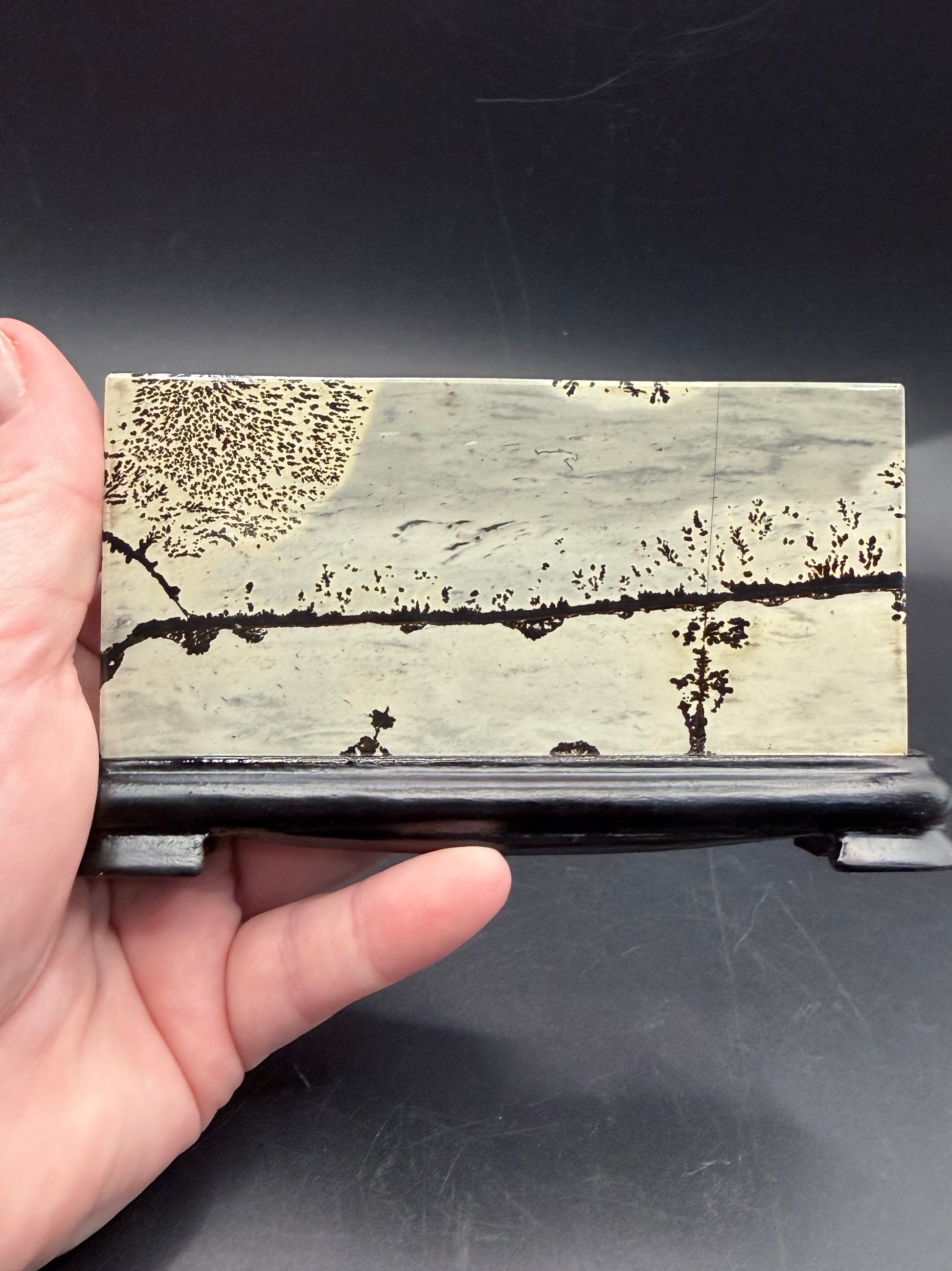 The contrast between the soft stone background and dark dendritic markings makes this a truly eye-catching display piece.