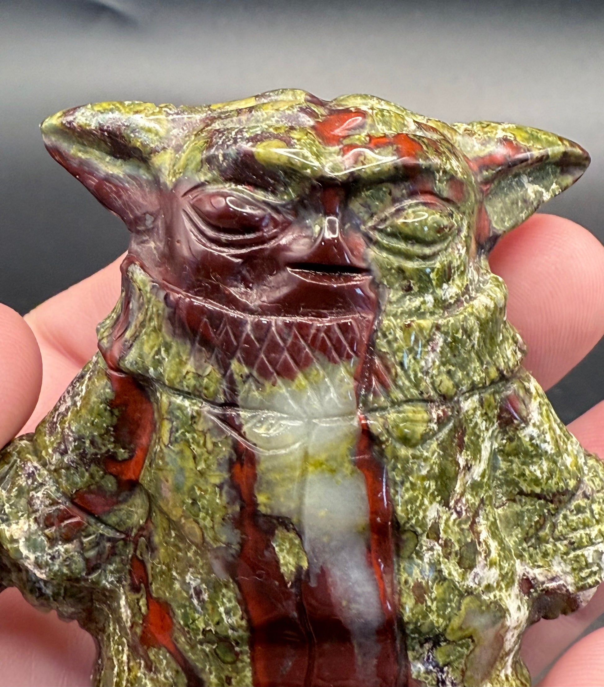 This incredible hand-carved Baby Yoda (Grogu) is made from Dragons Blood Stone, weighing 150g and standing 5.7cm tall. With its striking mix of green and red tones, this piece is both mystical and powerful ā the perfect fusion of Star Wars magic and crystal energy šš
