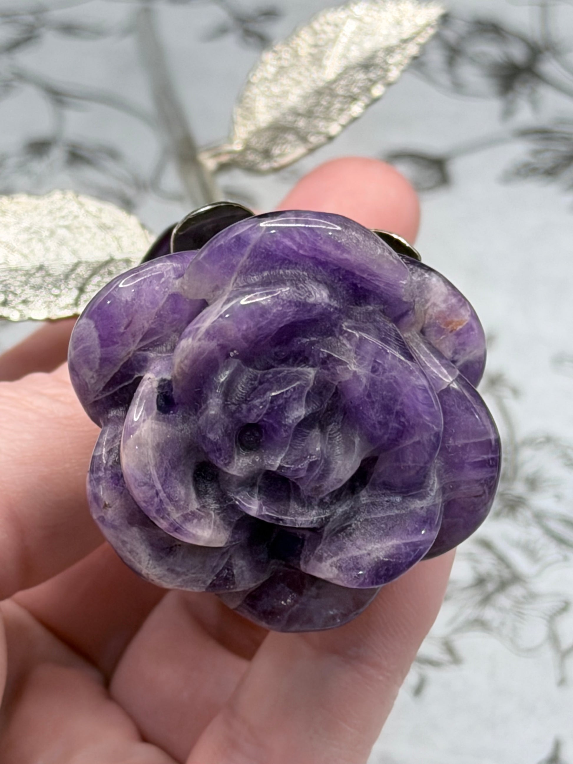 Carved from dreamy purple-and-white amethyst and set on a silver-toned metal stem with detailed leaves, this piece is perfect for crystal décor, gifting, or adding a romantic touch to an altar or bedside.