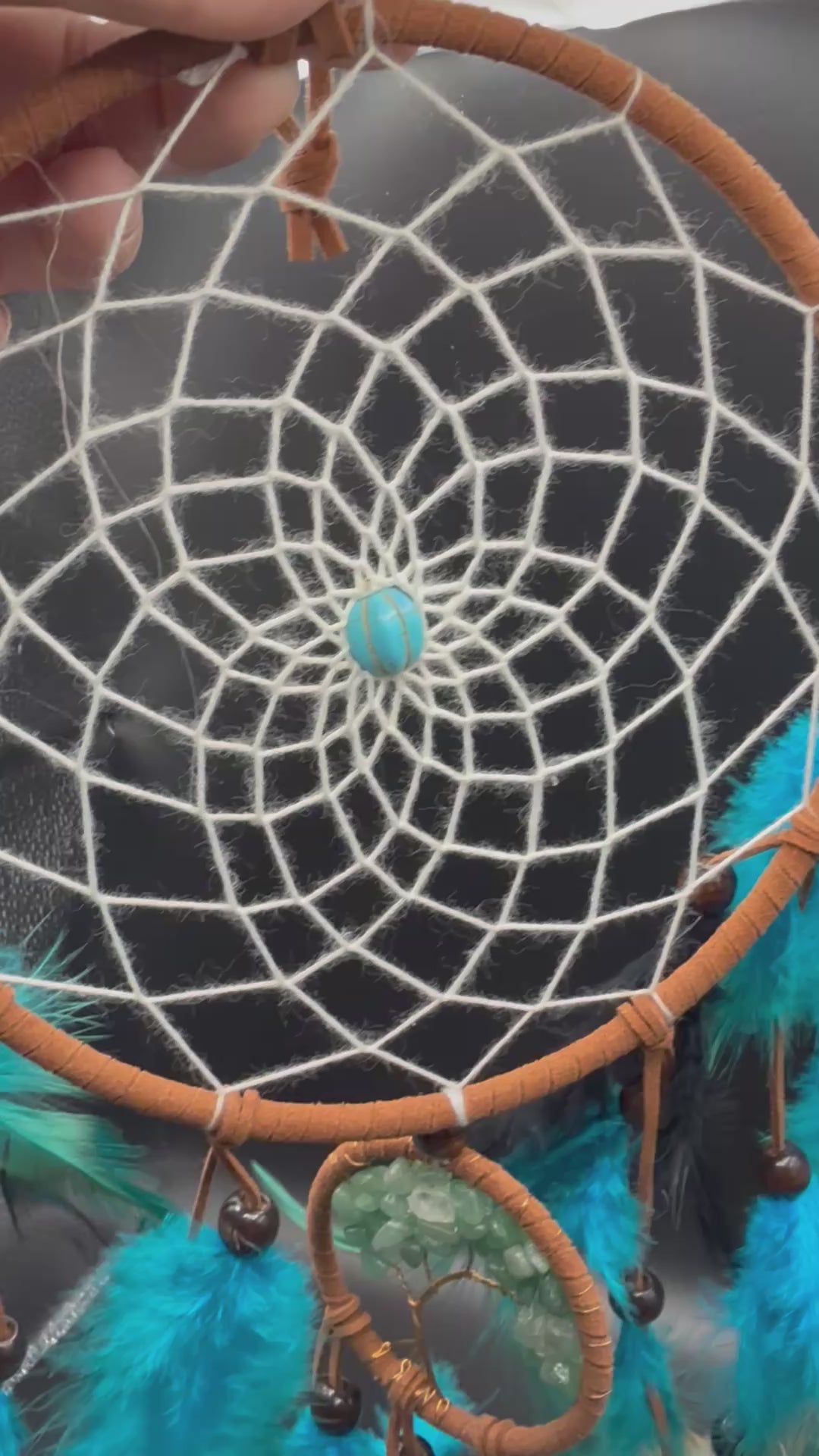 This stunning handcrafted dreamcatcher combines vibrant turquoise & earthy-toned feathers with natural crystal energy. At the heart of the design sits a Tree of Life woven with Green Aventurine chips, symbolizing growth, healing, and abundance.