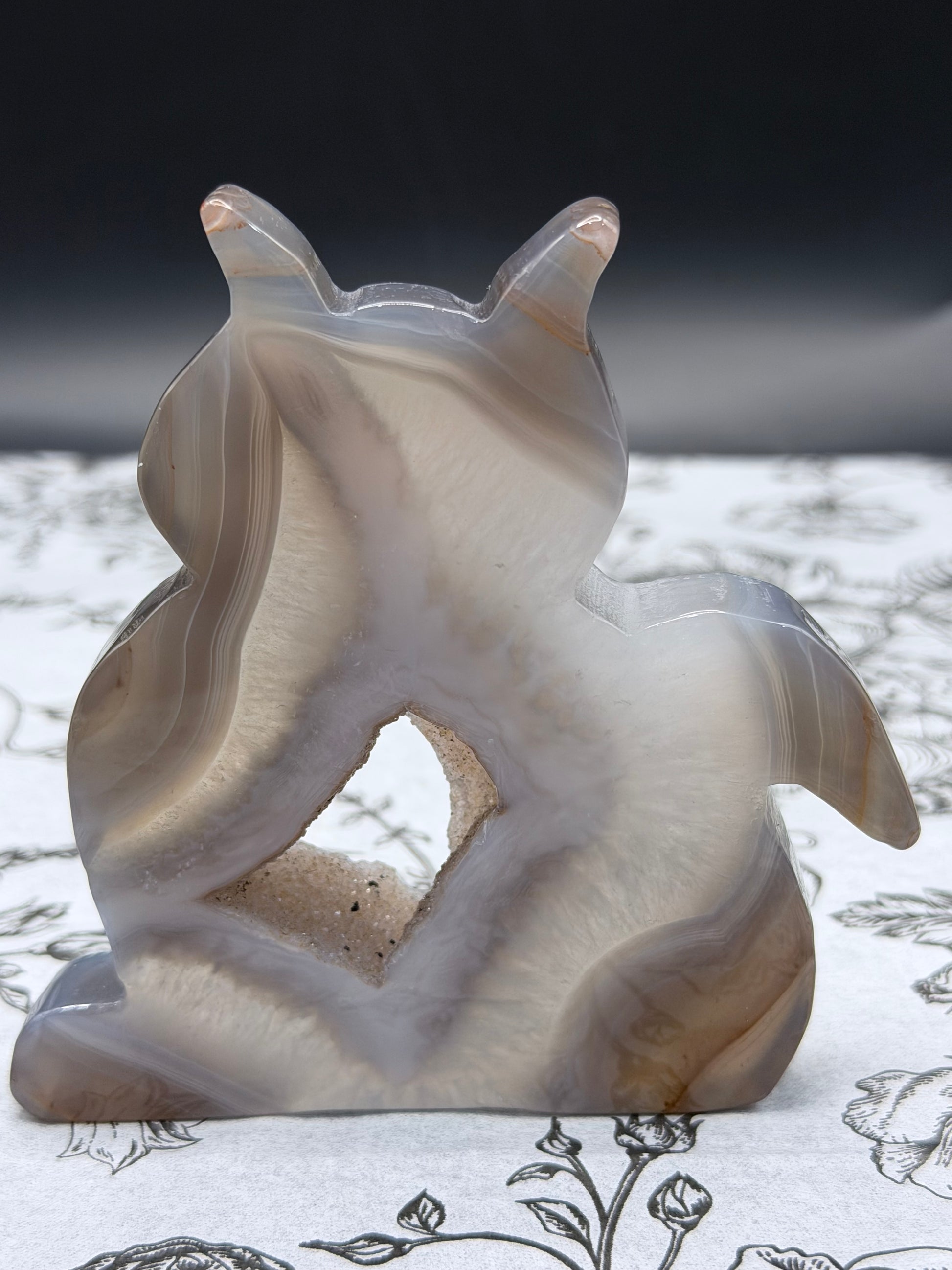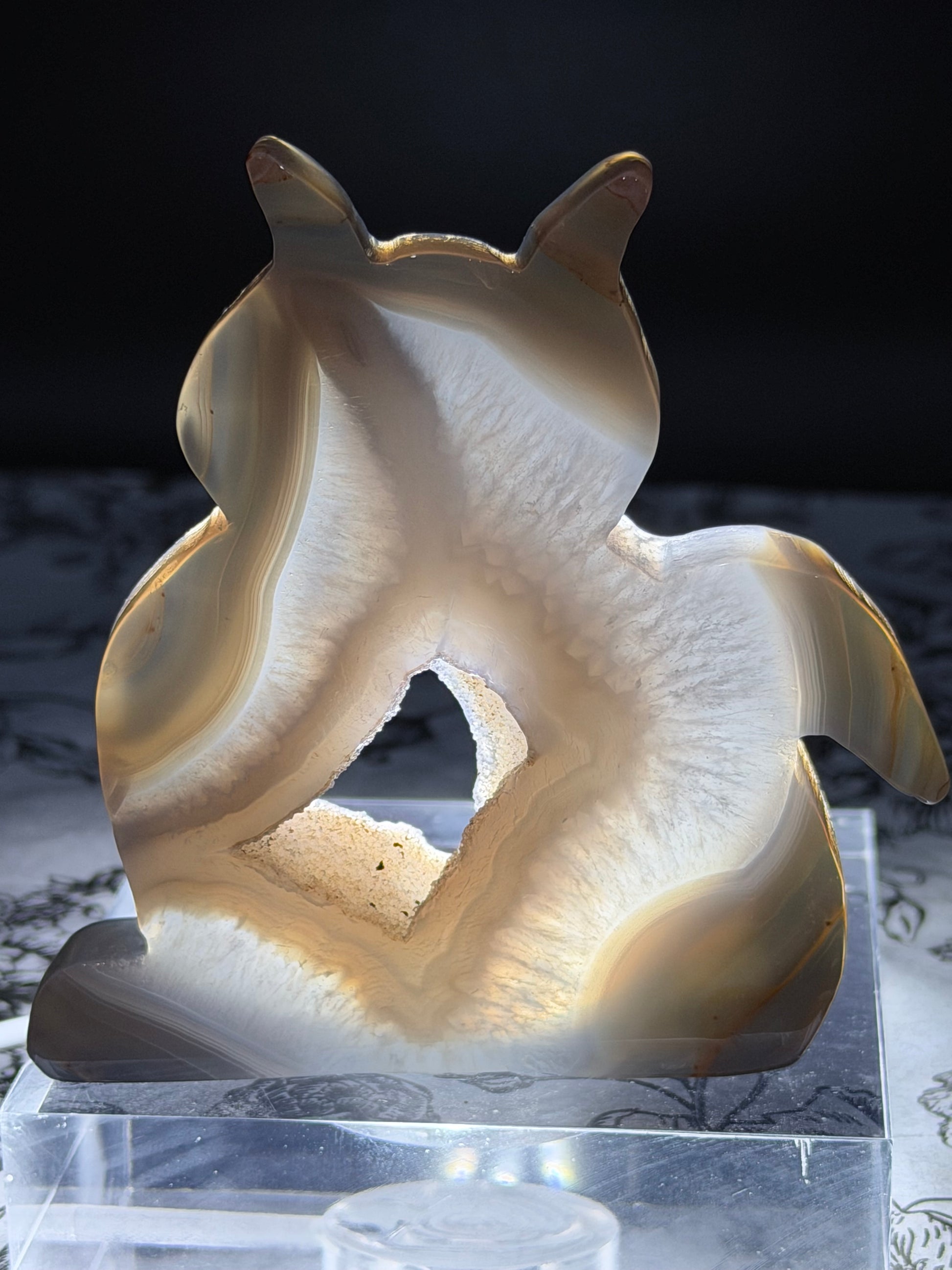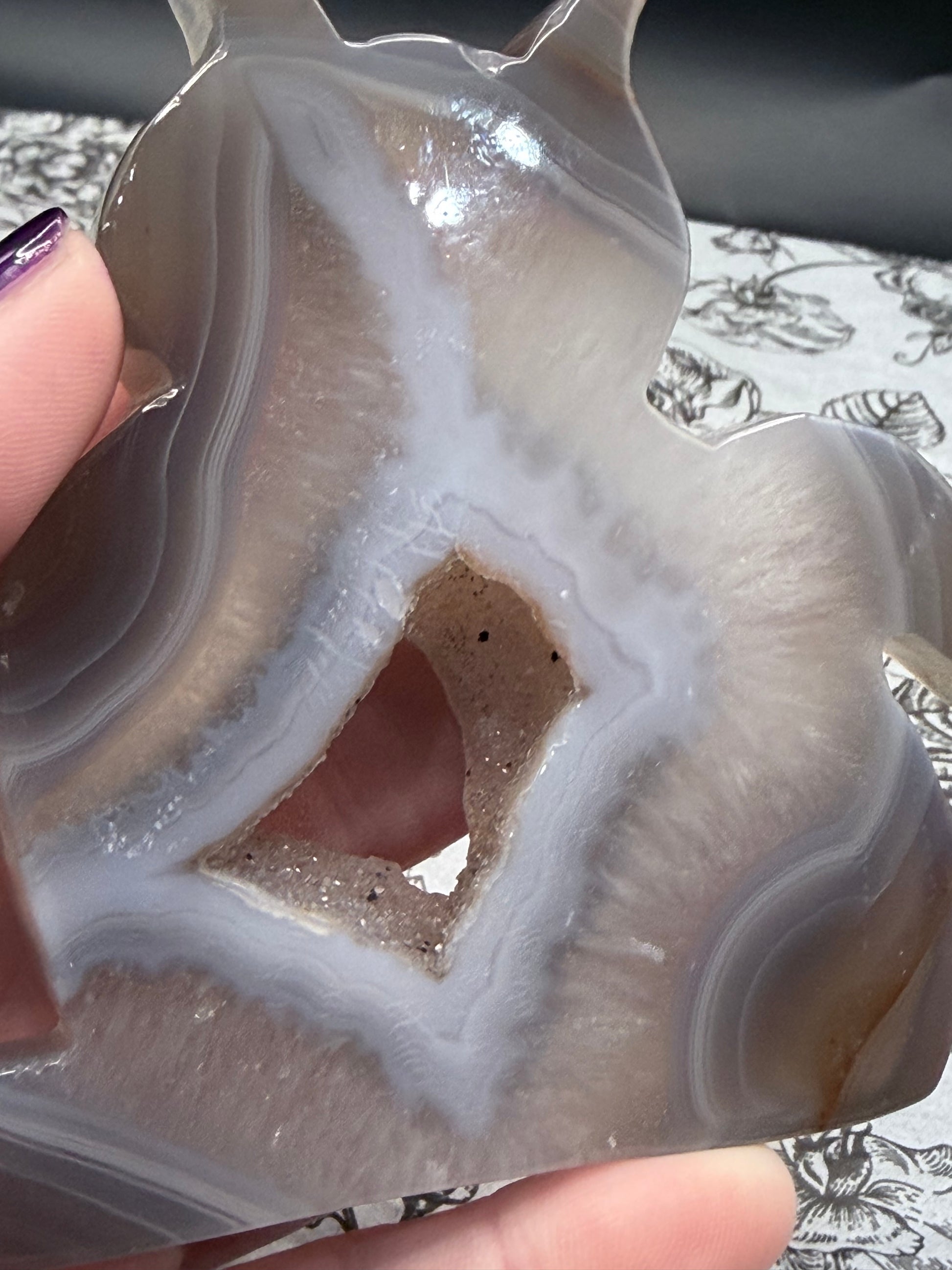 Such a unique piece! This Banded Agate Cat features a gorgeous natural banding in soft grey, cream and warm earthy tones, with a sparkling druzy quartz “geode window” cut right through the centre ✨