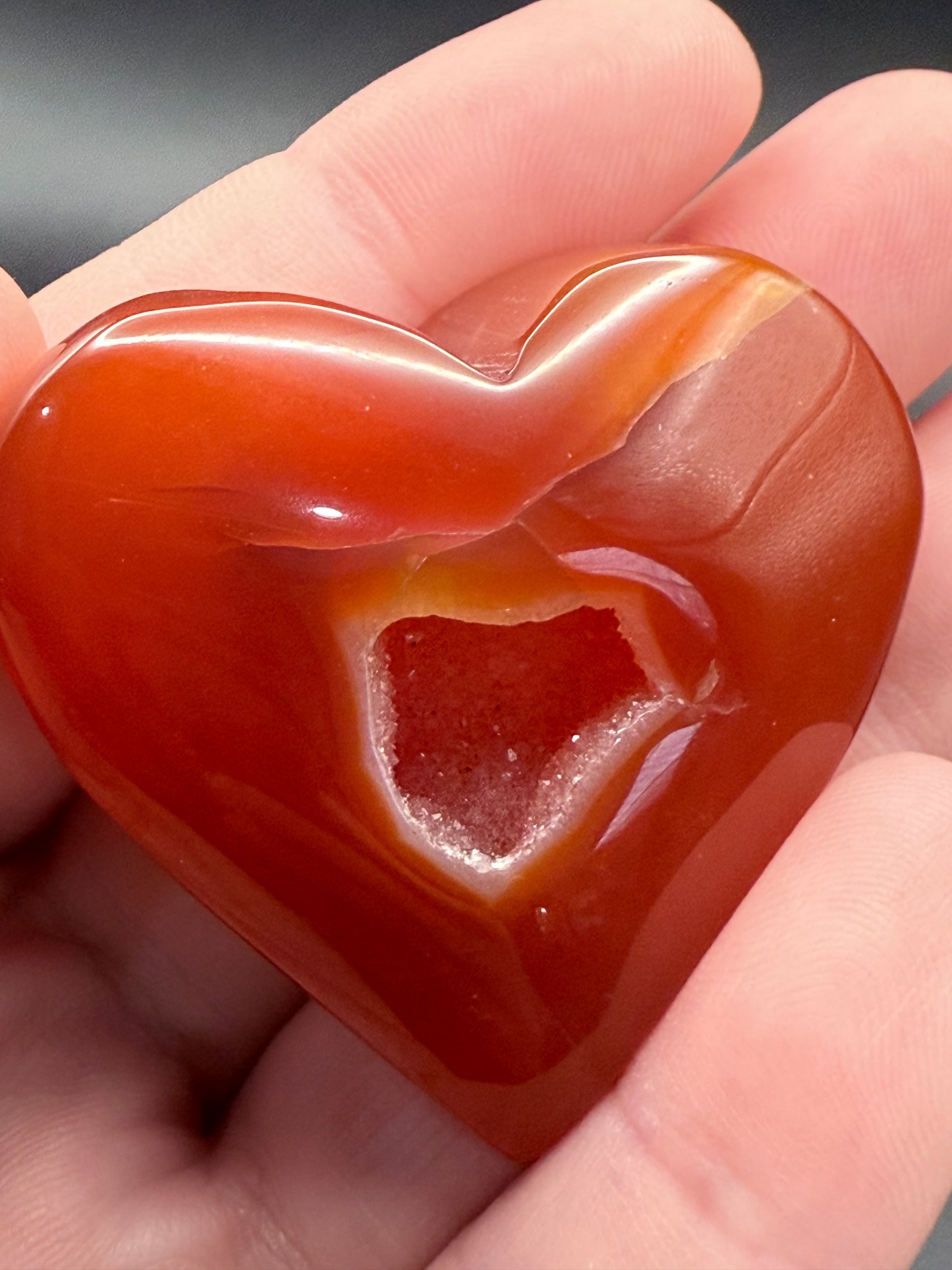 This stunning hand-carved Carnelian heart glows with fiery orange and deep red hues, radiating warmth and vitality. At its center lies a natural druzy pocket – a sparkling cluster of tiny quartz crystals formed over millions of years – adding both beauty and amplified energy.