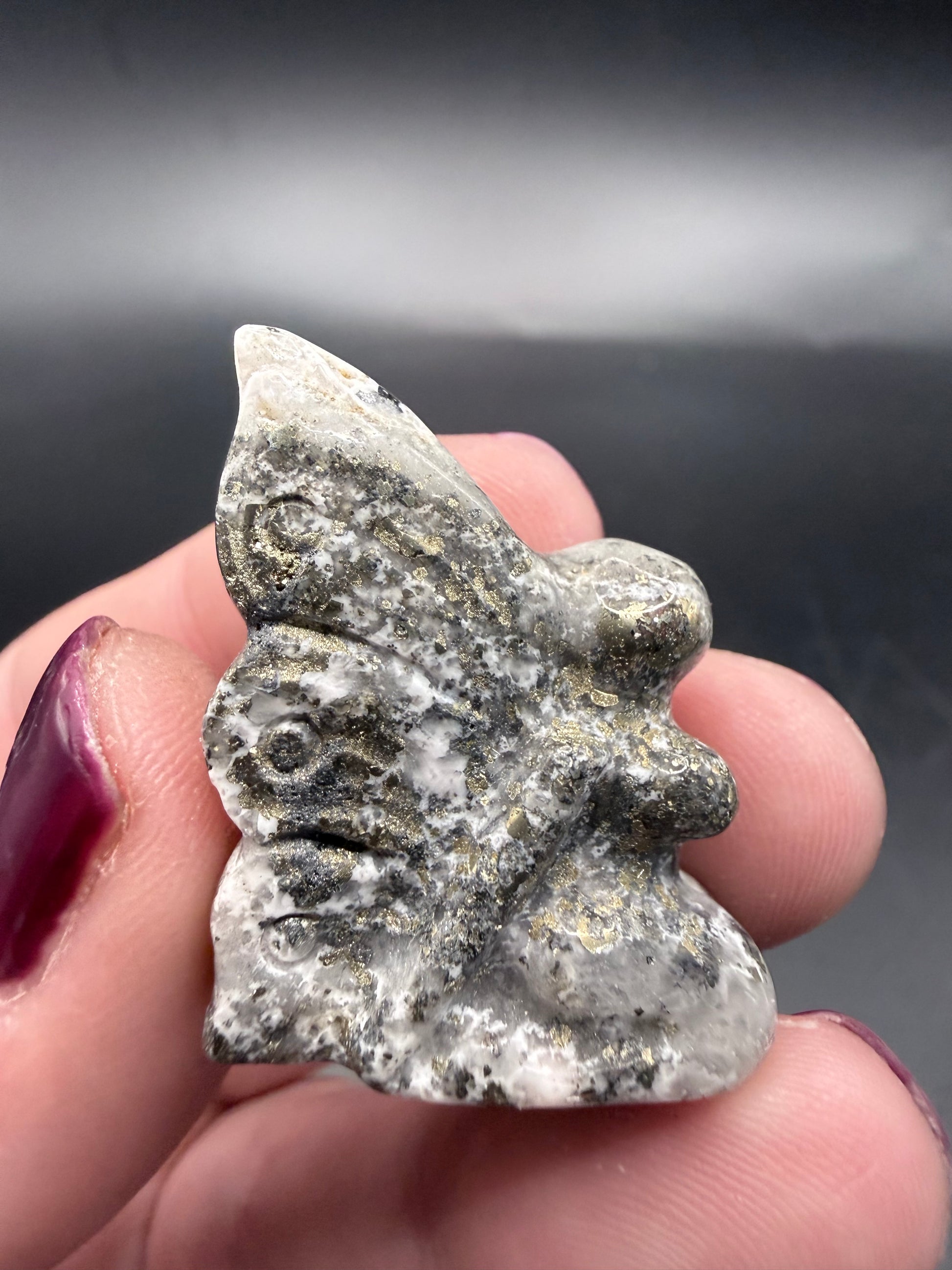 Golden and shimmering, Pyrite is a stone of prosperity and empowerment. It shields against negativity, boosts confidence, and encourages success and manifestation. A strong, grounding fairy full of protective energy.