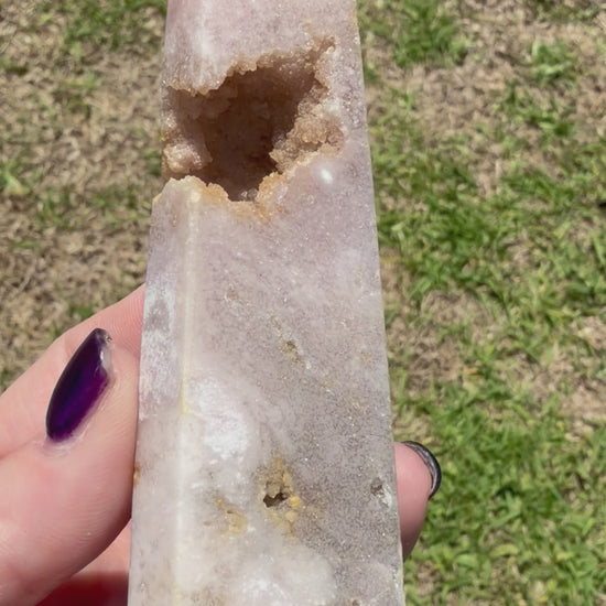 🌸 This stunning Flower Agate tower features soft blush, lavender-pink, and milky tones with beautiful cherry-blossom style formations throughout. What truly sets this piece apart is the large natural druzy crystal cave, filled with sparkling champagne-coloured quartz that glitters beautifully in the light ✨