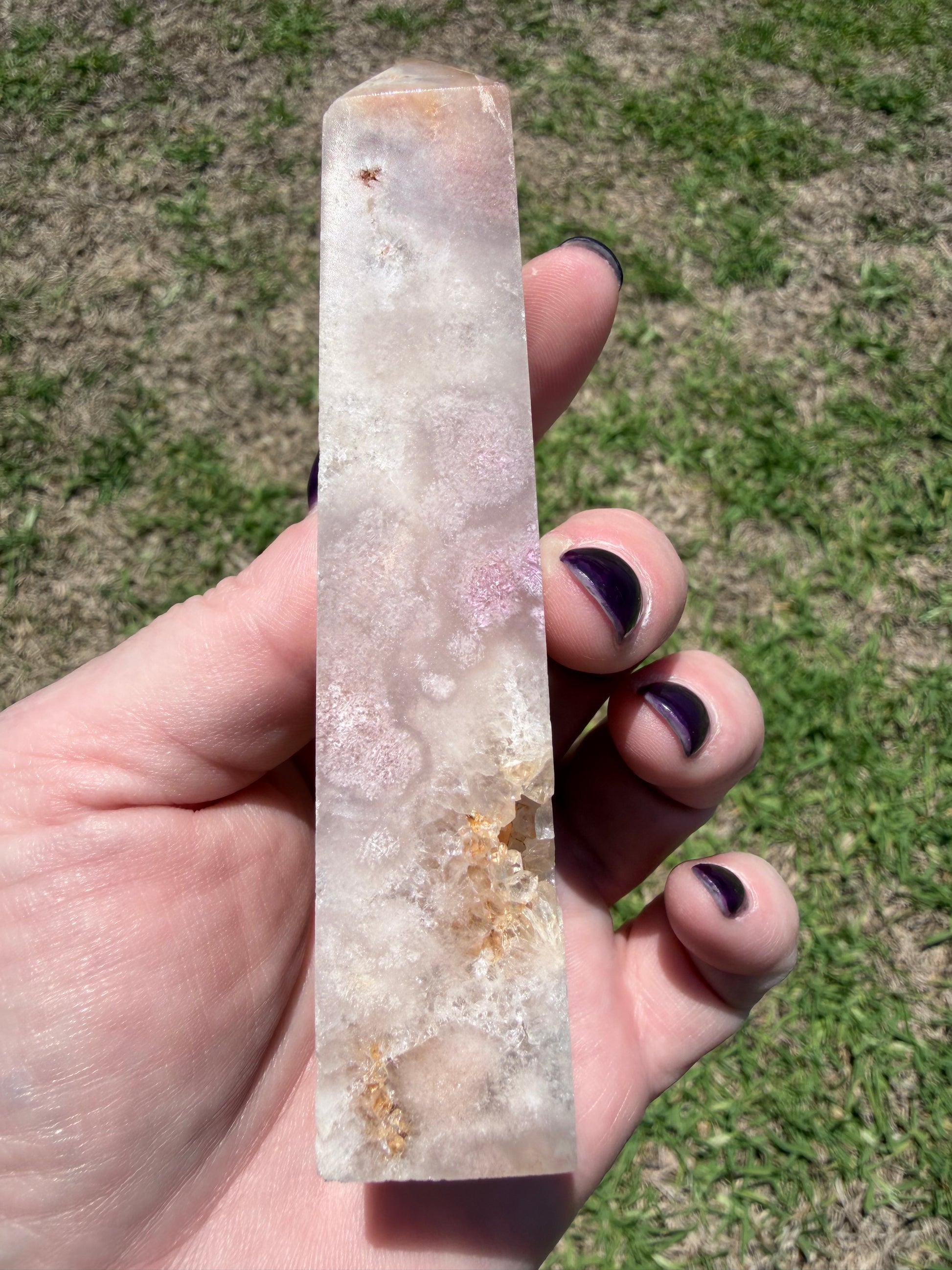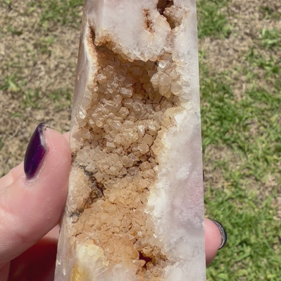 🌸 This beautiful Flower Agate tower features soft milky white and blush tones with natural cherry-blossom style plumes throughout. What makes this piece extra special are the natural druzy crystal pockets, sparkling with champagne-honey quartz crystals that catch the light beautifully ✨