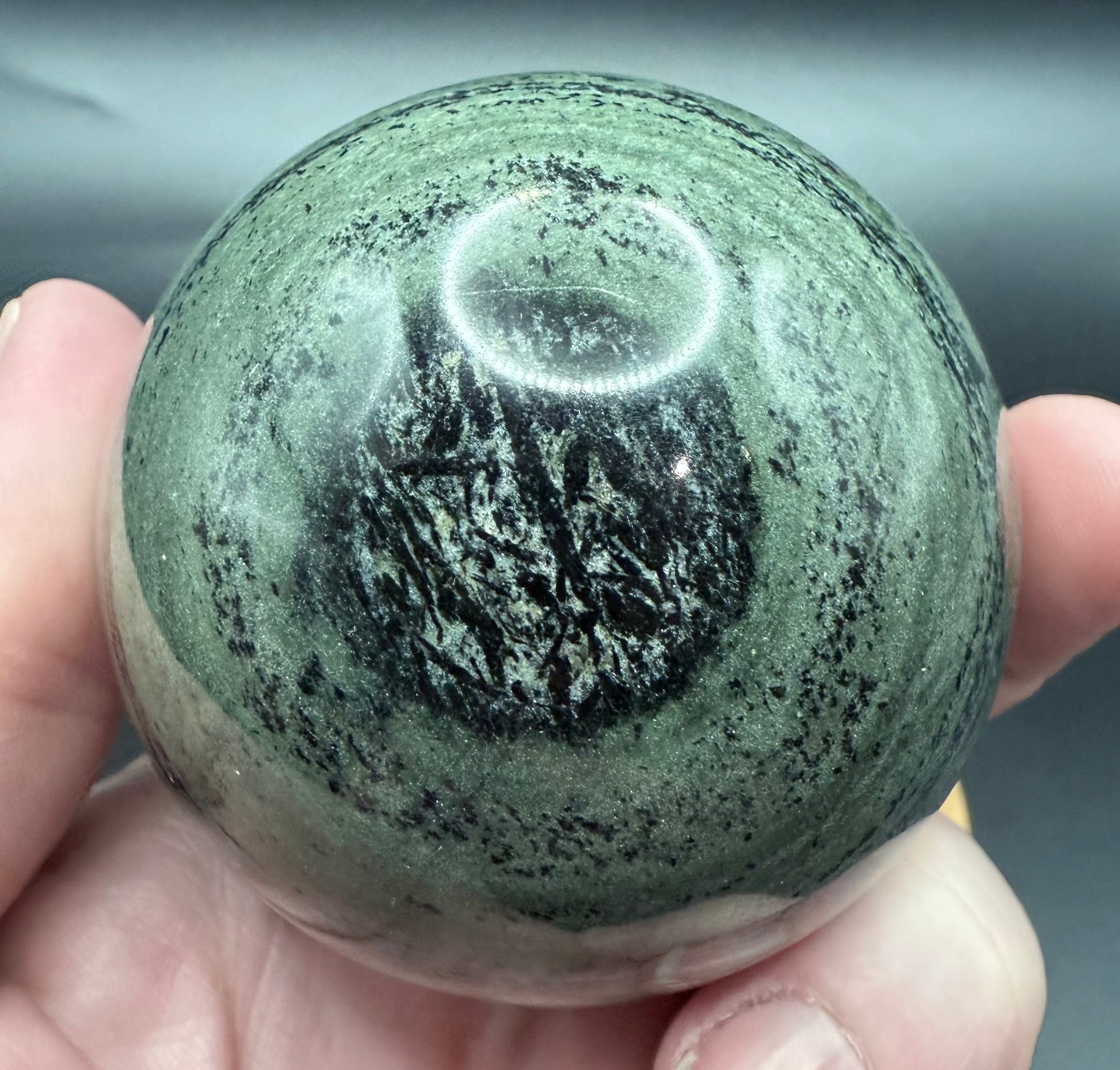 This mesmerizing Green Hair Jasper Sphere features fine, fibrous streaks of deep green with striking black banding, resembling flowing strands of hair through stone. A beautiful piece to display and a deeply grounding stone for energy work.