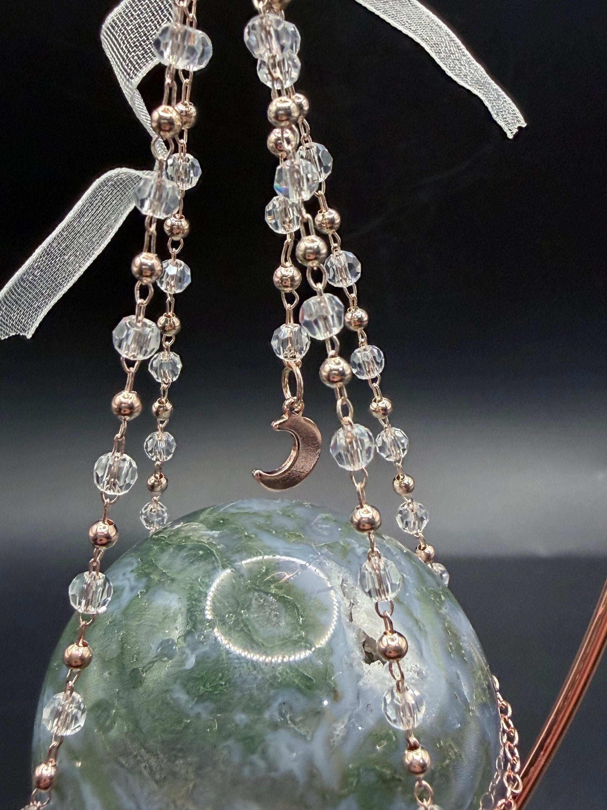 Soft, elegant, and beautifully sculptural, this rose-gold hanging sphere display stand is designed to create a graceful floating effect for your favourite crystal spheres. The warm rose-gold tone adds a romantic, luxe feel, making it a stunning feature piece for any space.