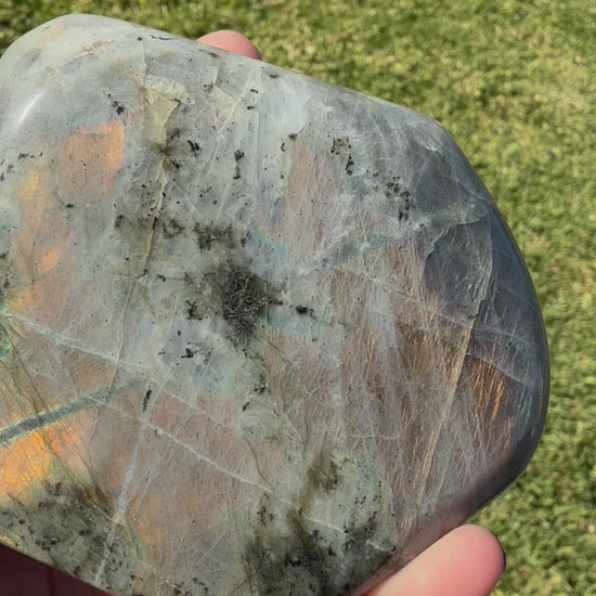 This gorgeous Labradorite freeform bursts with intense orange, gold, and copper fire flash—a rare and highly sought-after colour that looks like glowing embers under the sun. The flash spreads across the stone beautifully, shifting into soft rainbow tones as you turn it.
