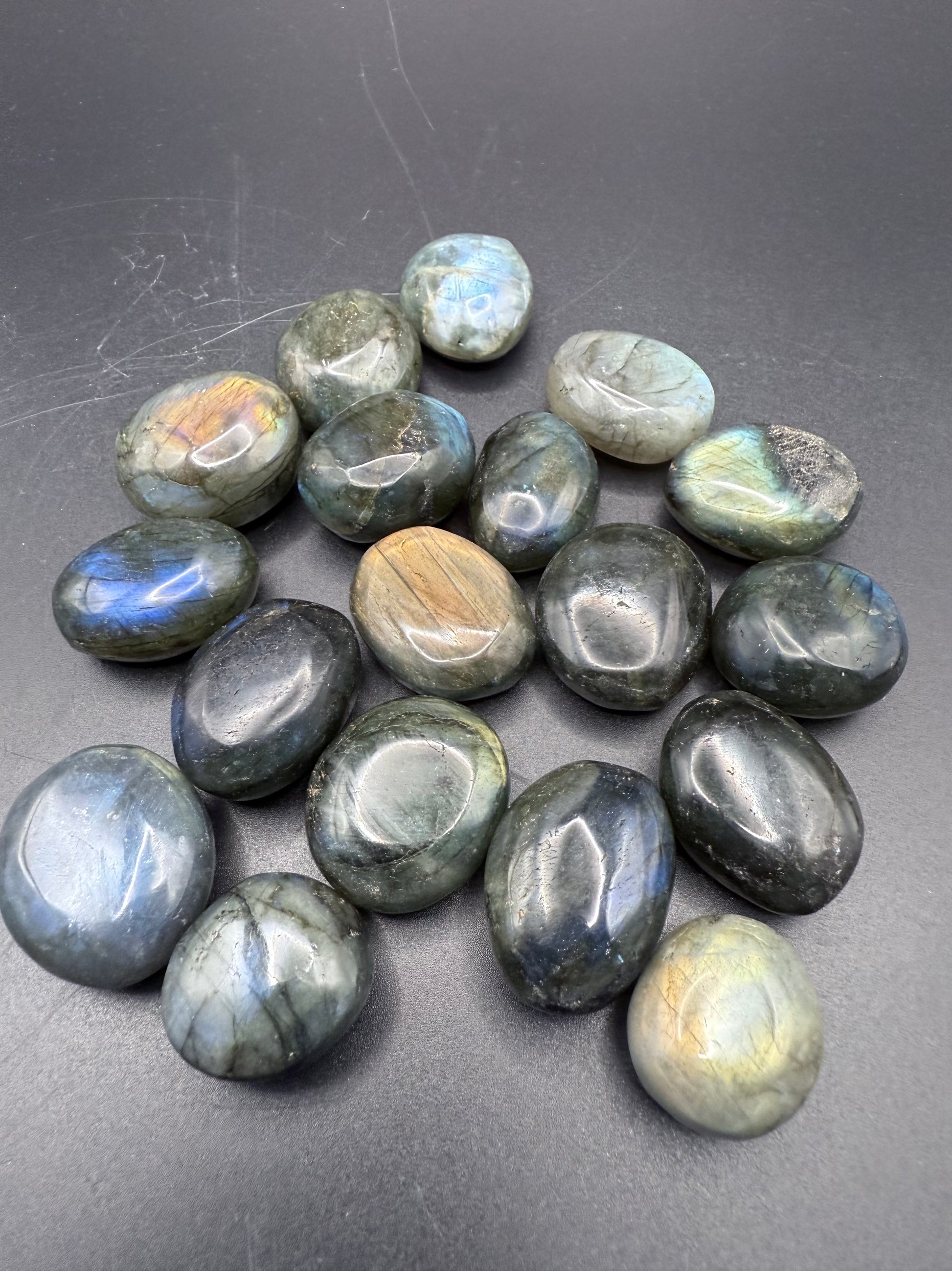 These polished Labradorite pebble stones are filled with stunning flashes of blue, gold, green, and even rainbow tones when caught in the light. Each piece is smooth, rounded, and perfect for holding during meditation, carrying with you, or placing on your altar.